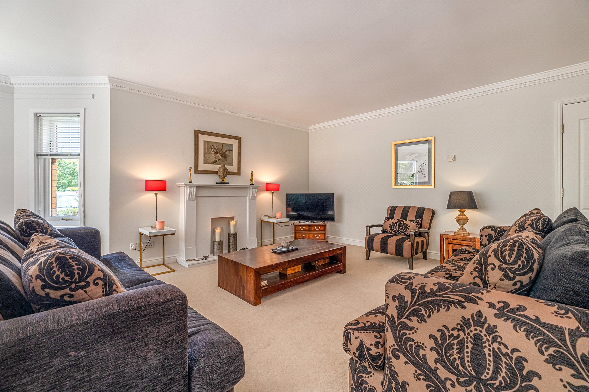 - Magnificent main lounge with five section bay window, ceiling cornice, focal point fire surround and double-glazed door to private balcony