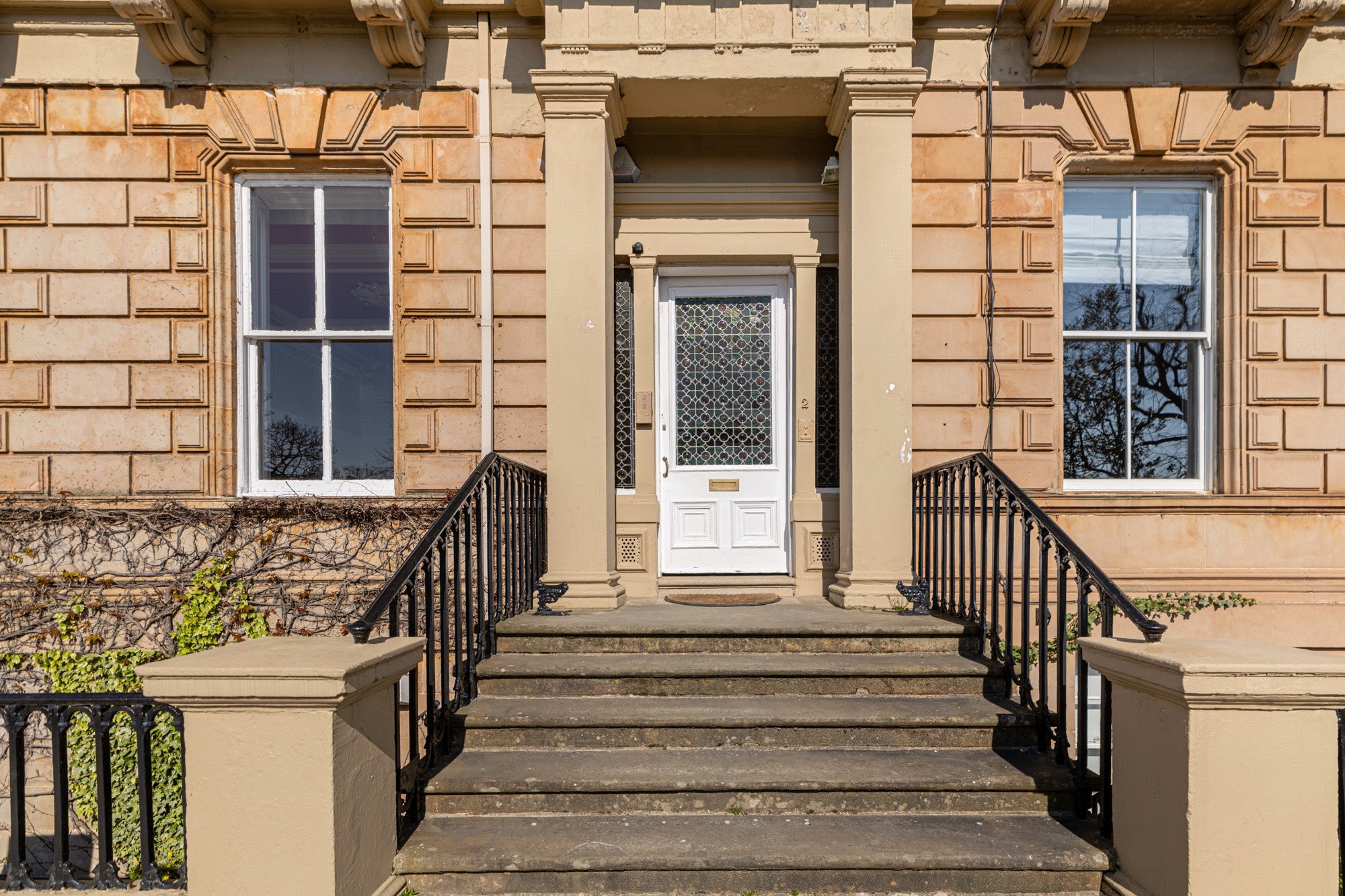 - Broad stone steps lead up to the entrance to number 2 Kirklee Terrace.