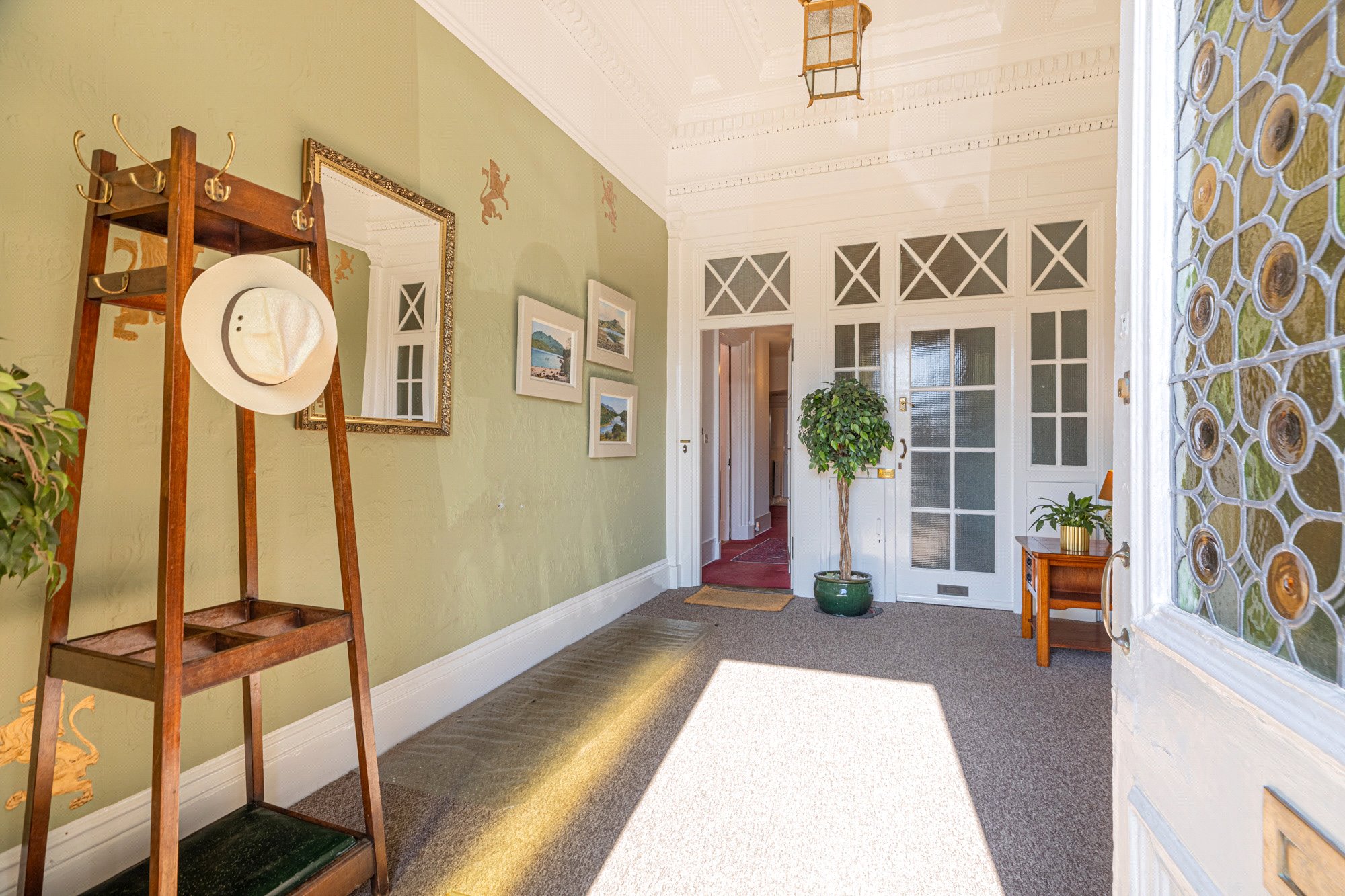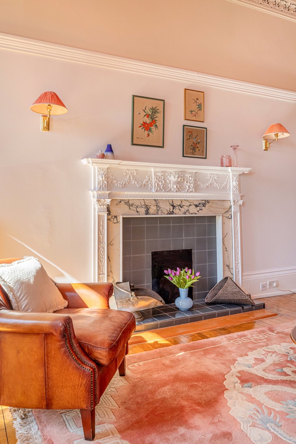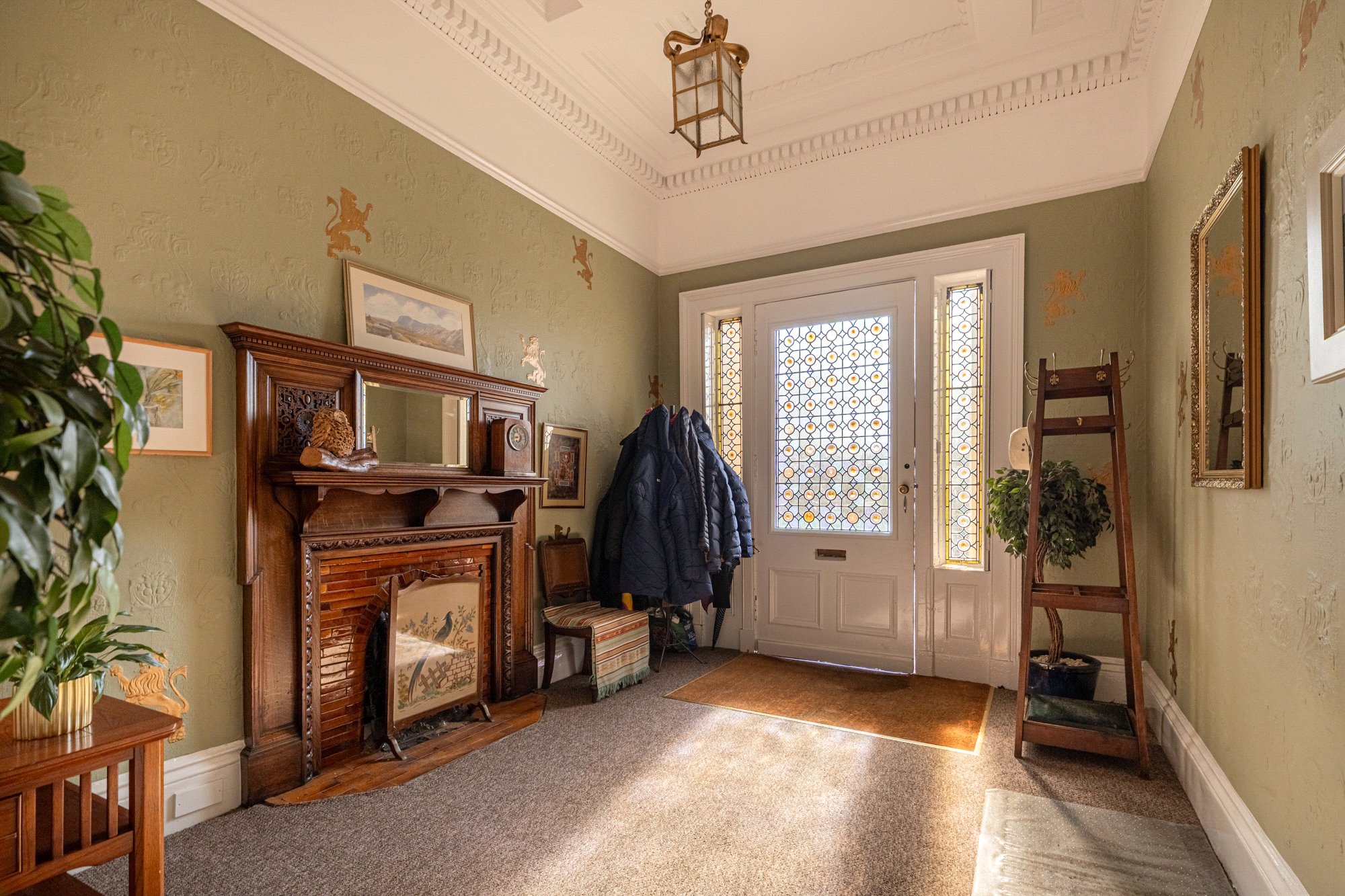 - Communal ground floor hallway, entered through a stunning stained/leaded glass door with adjacent panels, original hall fireplace and private door to the reception hall.