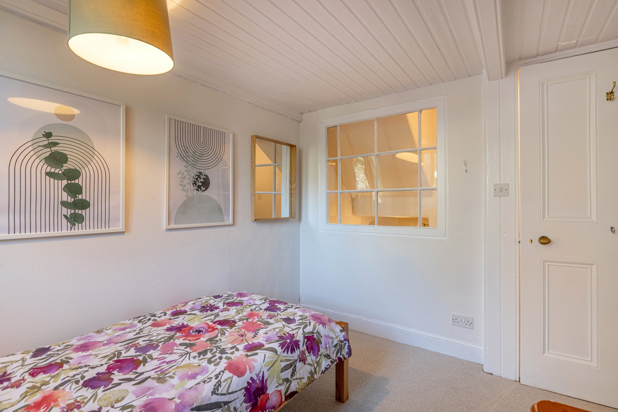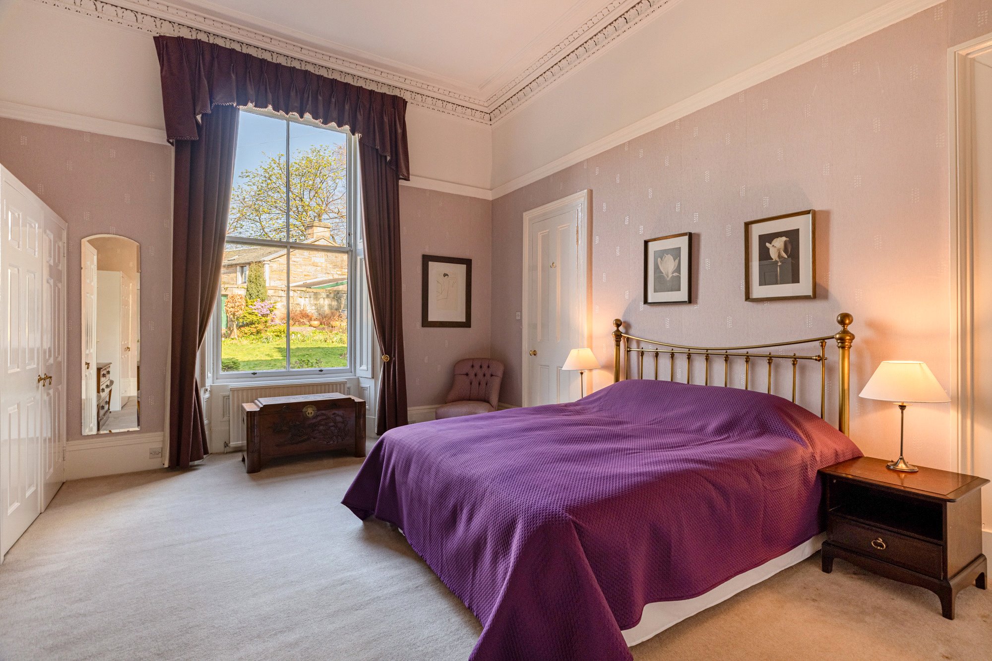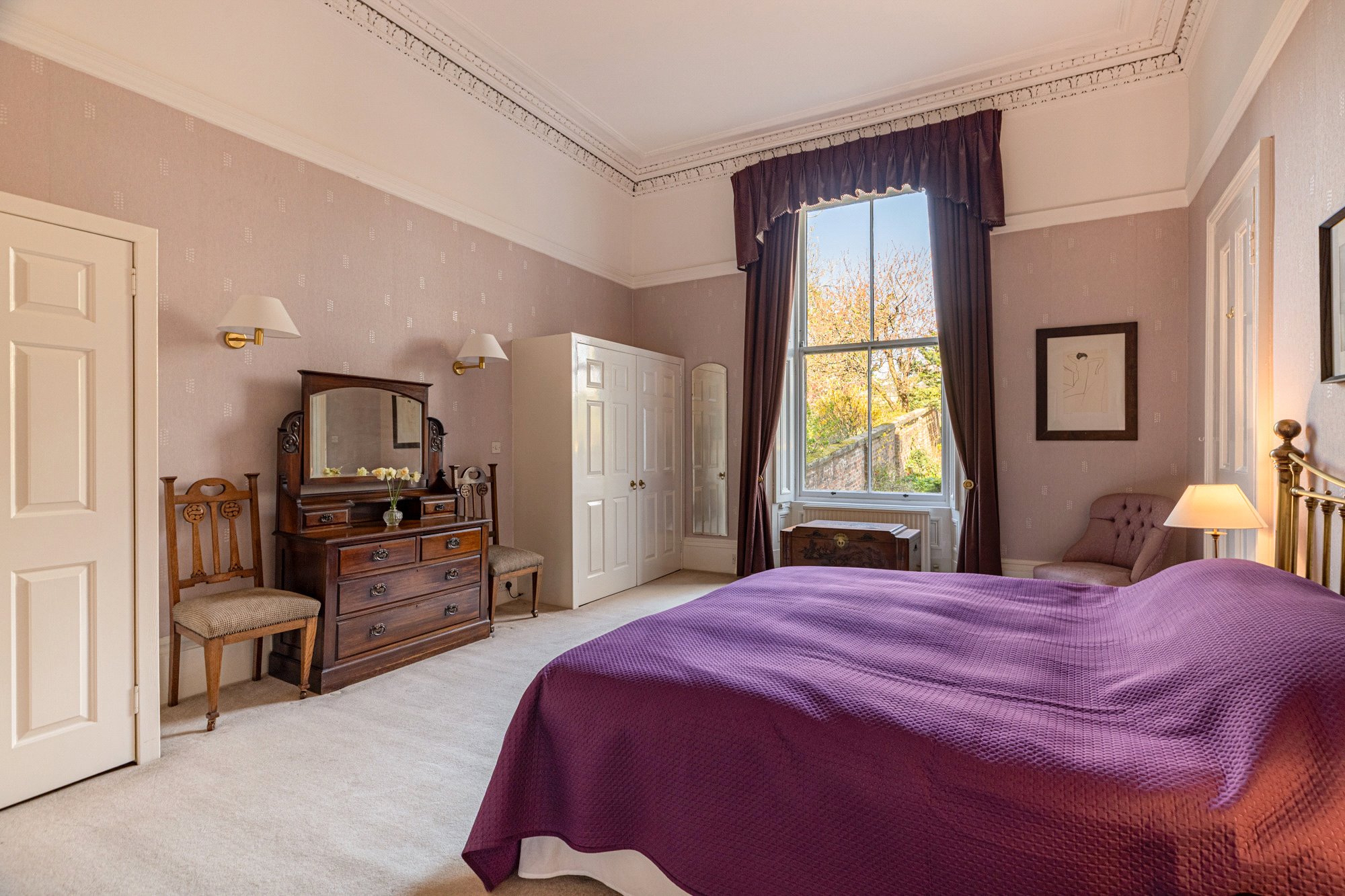 - Generous bedroom one (principal) with large window to the rear, built-in wardrobes and ornate ceiling cornice.