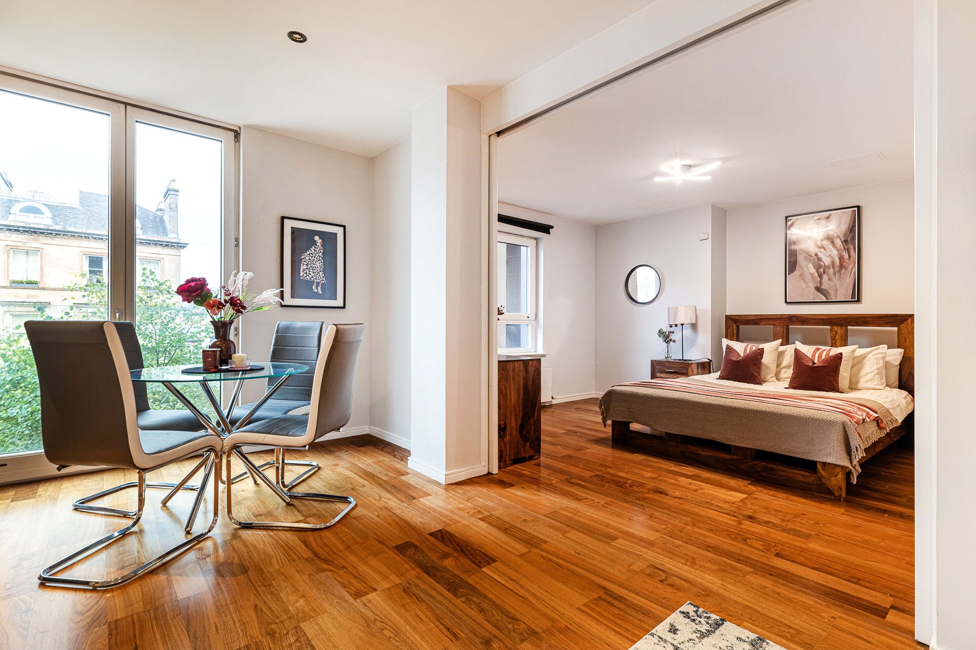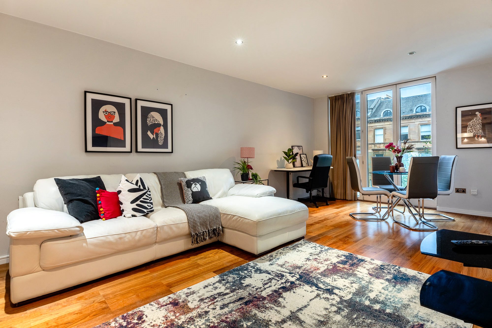 A very stylish and spacious modern one-bedroom luxury apartment on the second floor of ‘Park House Reborn’ - a landmark development in Park Circus completed in 2008 by Messrs Noah. As one of the larger style apartments within the development this particular flat has the huge added appeal of having Park Circus. The accommodation is bright and well-proportioned to include an impressive open plan living/dining/kitchen with focal point island, double bedroom and a three-piece bathroom. Park Circus is a popular residential location sitting between the West End and City Centre. Commuter links are first class, and it is exceptionally well placed to enjoy an enviable selection of shopping, bars and restaurants together with the nearby Kelvingrove Park.