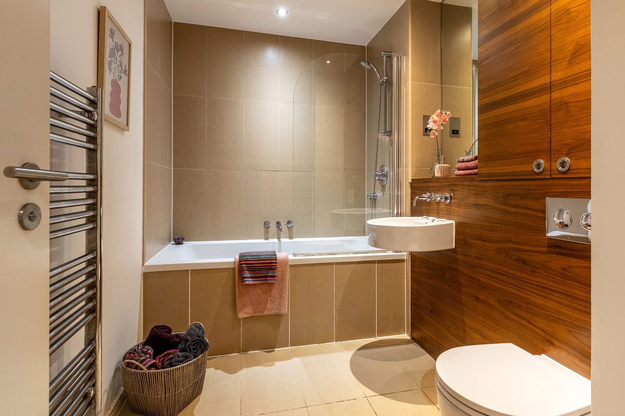 - Stylish modern bathroom with three-piece suite and over bath shower.