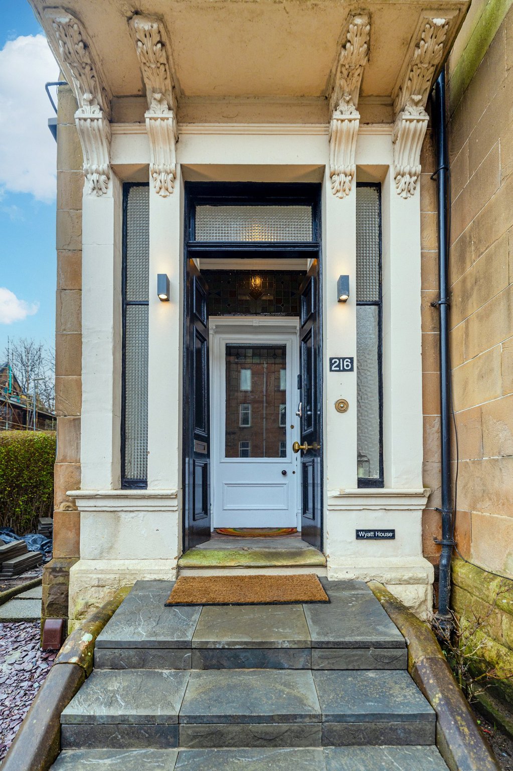 An imposing “B – Listed” late-Victorian semi-detached villa, 216 Broomhill Drive occupies a prominent and highly sought-after position within Glasgow’s West End, offering substantial and wonderfully adaptable family accommodation across three expansive levels. Constructed of blonde sandstone beneath a traditional pitched slate roof, the home instantaneously impresses with its distinctive architectural presence; defined by a striking bow fronted elevation and a characteristic square tower projection rising above the entrance.