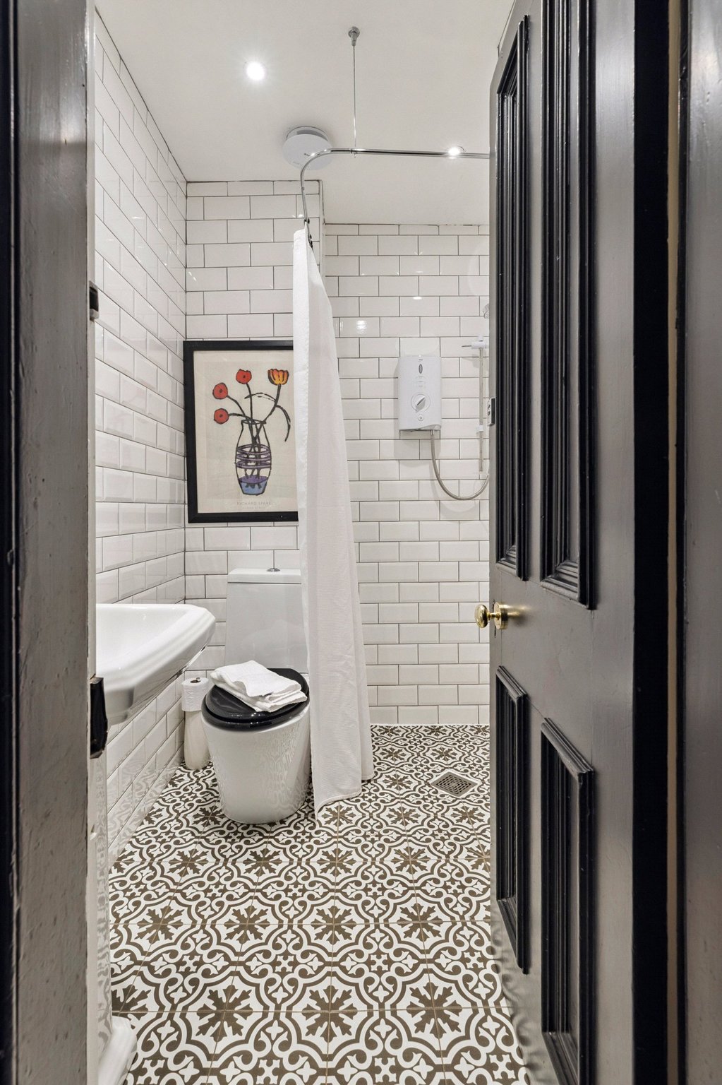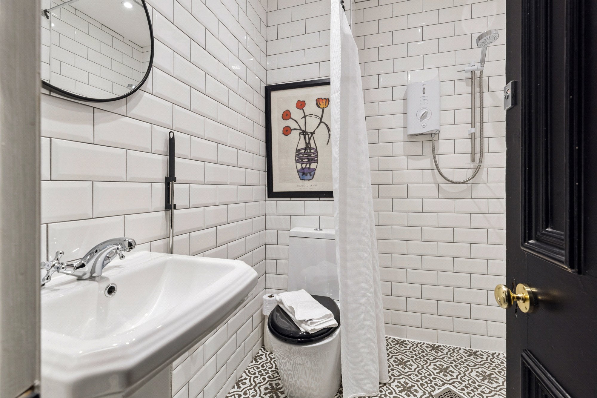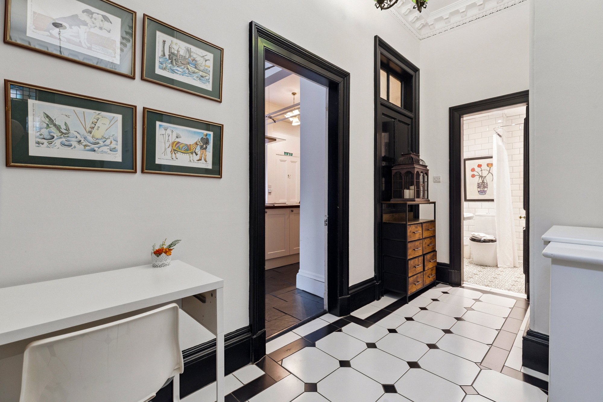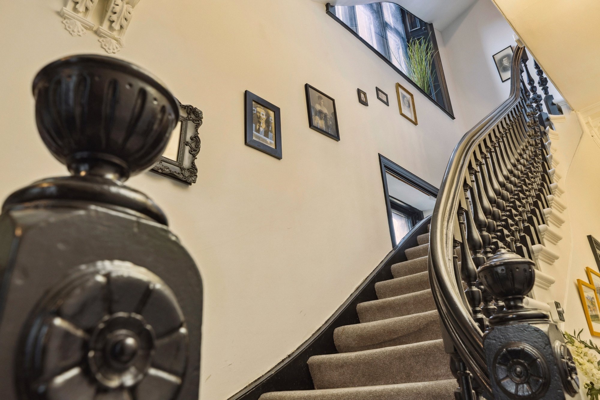 The upper levels continue to impress, with four beautifully proportioned bedrooms arranged across the first floor, each benefiting from high ceilings, large windows and charming period detailing. A well appointed family bathroom serves this level. The staircase then rises to the top floor where the impressive square tower creates a wonderfully distinctive and adaptable principal suite enjoying a lovely outlook. A dedicated dressing room, ensuite shower room and “snug” located within the tower round off a spectacular arrangement. The house has a private rear terrace, a rare and highly prized accolade within this urban setting, and residents also enjoy access to a communal garden situated at the top of the hill.