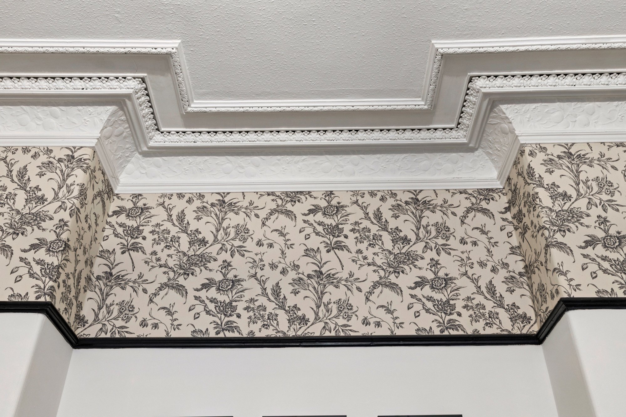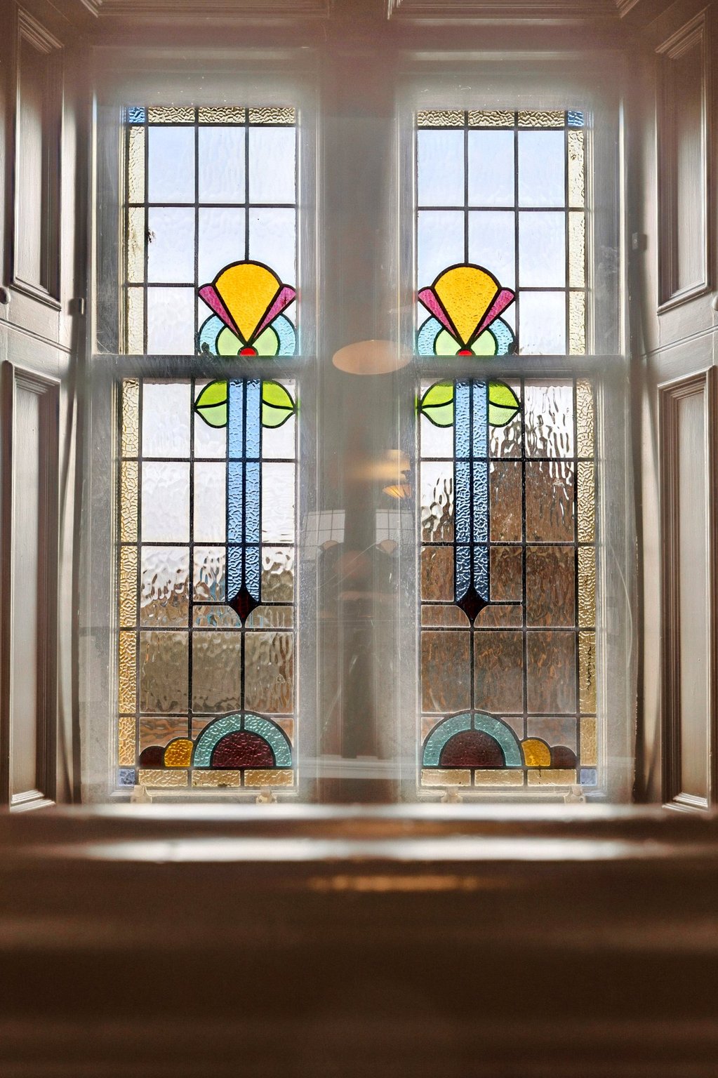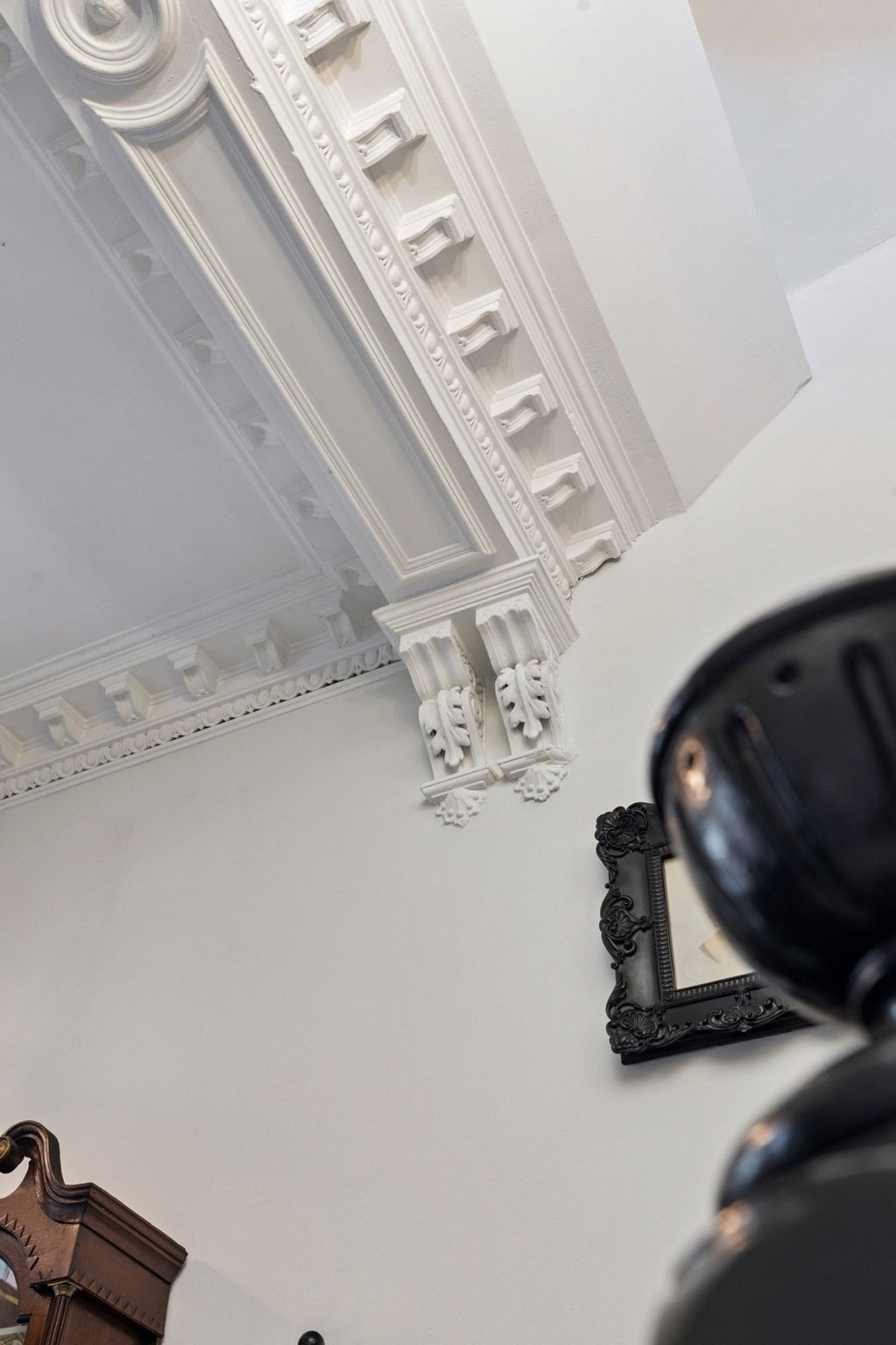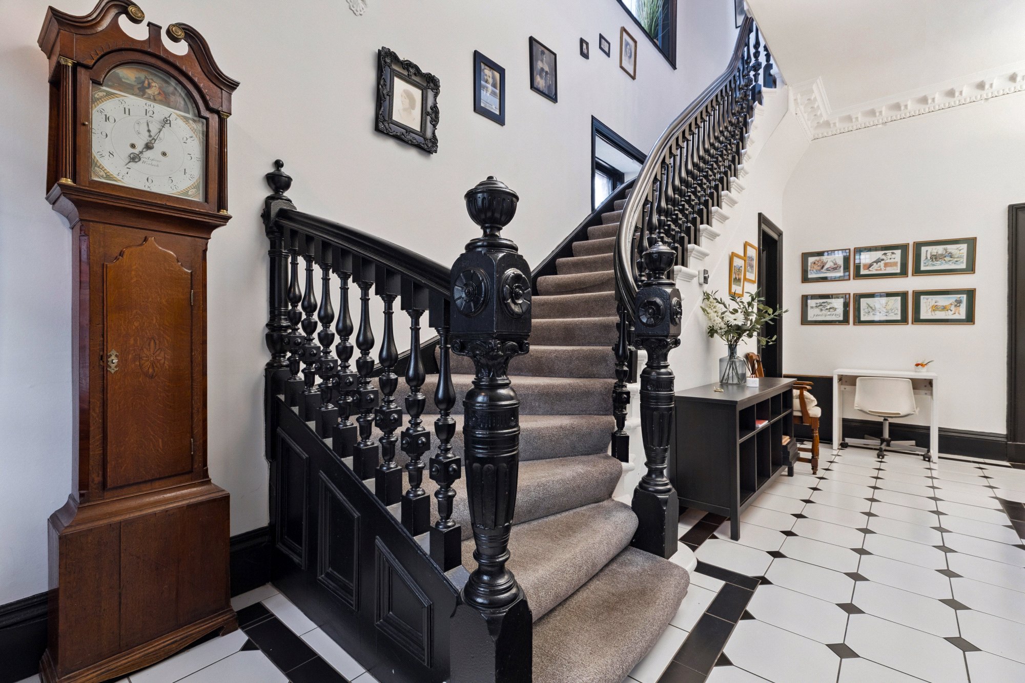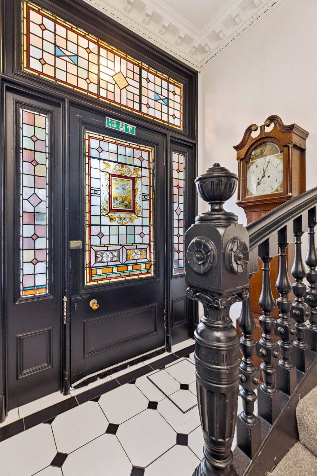 - Alluring reception hallway featuring stained glass doorway, with ceiling cornice, stairway to upper levels with traditional balustrade and storage off.