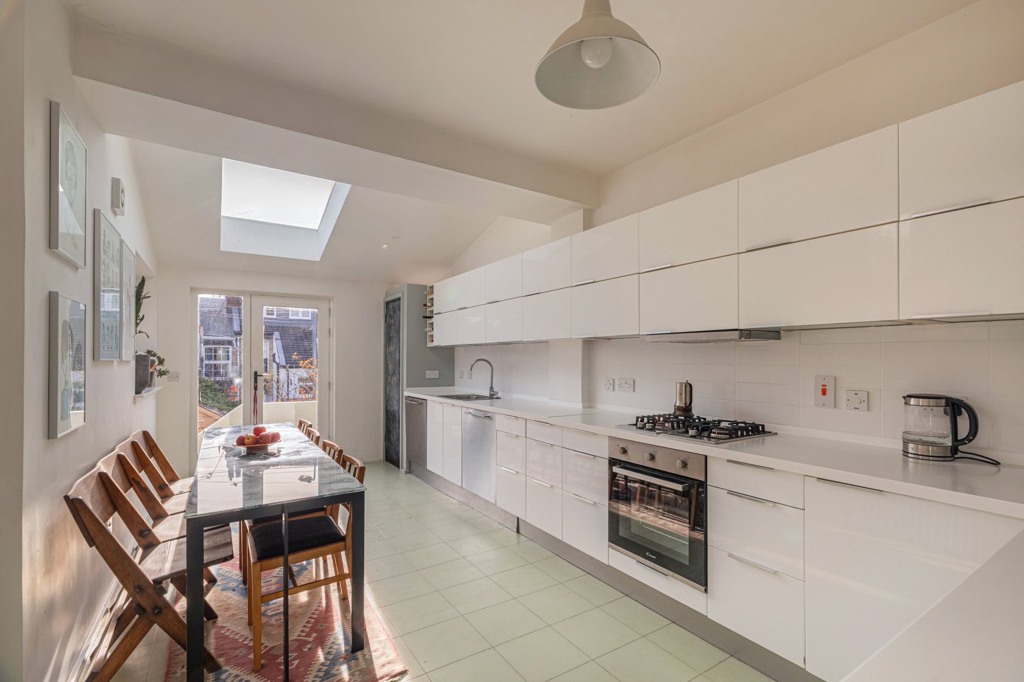 - Fabulous, bright dining kitchen with two section window to the side, a further window to the side and a glazed door with adjacent glazed section to the rear. Generous storage units, worktops, appliances and a rooflight window bringing further daylight.