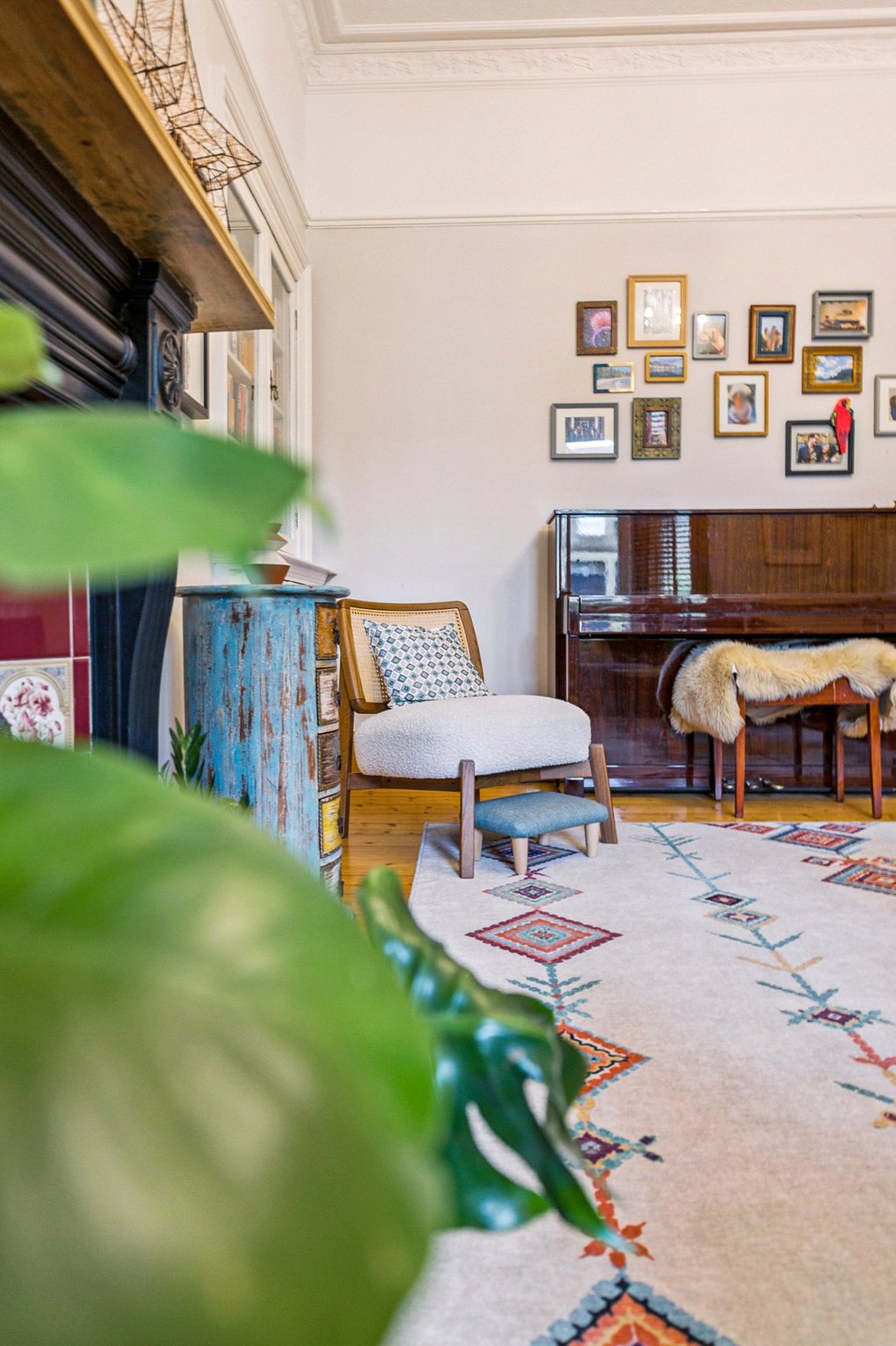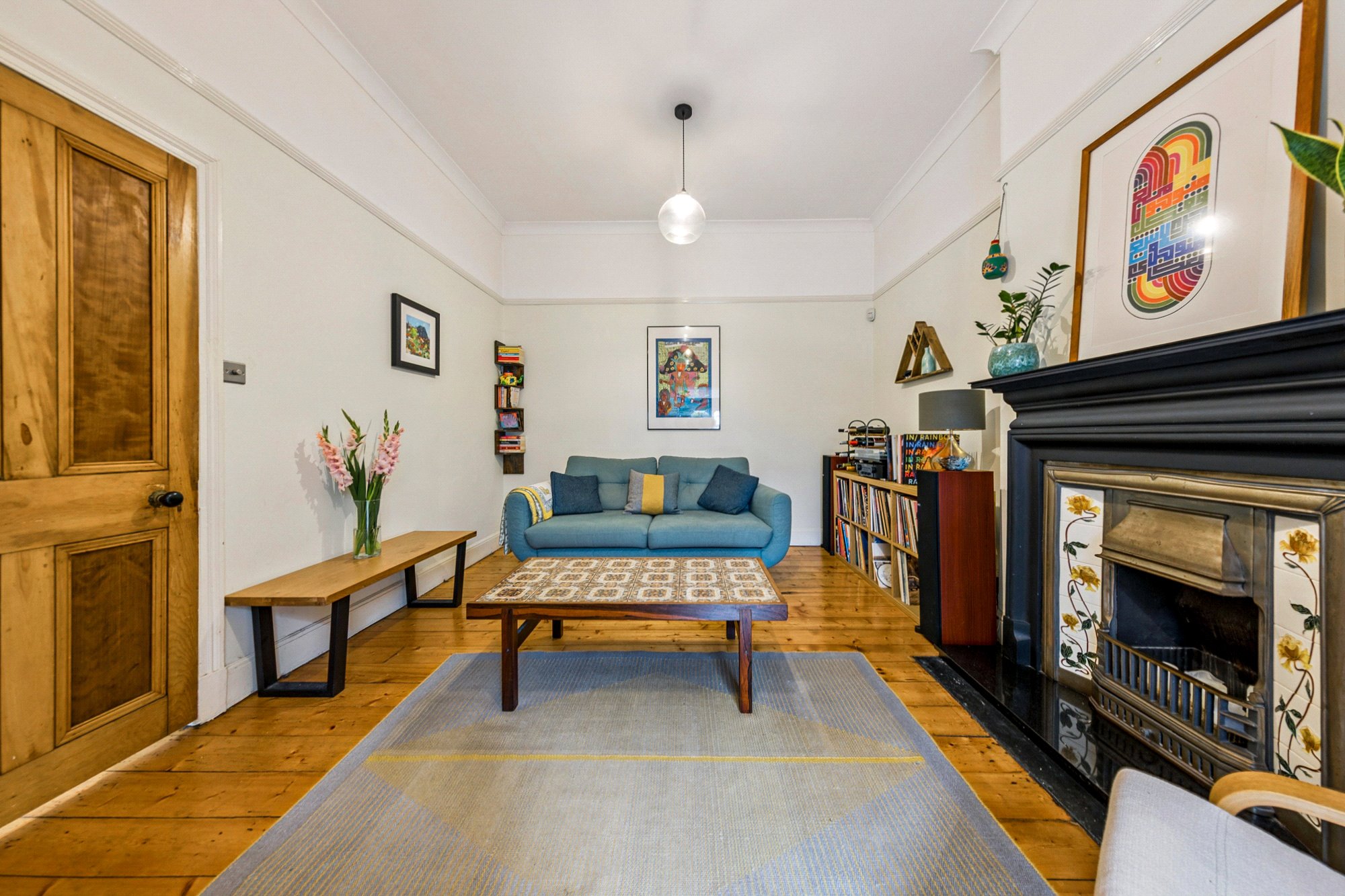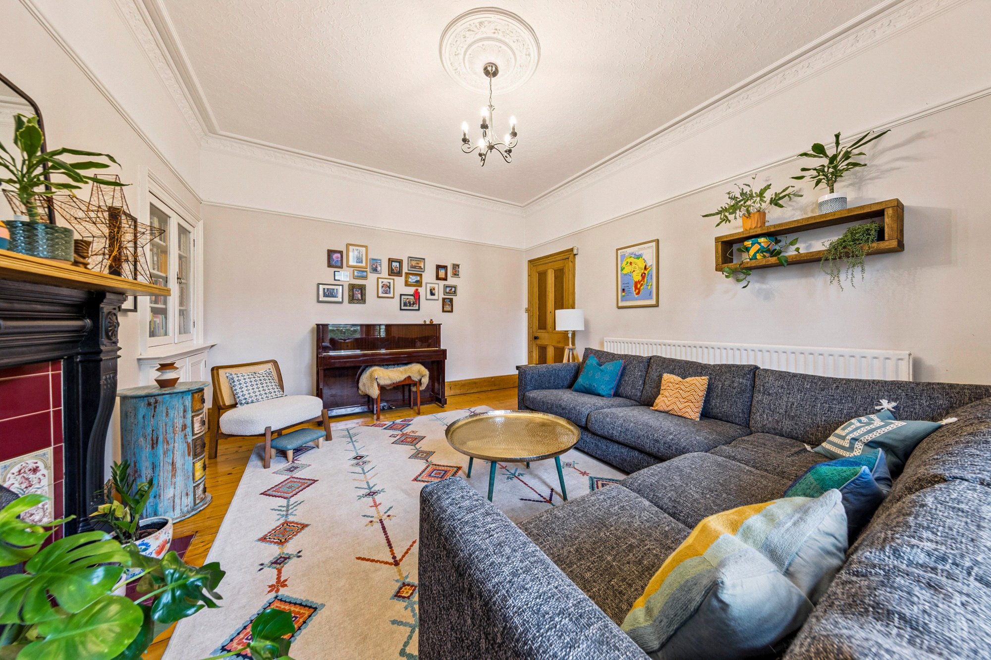 - Beautiful front lounge with broad bay window and timber shutters, original cornice, and floral tiled focal gas fireplace.