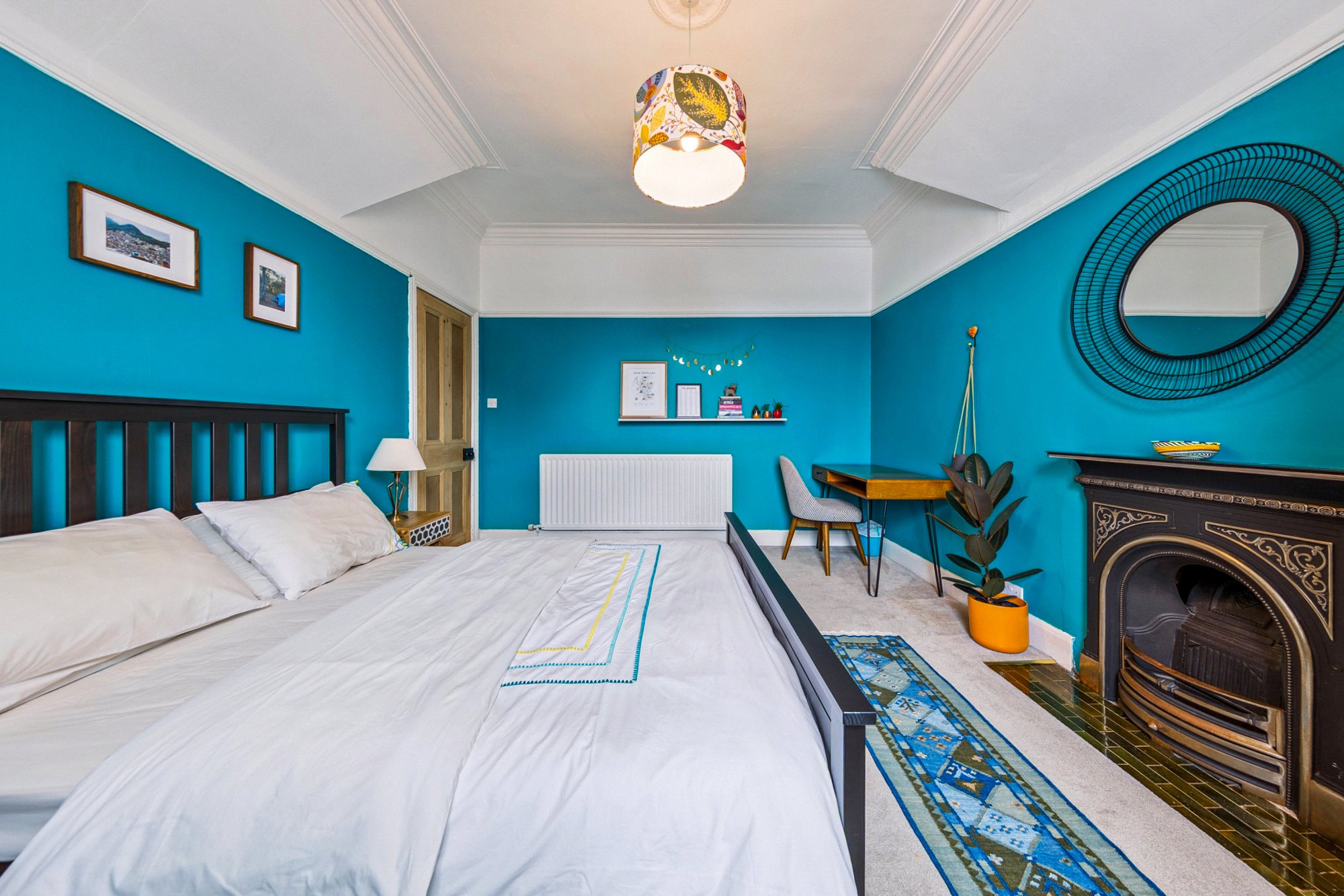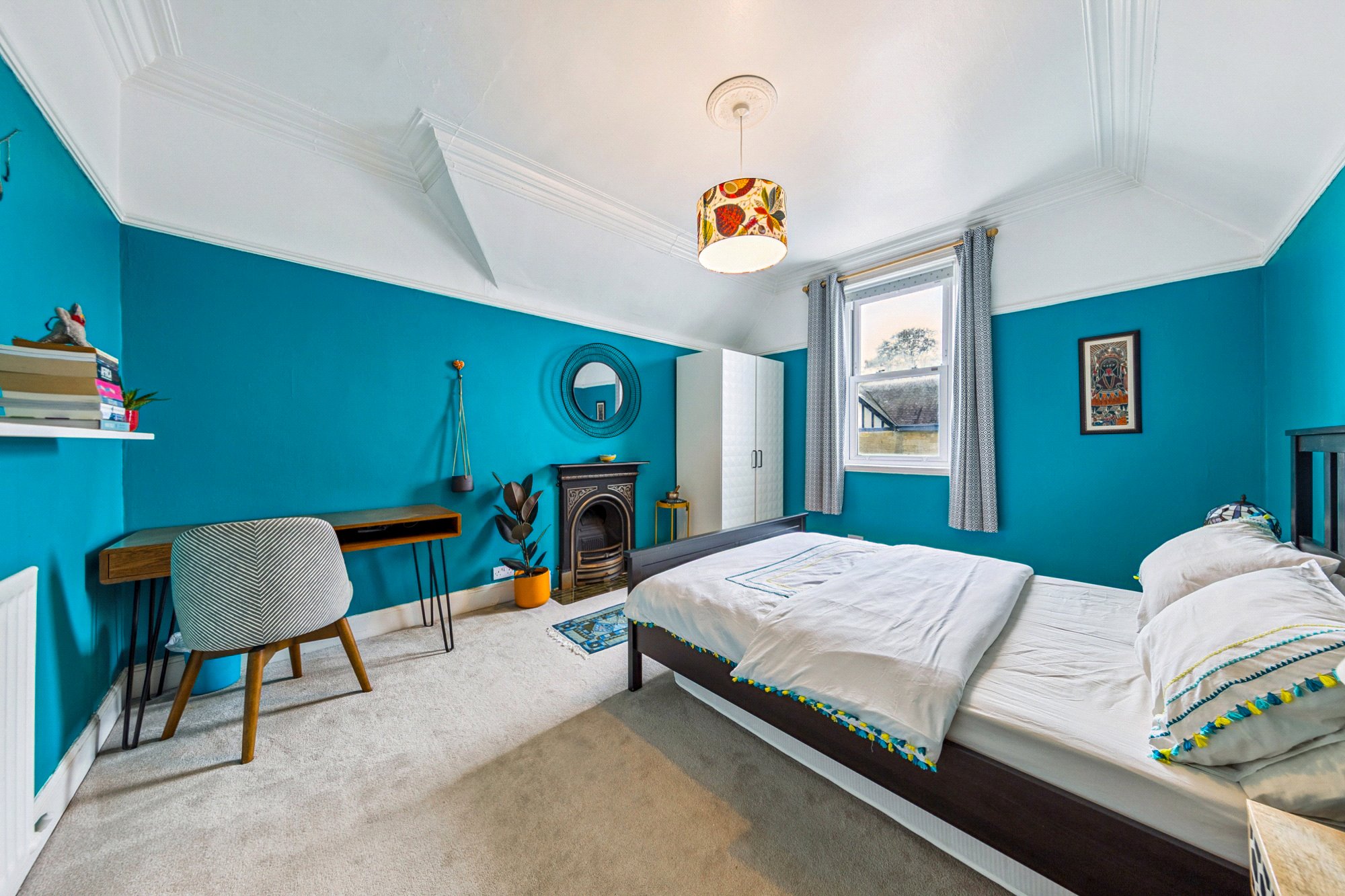 - Principal (main) bedroom with bay window to the front and window shutters.