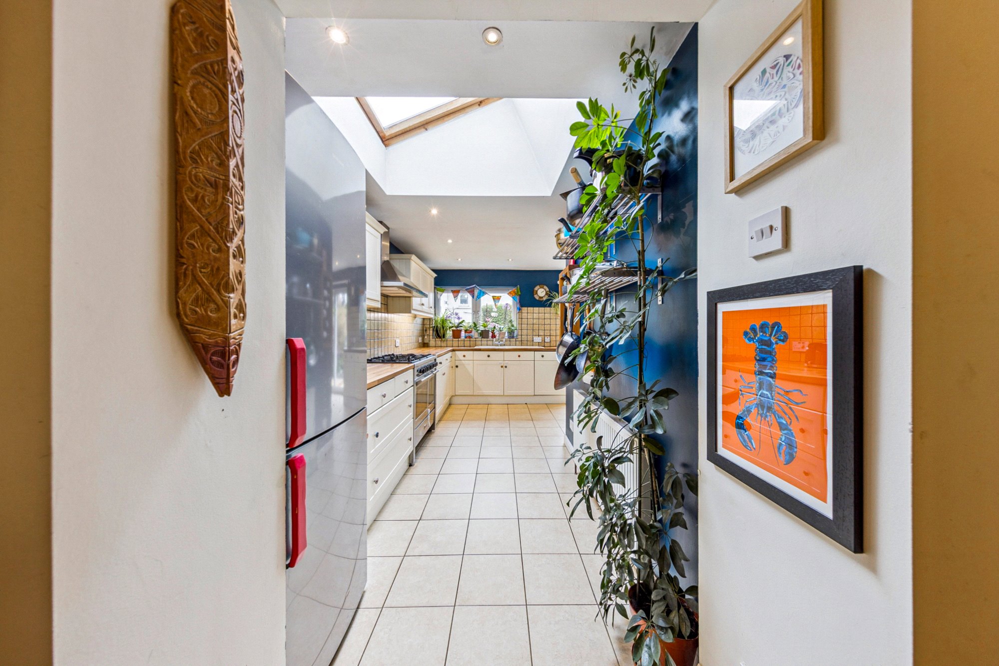 - Lovely fitted kitchen with butcher’s block counter tops, double section ceramic sink, range cooker and large skylight.