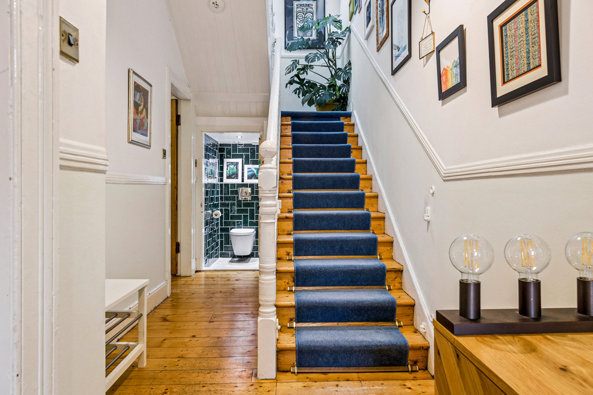 - Welcoming entrance hallway with wooden flooring, stairway to upper level and under stairs storage.
