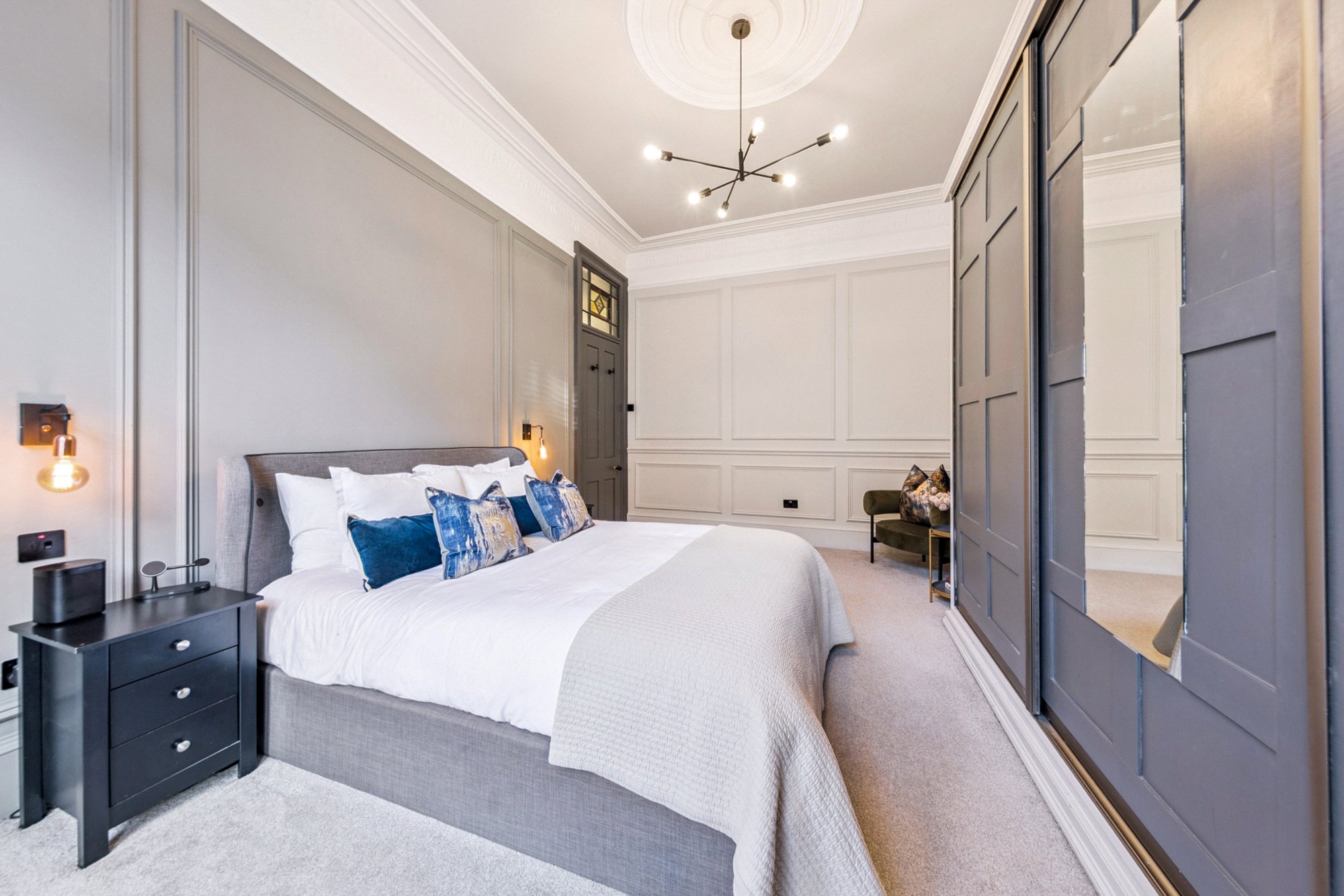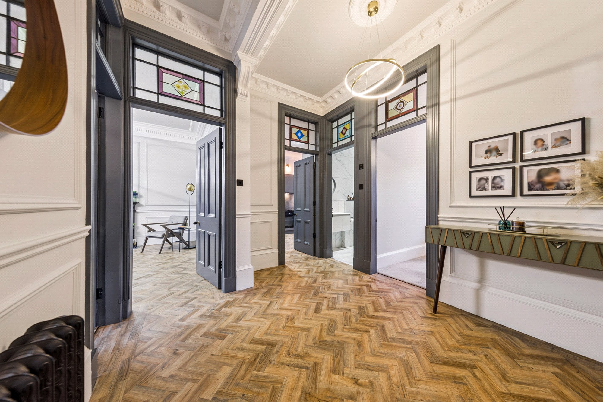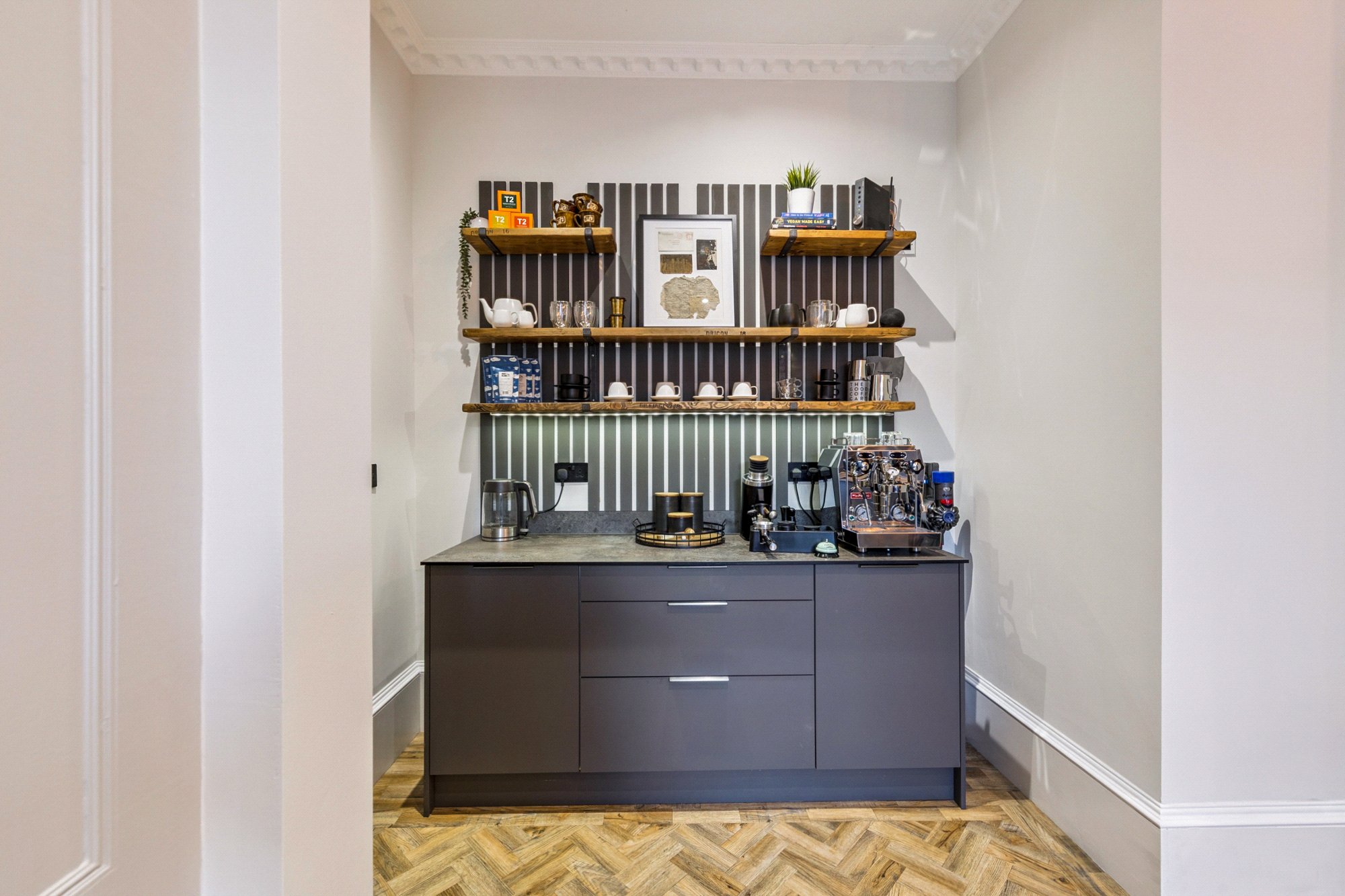 There are simply too many features and selling points to list, and buyers are encouraged to visit the property in person to fully appreciate the substantial accommodation and exceptional level of presentation which sets this apartment apart from other comparable examples. In brief, the accommodation extends to a broad reception hall, an elegant bay-windowed living room, and a superb dining kitchen fitted with sleek contemporary units, a full complement of integrated appliances, stylish LED lighting and — the pièce de résistance — a fully formed tea and coffee station. This thoughtful addition presents a daily dilemma: make your own coffee and stay at home, or nip down to Blank Street Coffee or Starbucks at the end of the street — a wonderful problem to have.