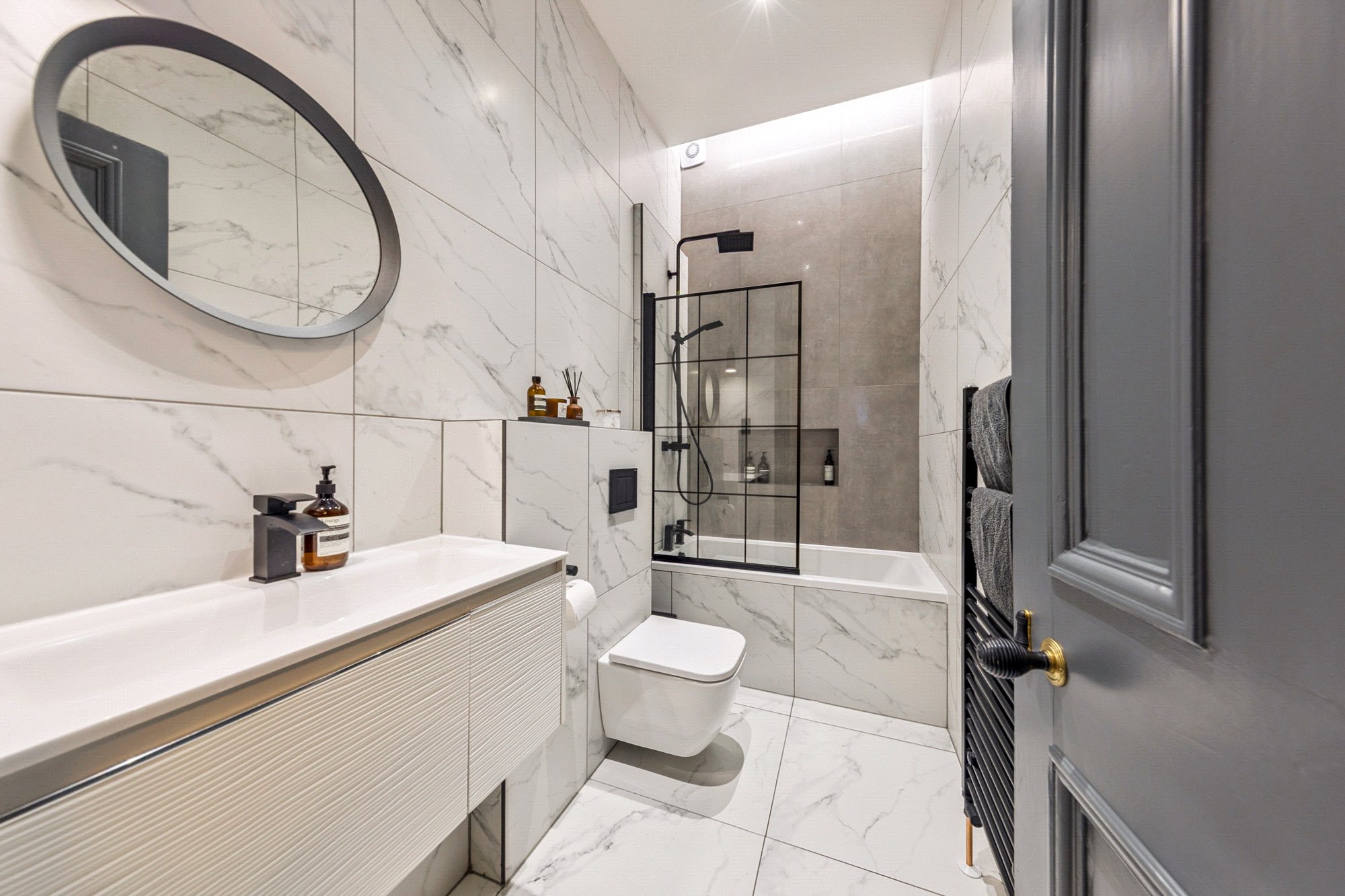 The property offers three bedrooms, including two king-sized rooms and one double. The principal bedroom is extremely comfortable and benefits from in-built wardrobes, while the rear-facing king-sized bedroom provides access to a high-specification en-suite shower room, finished with elegant grey tiling and refined matte black fixtures and the double-sized third room has been successfully used as a twin home office space by the current owners - demonstrating the flexibility of such a living space. The main bathroom is just as impressive, featuring matte-finish marble-effect tiling, a contemporary white suite, including a beautiful wash-hand basin set into a vanity unit, and again complemented by matte black fittings.
