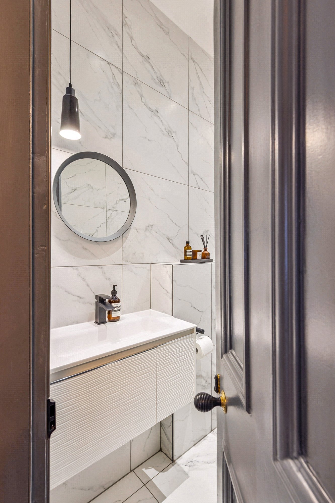 • Luxurious main bathroom with marble-effect tiling and vanity unit