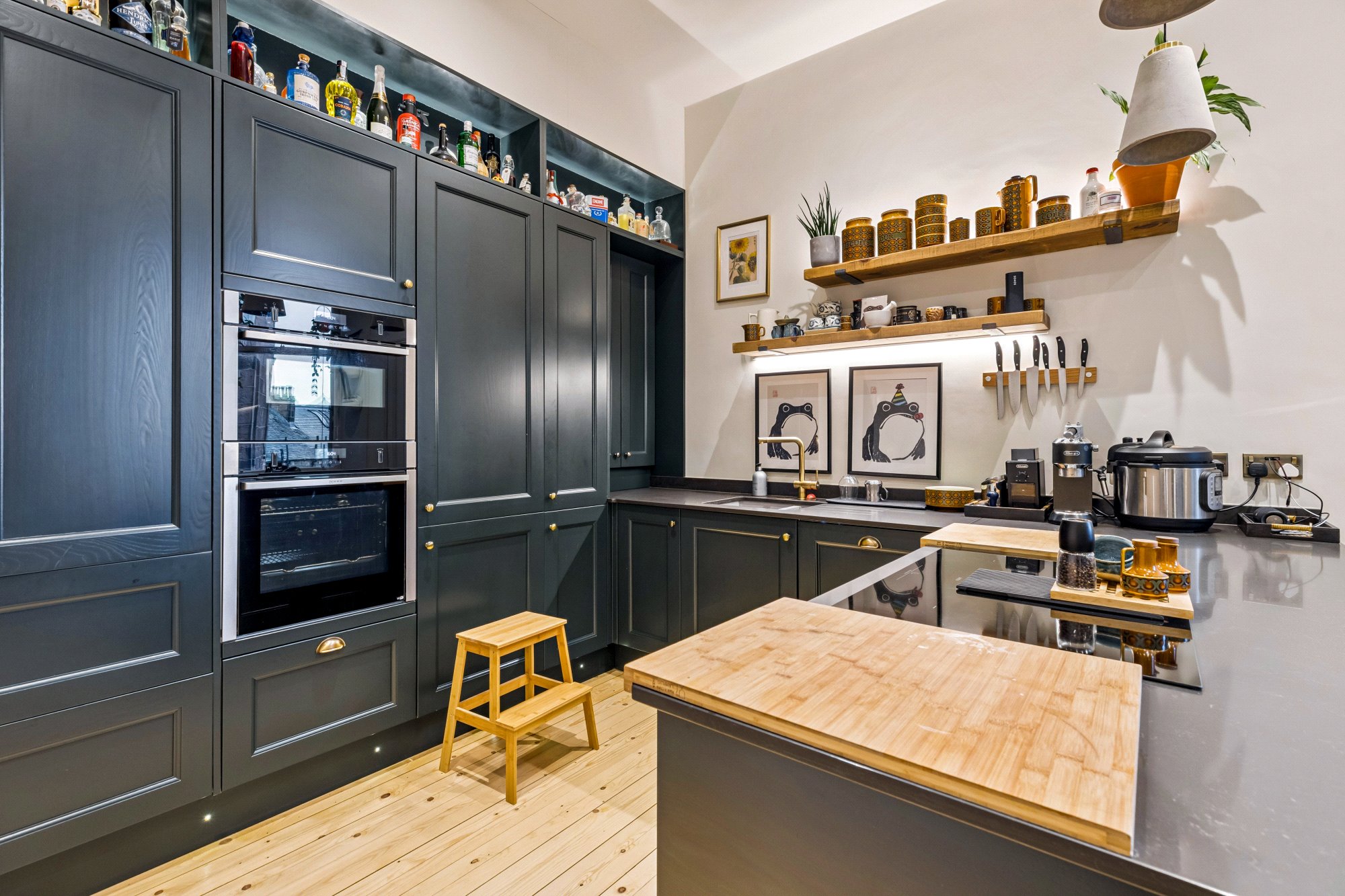- Bespoke fitted kitchen featuring dark green cabinetry, black granite worktops, breakfast peninsula with pendant lighting, integrated Neff appliances (including oven and “3-in-1” micro-oven-grill), Franke tap, “pop-out” baking cupboard, window seat, and coffee station.
