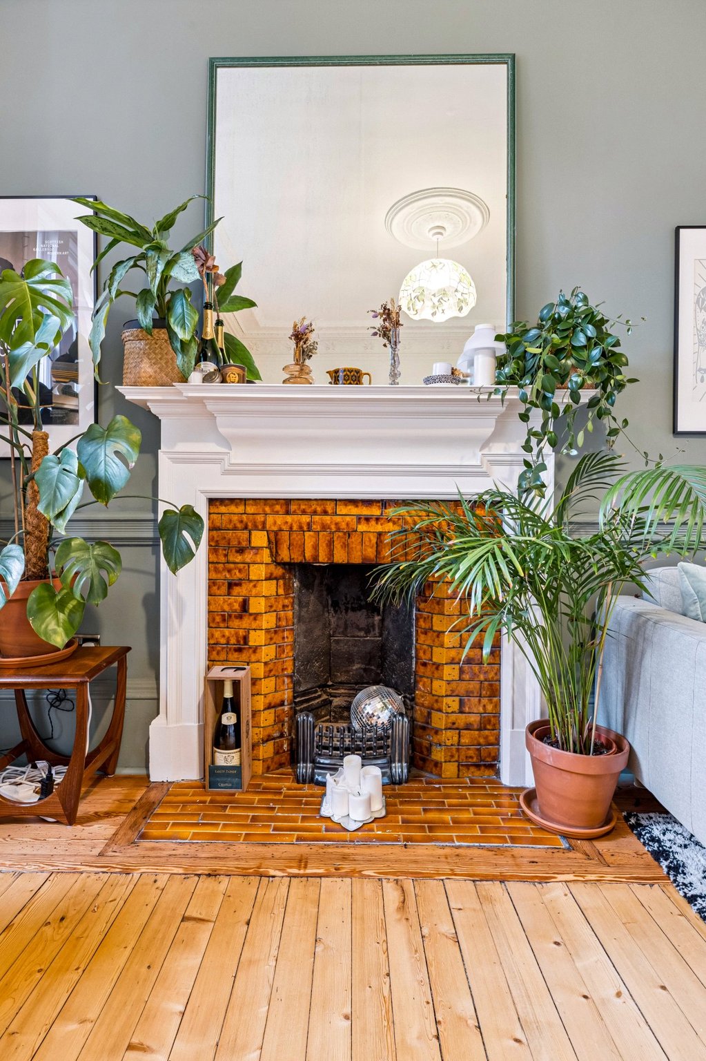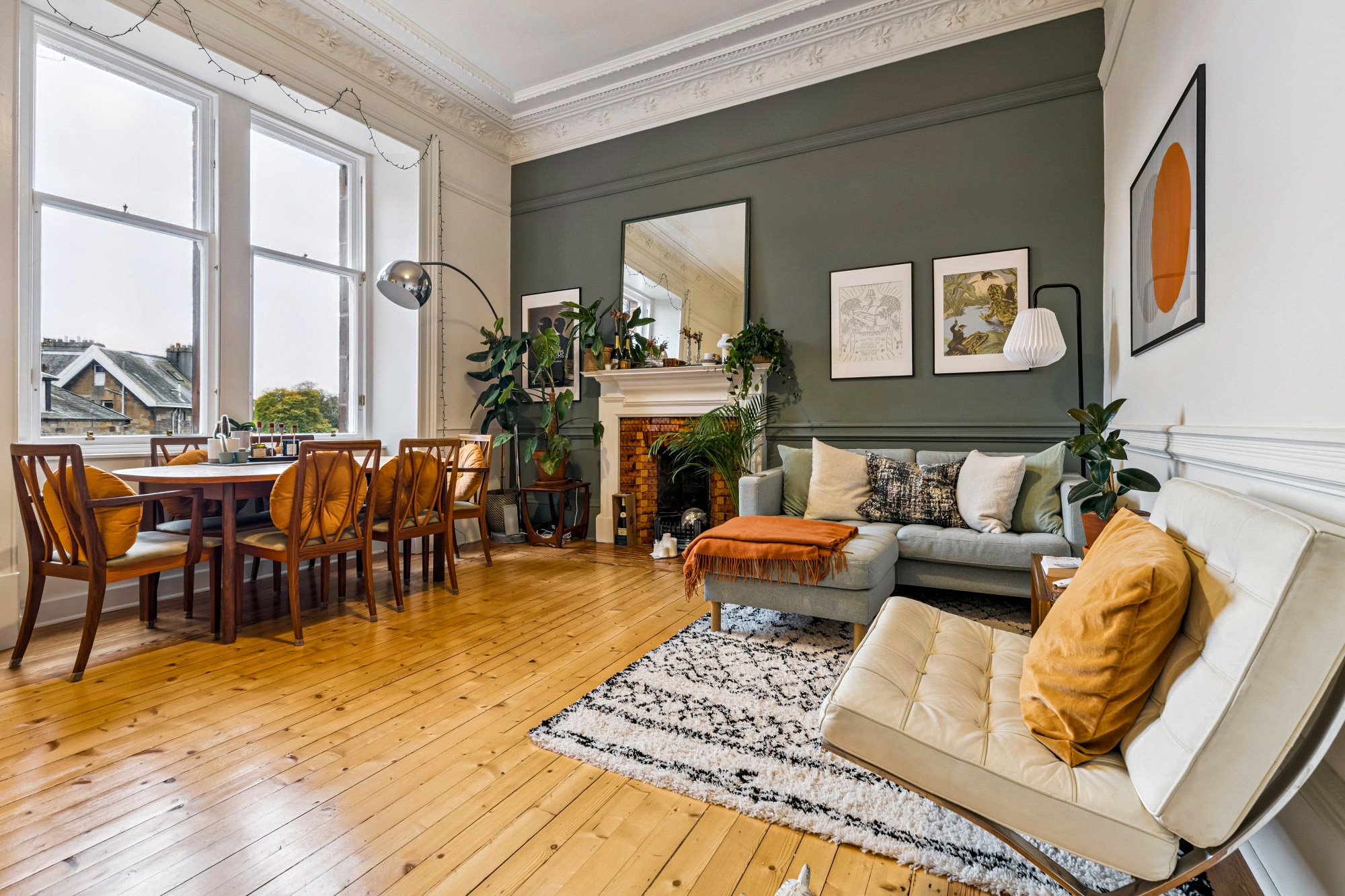 - Front lounge with traditional wooden flooring, decorative cornicing, cast-iron fireplace, and three-section bay window with open views towards the Botanic Gardens.