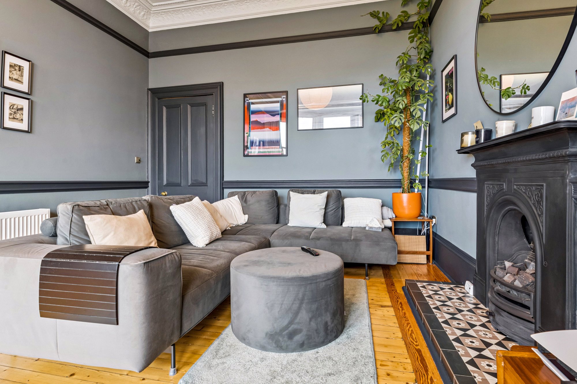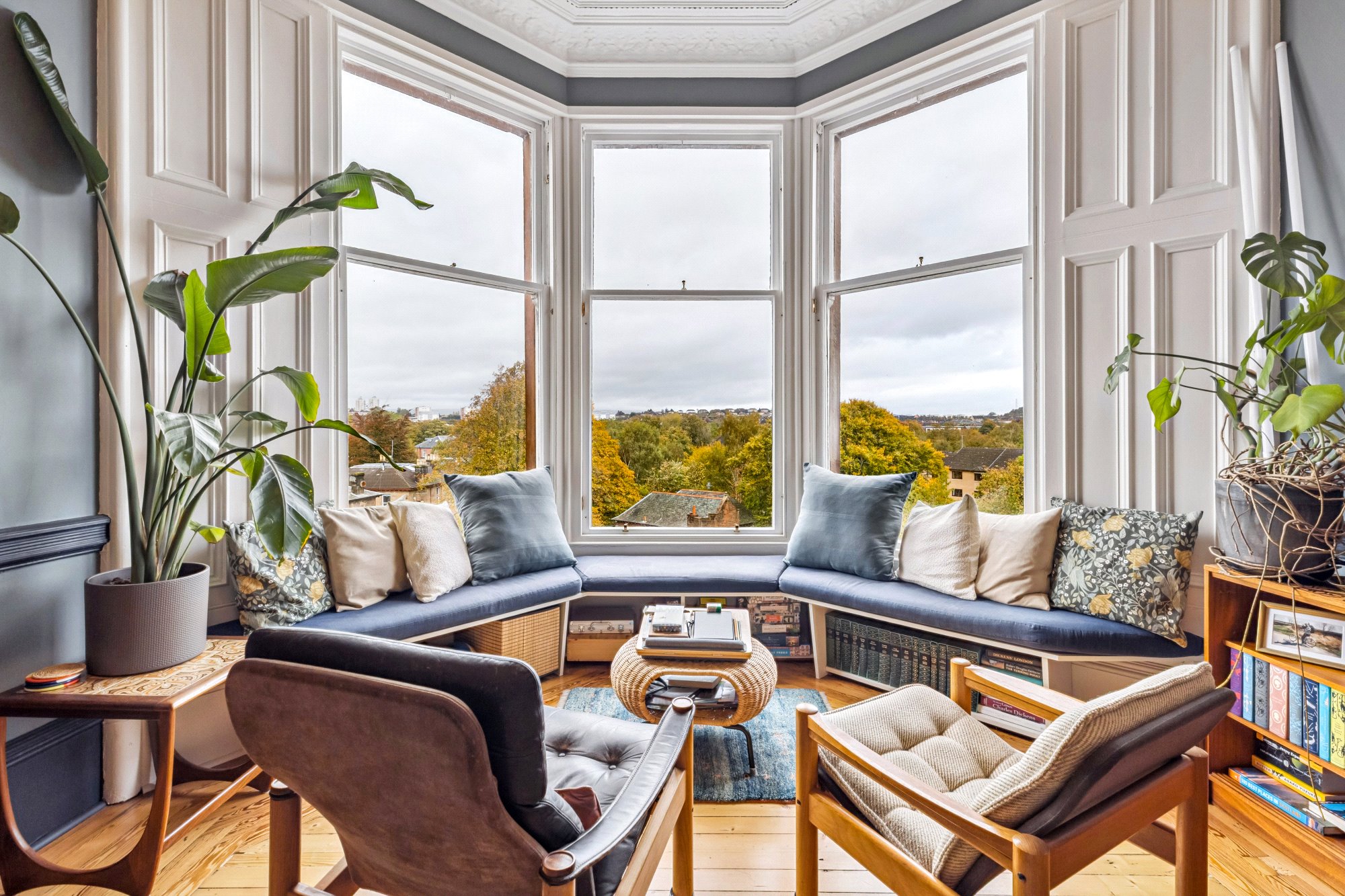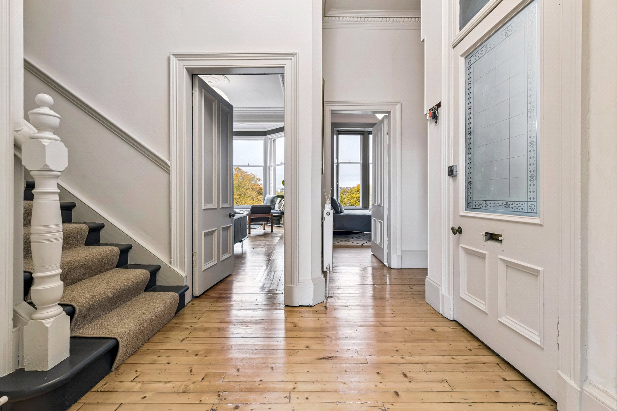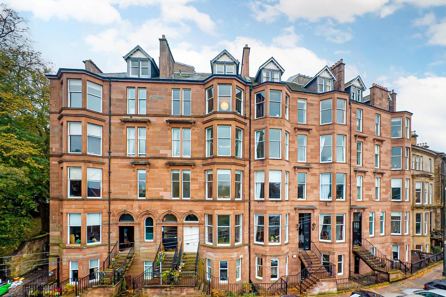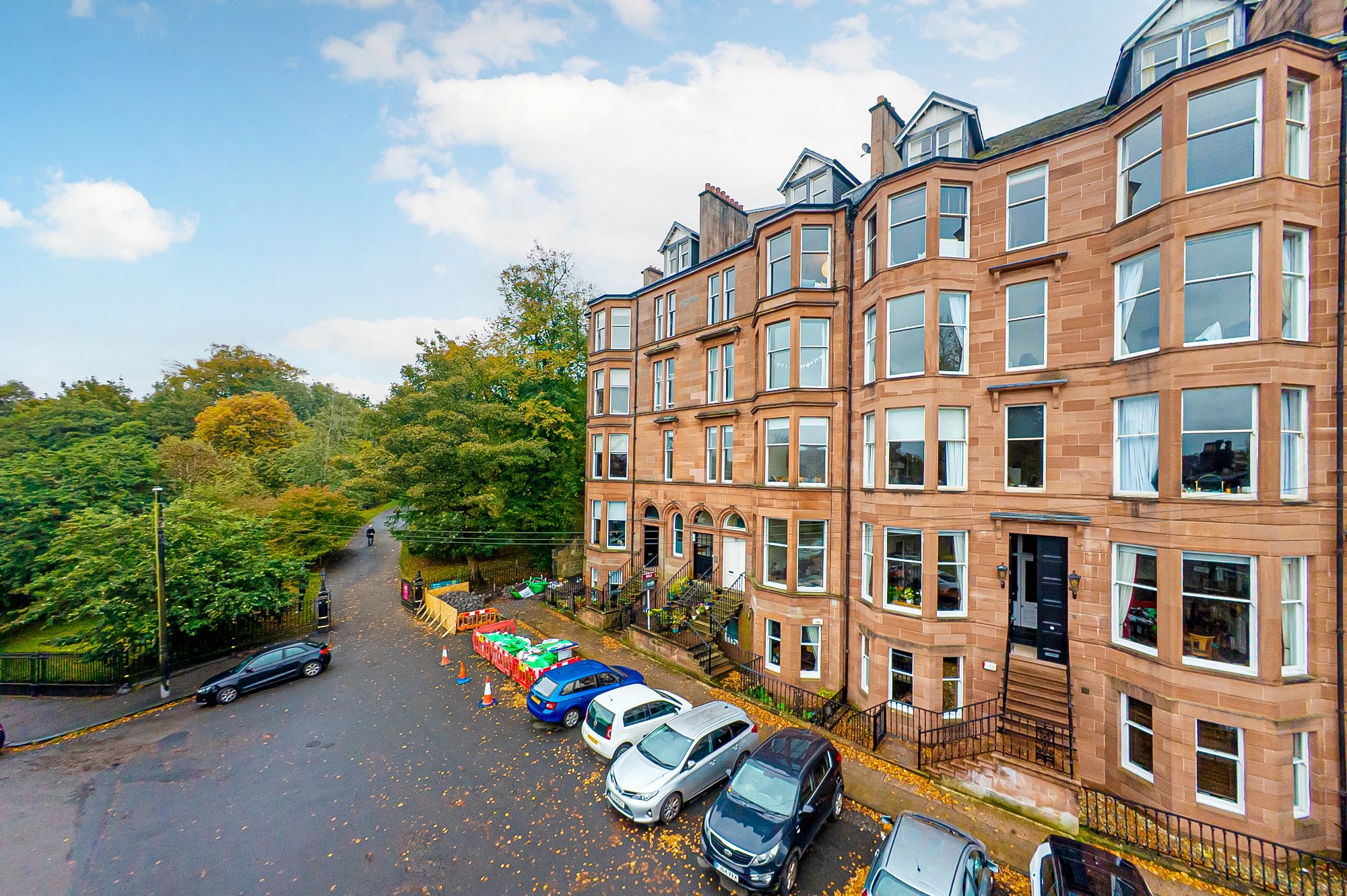 Occupying the upper levels of a distinguished sandstone tenement, this elegant duplex enjoys a privileged position in the highly sought-after Kirklee area, directly adjacent to the entrance of the Botanic Gardens on Ford Road. The property commands open, leafy views across its tranquil surroundings, offering a rare blend of period grandeur and refined contemporary living.