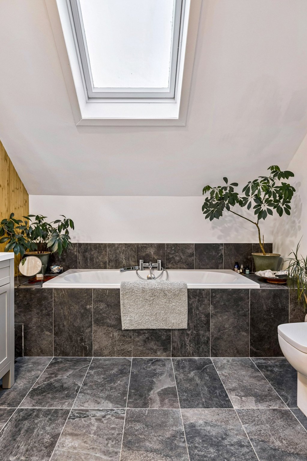 - Four-piece bathroom featuring timber panelling, separate shower, whirlpool bath, twin sinks, illuminated mirror, underfloor heating, and front-facing Velux window.