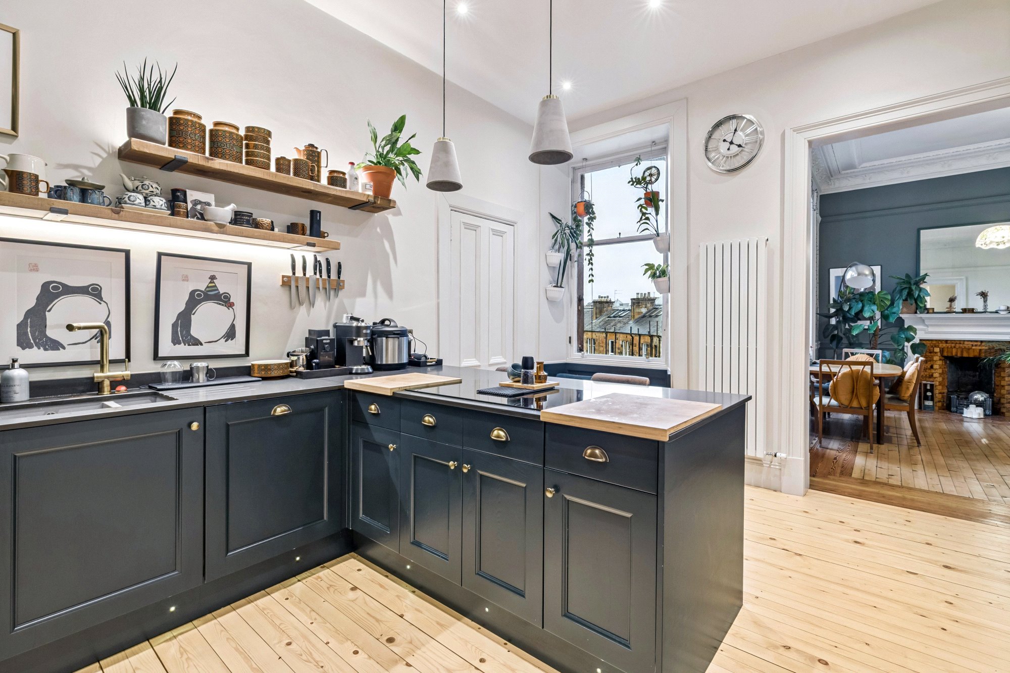 Arranged over two generous floors and linked by a graceful traditional staircase, the accommodation combines impressive social spaces with flexible private rooms. The lower level forms the social heart of the home, centred around a beautifully designed bespoke kitchen — newly installed and finished with deep green cabinetry, black granite worktops, and premium integrated appliances by Neff. An open archway connects this space to a large dining room, ideal for hosting or family gatherings. The separate front lounge retains its traditional charm, with intricate cornicing, a cast-iron fireplace, and broad bay windows overlooking the Botanic Gardens.
