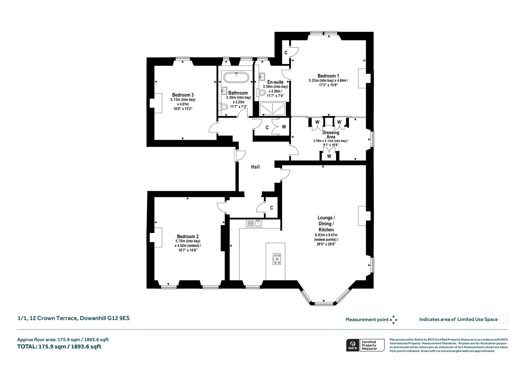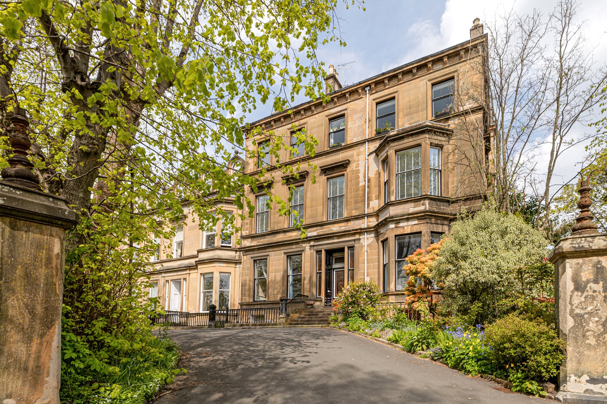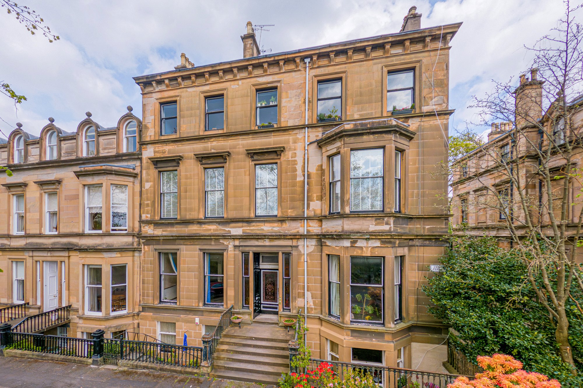 Number 12 Crown Terrace is a bold and prominent, sandstone, end terraced villa and the property for sale is the first floor portion which includes the quite outstanding original drawing room with a full height front bay window which is due south.