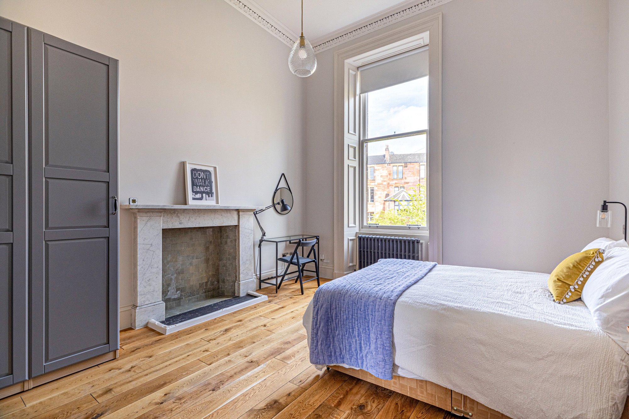 - Impressive bedroom with two large windows to the front, wooden flooring and ornate cornicing.