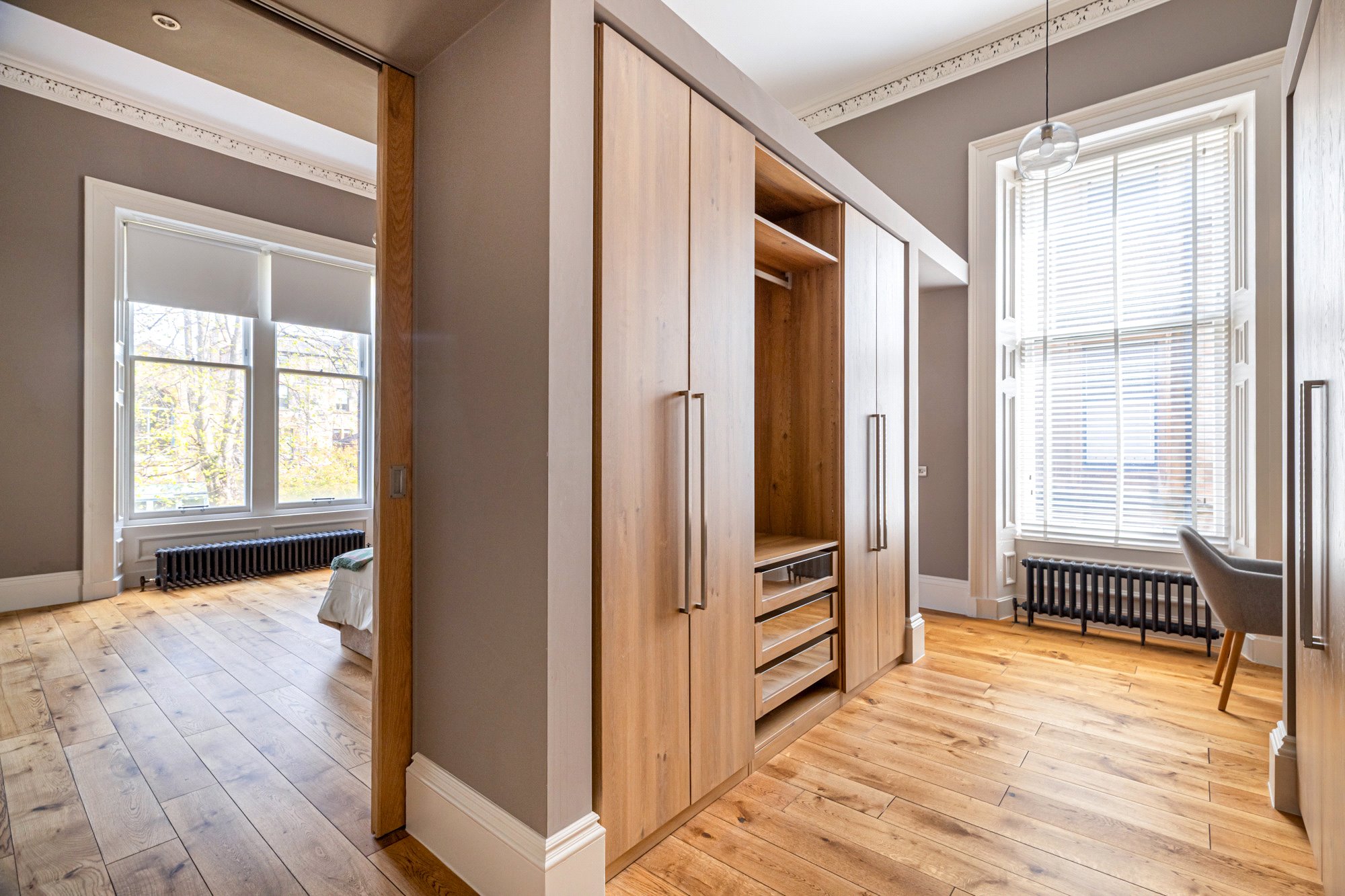 - Generous, semi-open plan fitted dressing room with window to the side (gable) and wooden flooring.