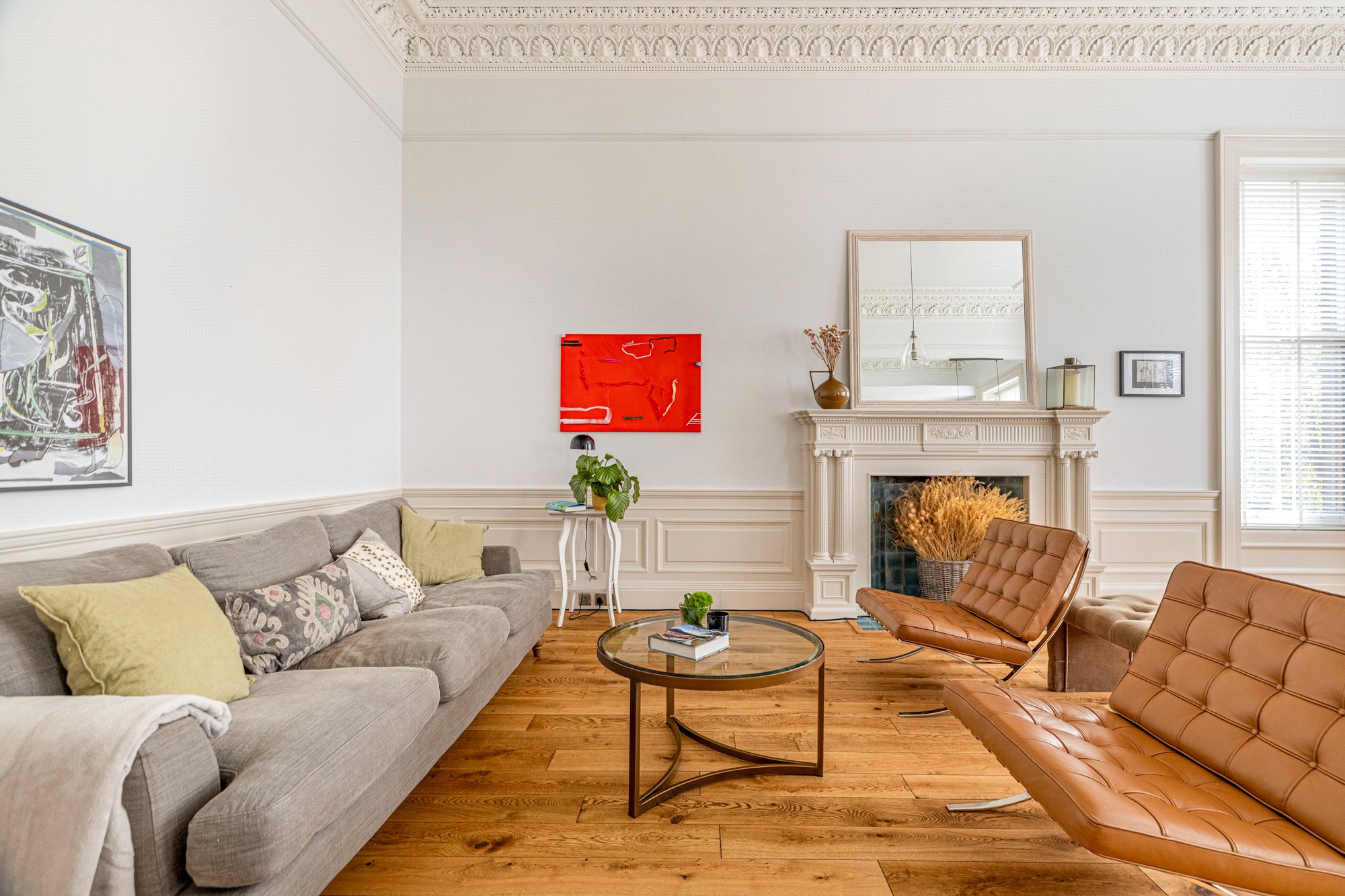 - Magnificent drawing room with three section bay window to the front, additional window to the side (gable), ornate cornicing and wooden flooring.
