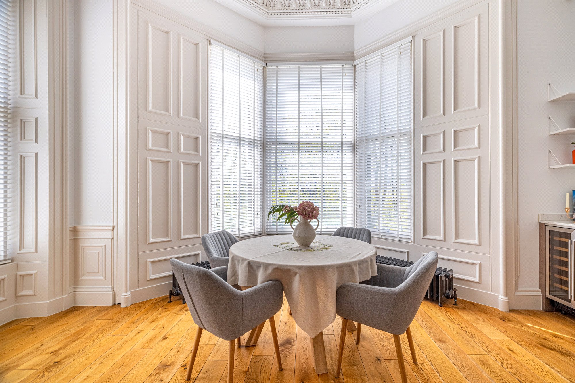 The property forms part of a substantial, corner, terraced villa and has a wonderful south facing frontage to the tree lines terrace and then beyond to the large, mature residents’ gardens which run along behind Highburgh Road.
