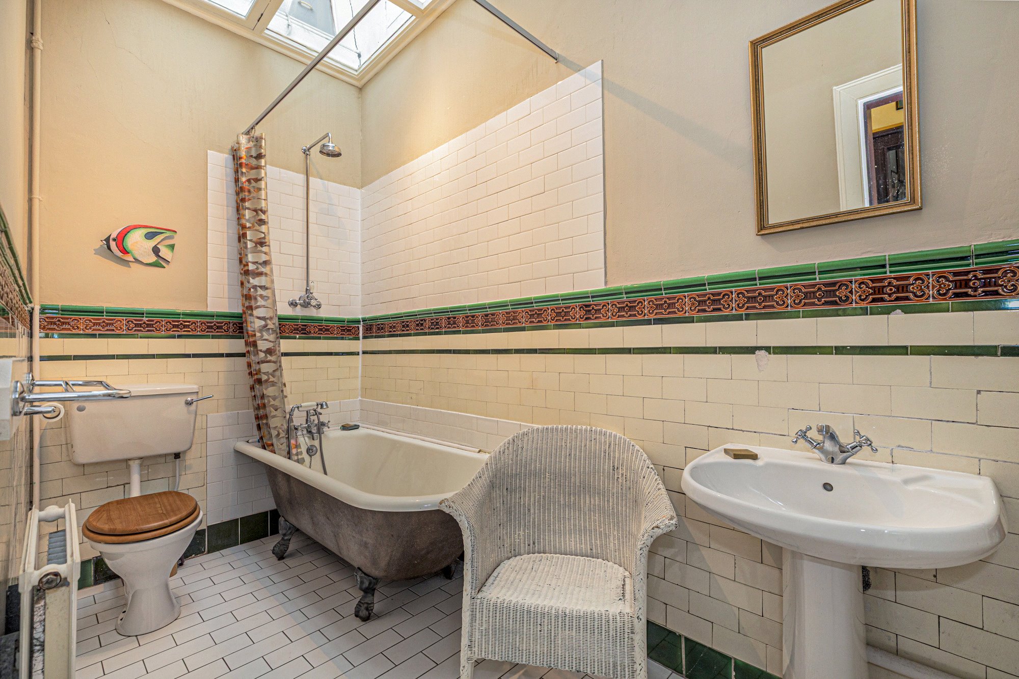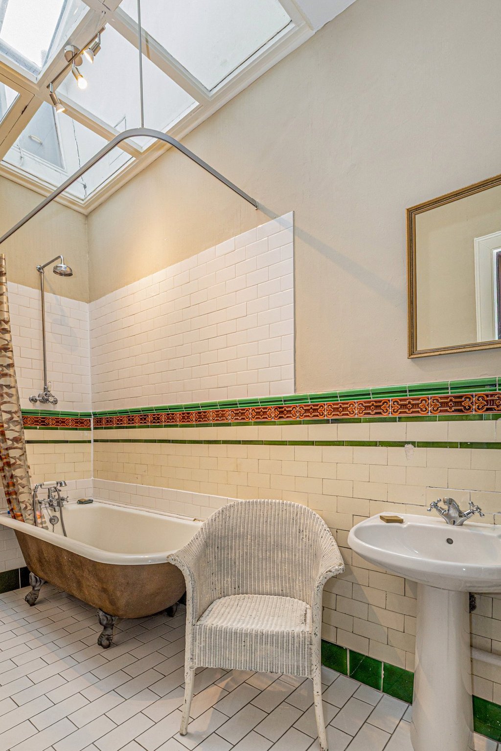 • Memorable Victorian bathroom with roll top bath, gorgeous tiling and enormous skylight.