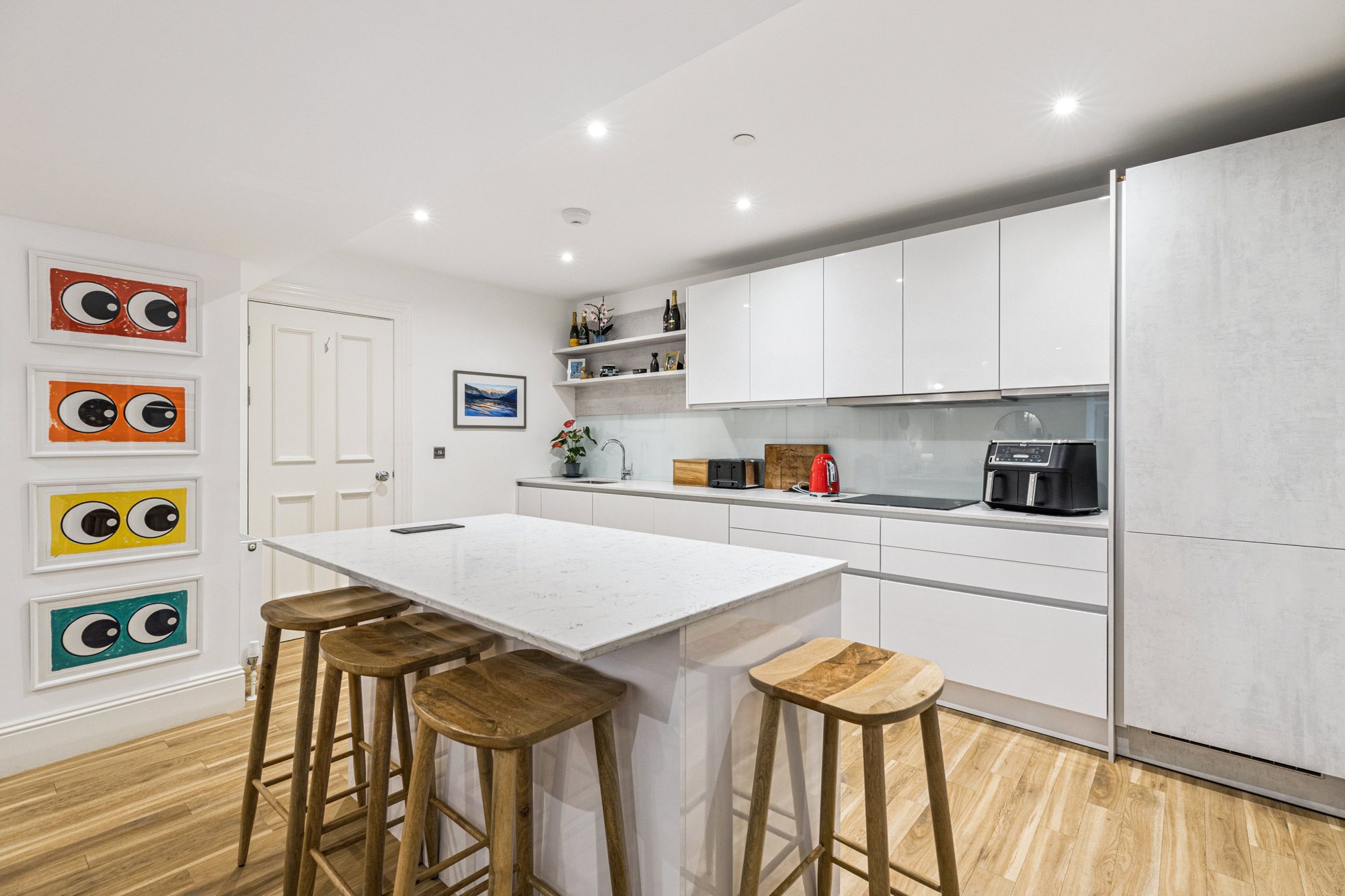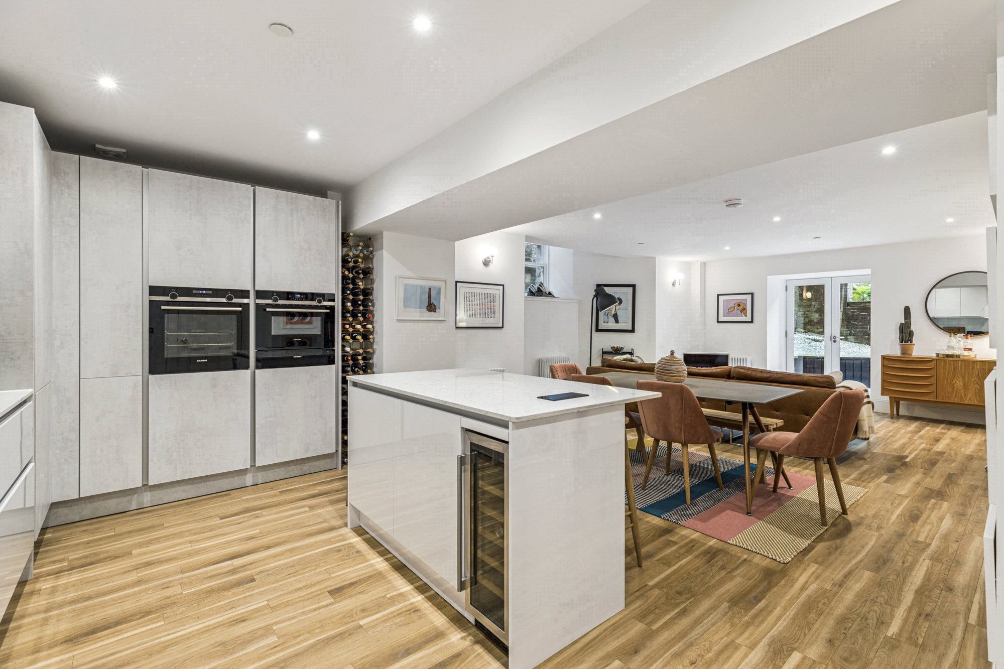 Descending to the lower floor reveals the heart of the home: a large, open-plan living, dining, and kitchen area with full-height glazed doors opening directly to the private garden. The kitchen itself is sleek and contemporary, with integrated premium appliances, ample storage, and a central island that doubles as a breakfast bar — ideal for entertaining, family meals, or casual evenings in.
