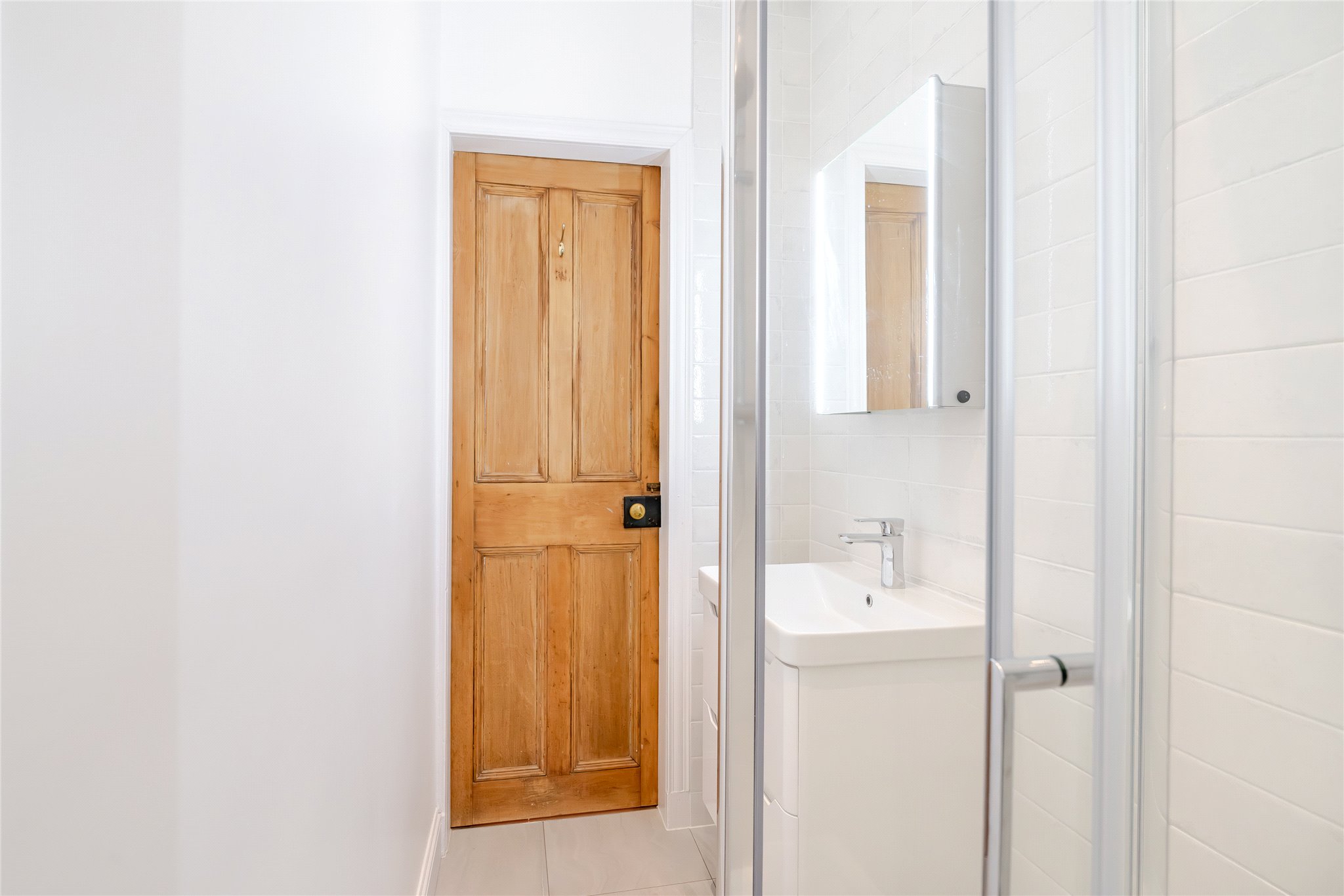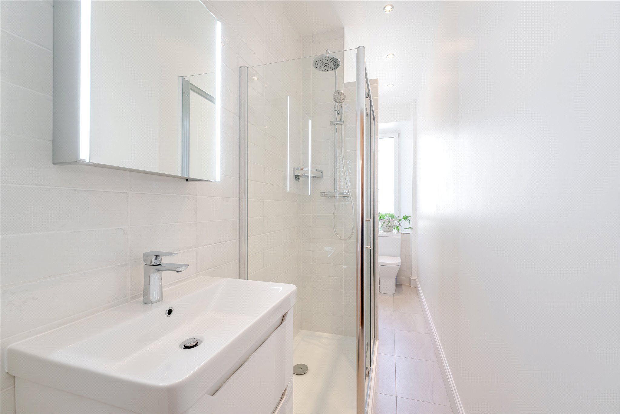 - Stylish bathroom with white suite and over-bath shower