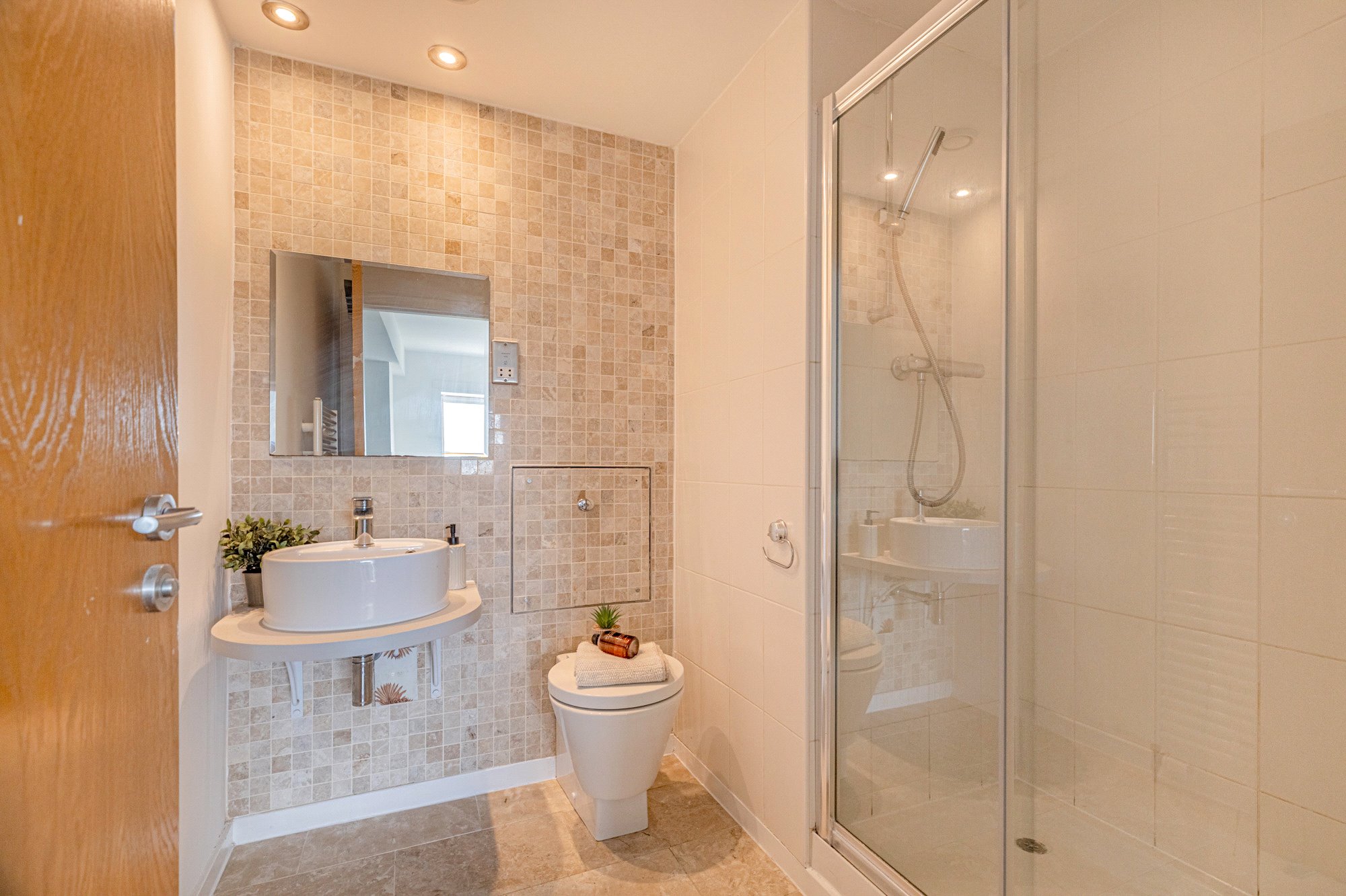 - Stylish en suite shower room comprising three-piece suite