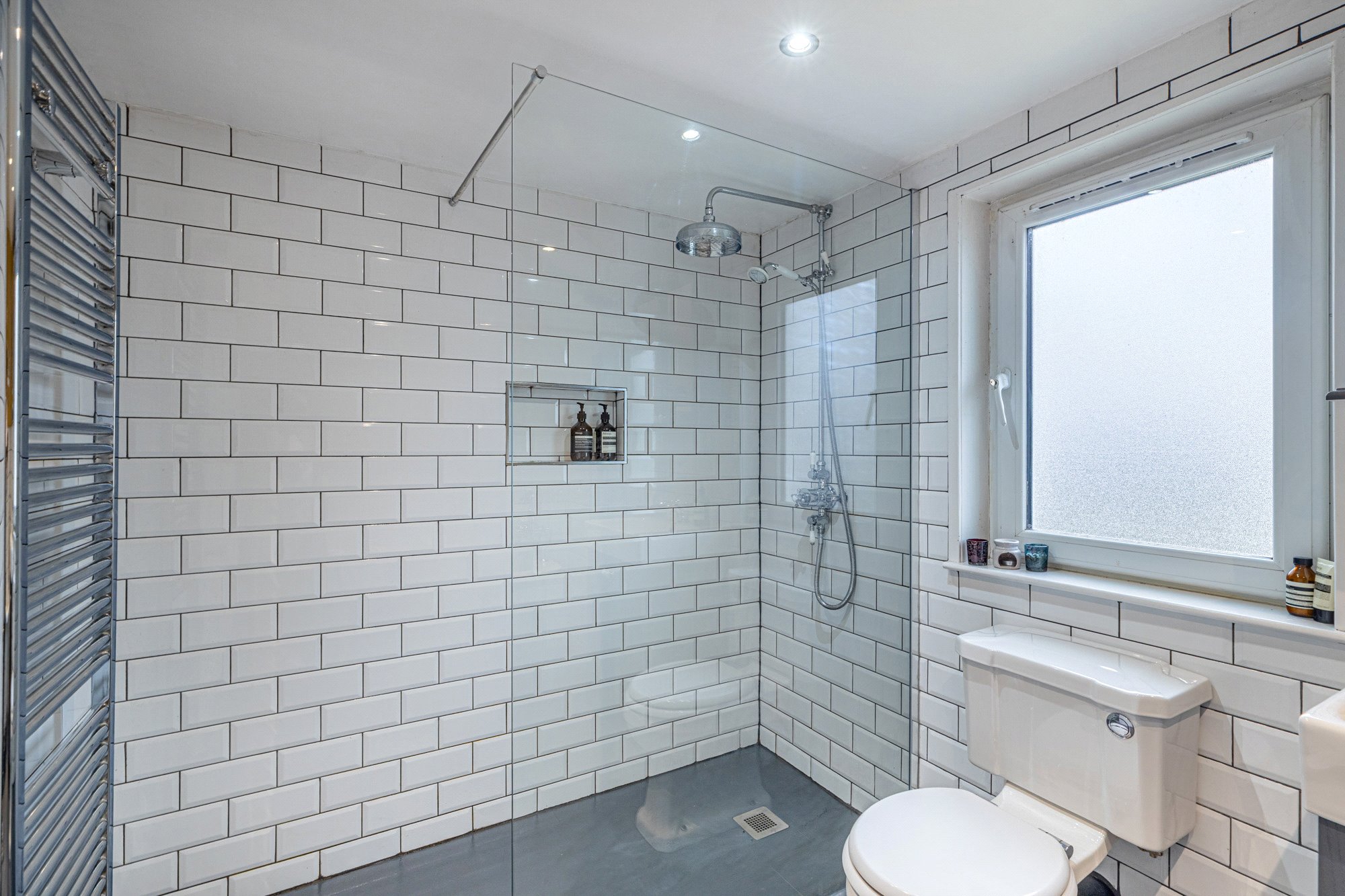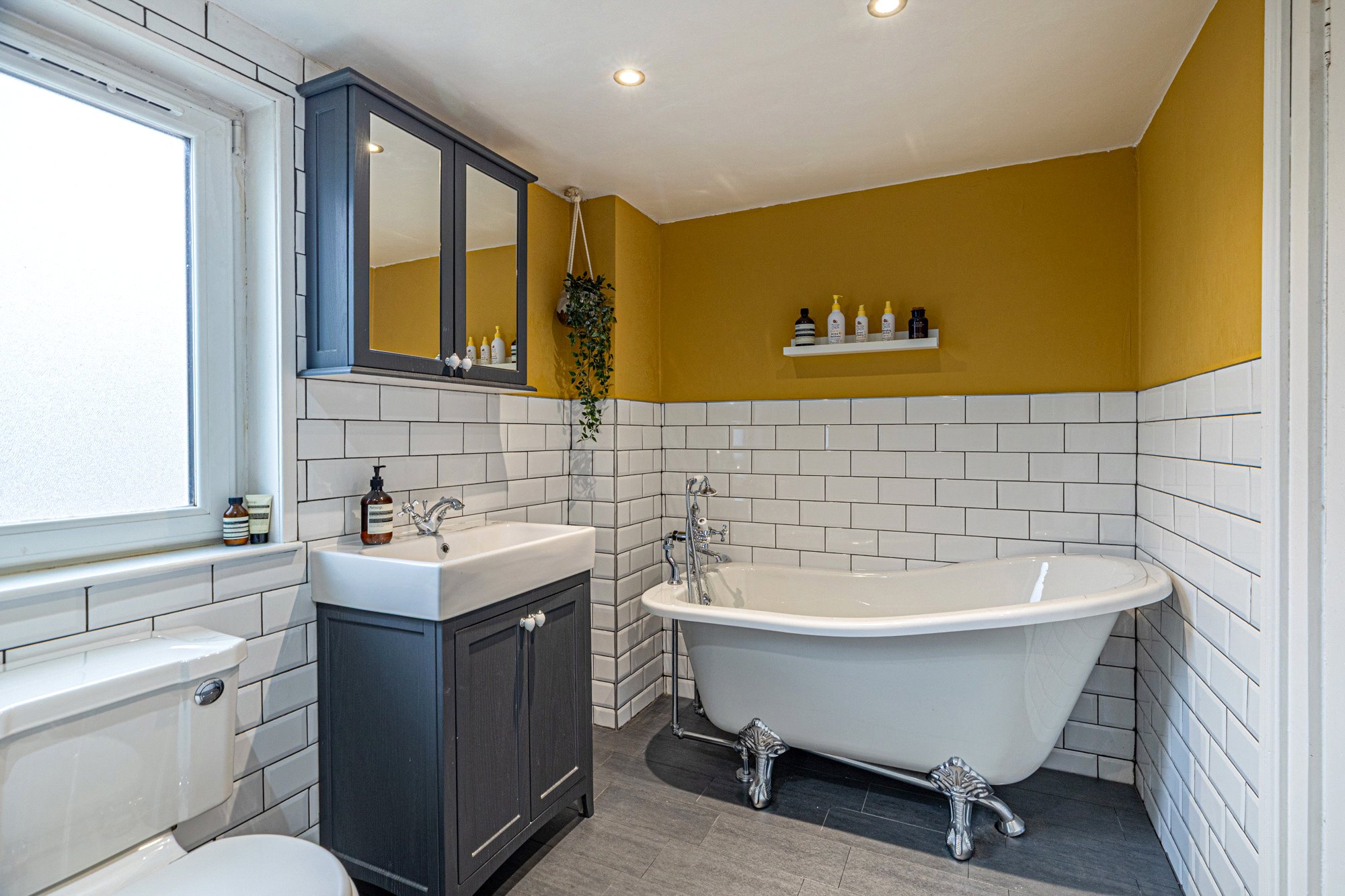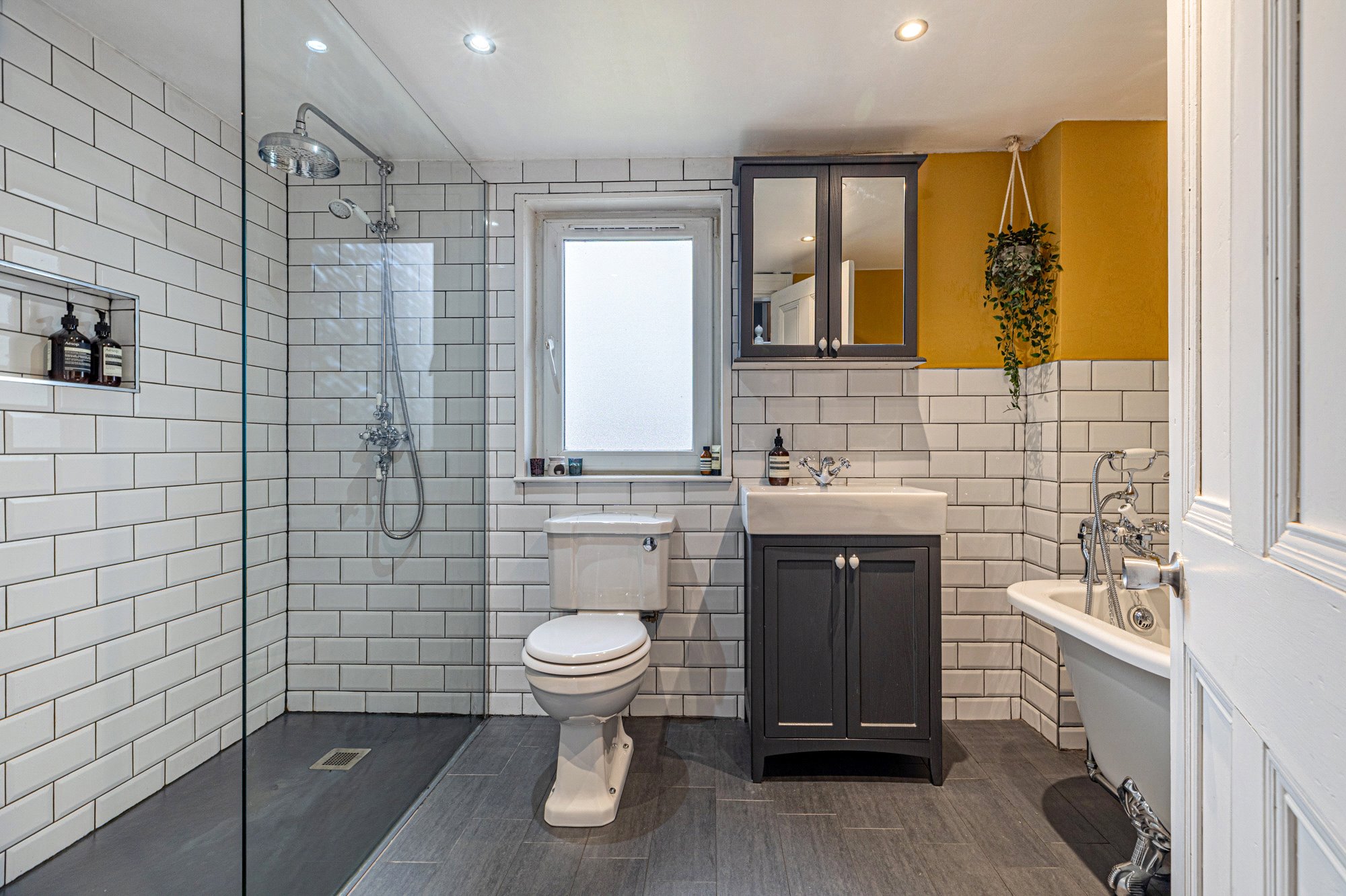 - Fabulous four-piece bathroom on half landing comprising bath, separate walk-in shower cubicle, toilet and wash hand basin. Window to the rear