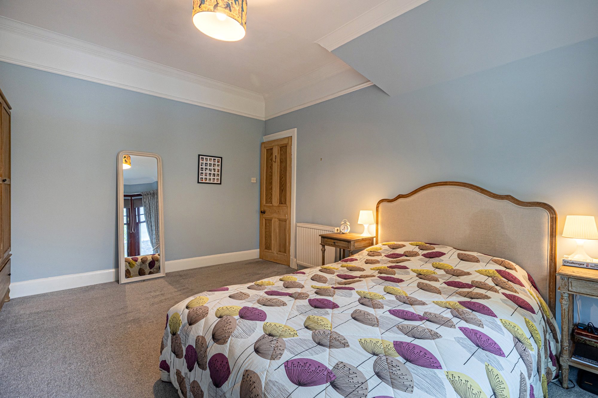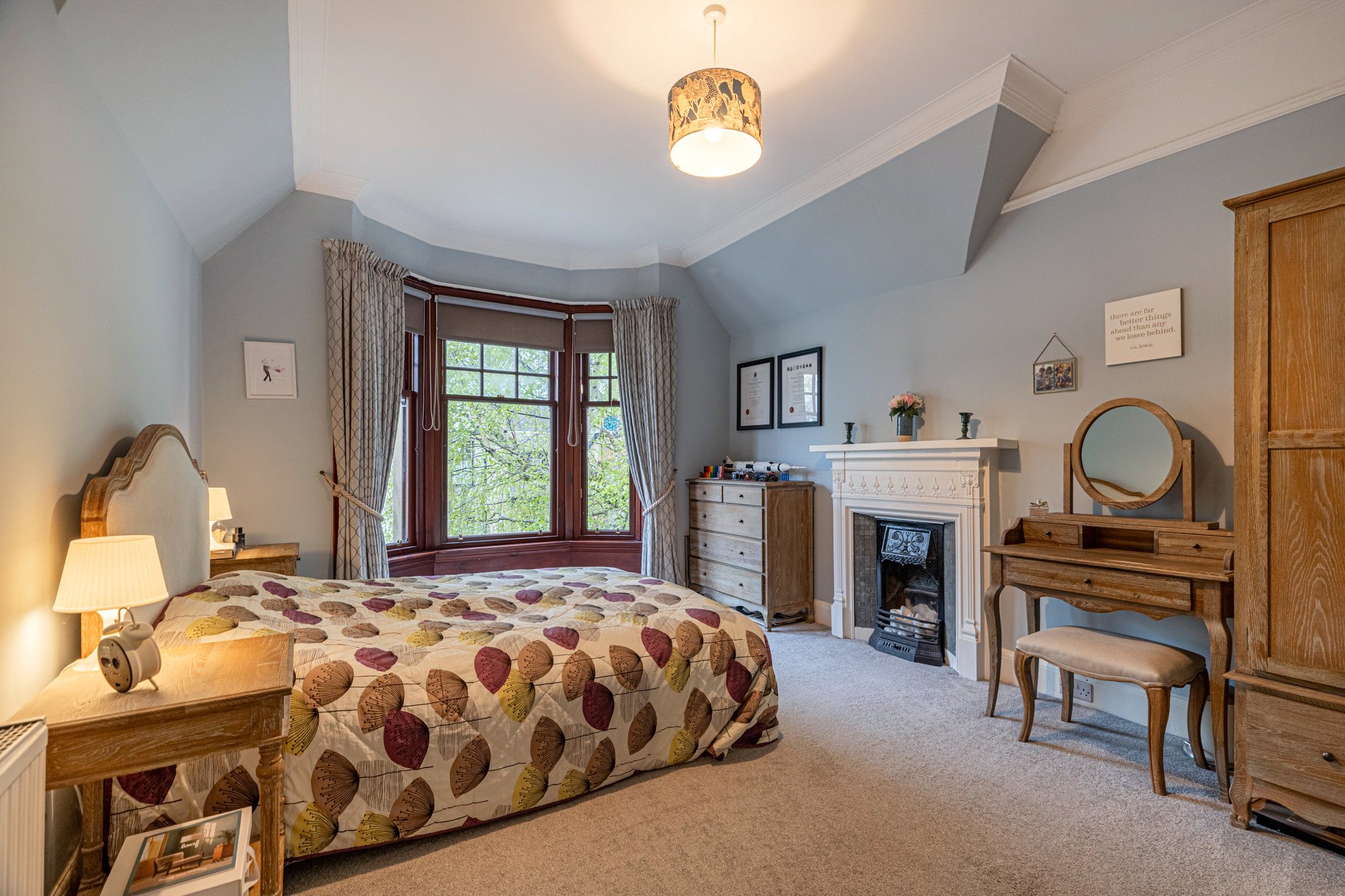 - Bedroom one with three section bay window and focal point fireplace