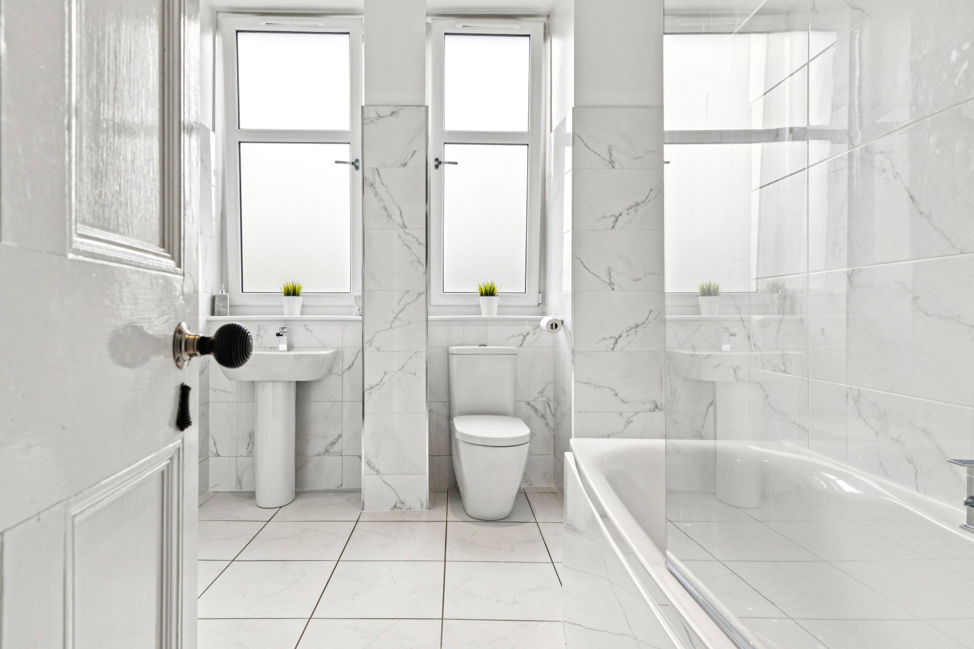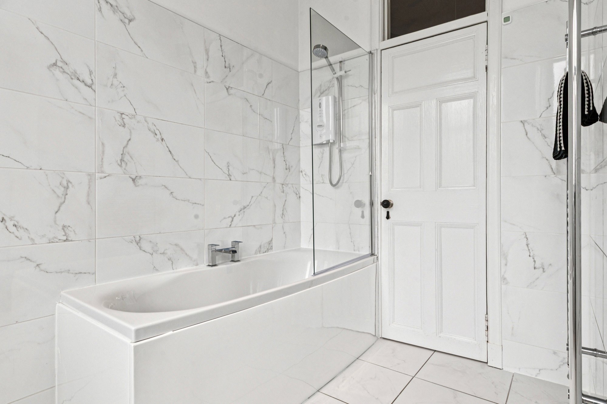 - Stylish three-piece bathroom comprising bath, over bath shower, toilet and wash hand basin. Two windows to the rear