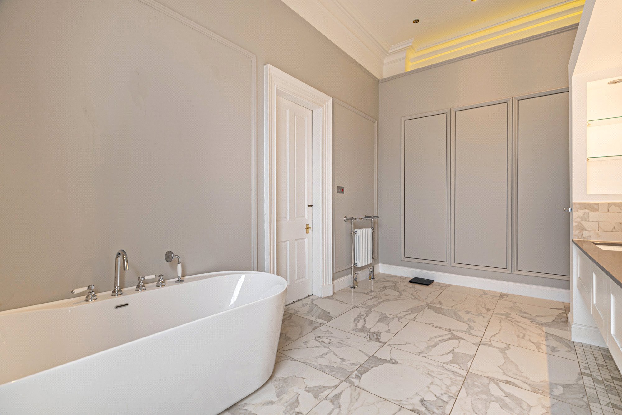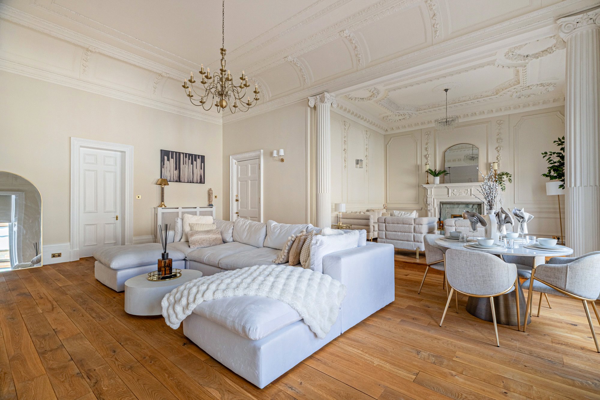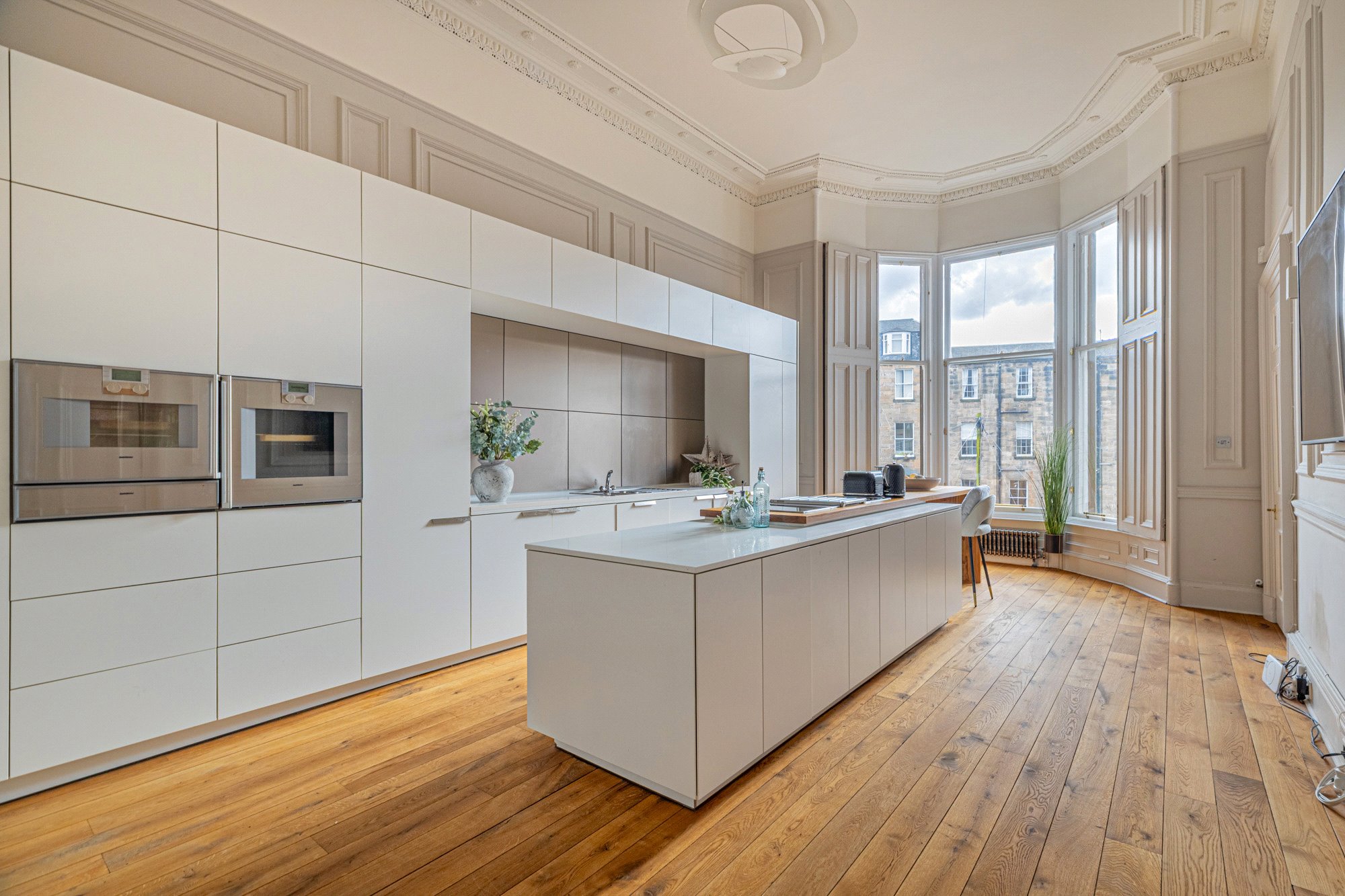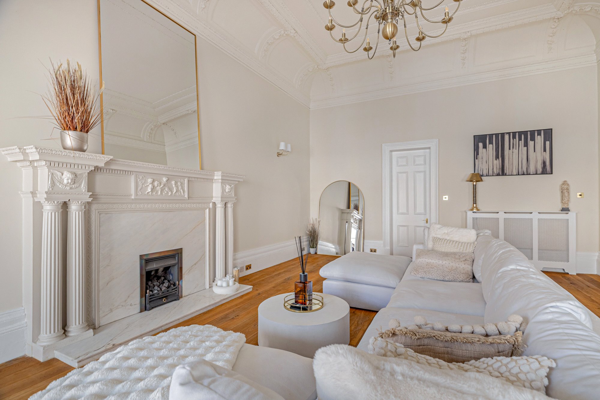 In brief the accommodation extends to; breath-taking L-shaped drawing room with the most stunning of ceiling plasterworks, two fire places and fabulous full length glazing, sleek contemporary dining kitchen complete with central island, full complement of high quality appliances and South-facing bay window, rear hallway which provides access to a carefully fitted utility room with further appliances, guest WC and stairway to the upper level. On the upper floor you will find a stunning principal bedroom suite complete with fitted wardrobes and an exceptional en-suite shower room with Swedish layout including walk-in shower, free-standing contemporary bathtub, WC enclosure & twin wash hand basins with vanity mirrors. The second bedroom is of excellent proportions and has a lovely bay window formation which faces South. Bedroom three is of comfortable king-sized proportions, allowing lots of space for free-standing wardrobes and drawer sets.