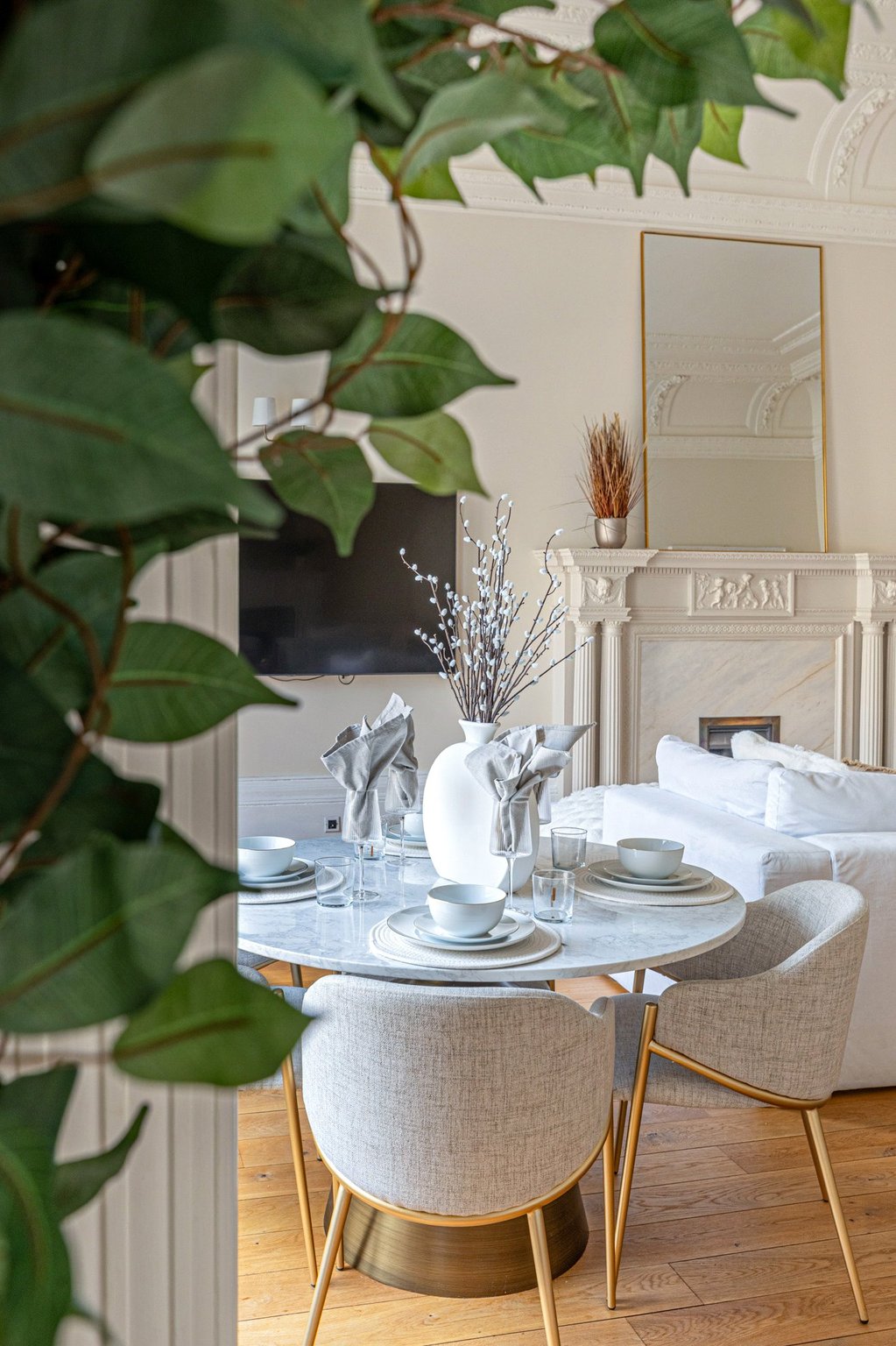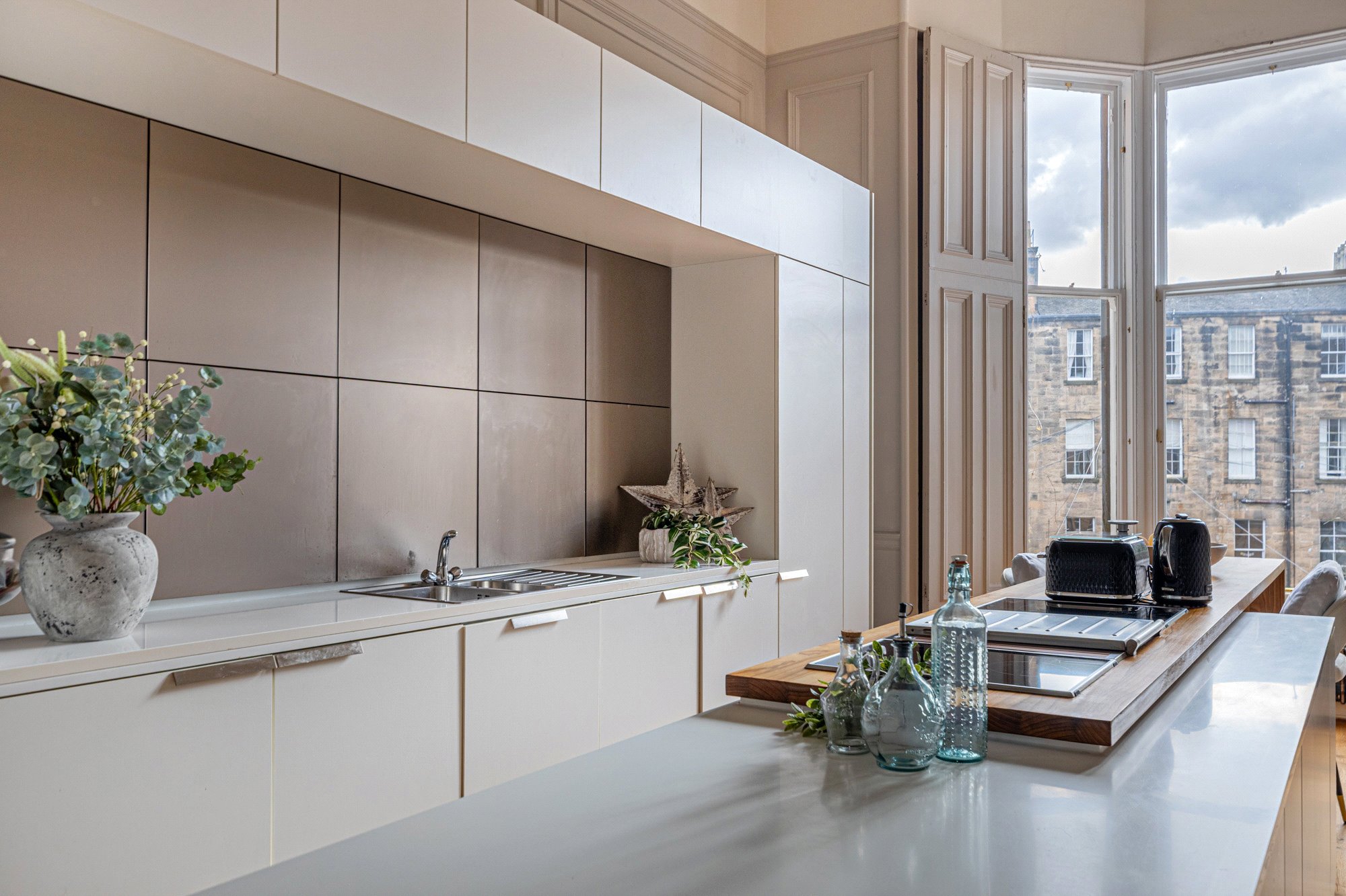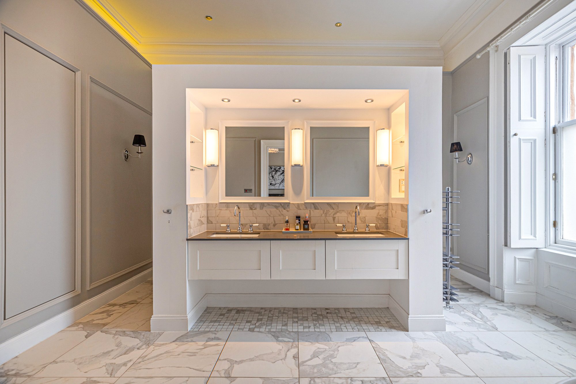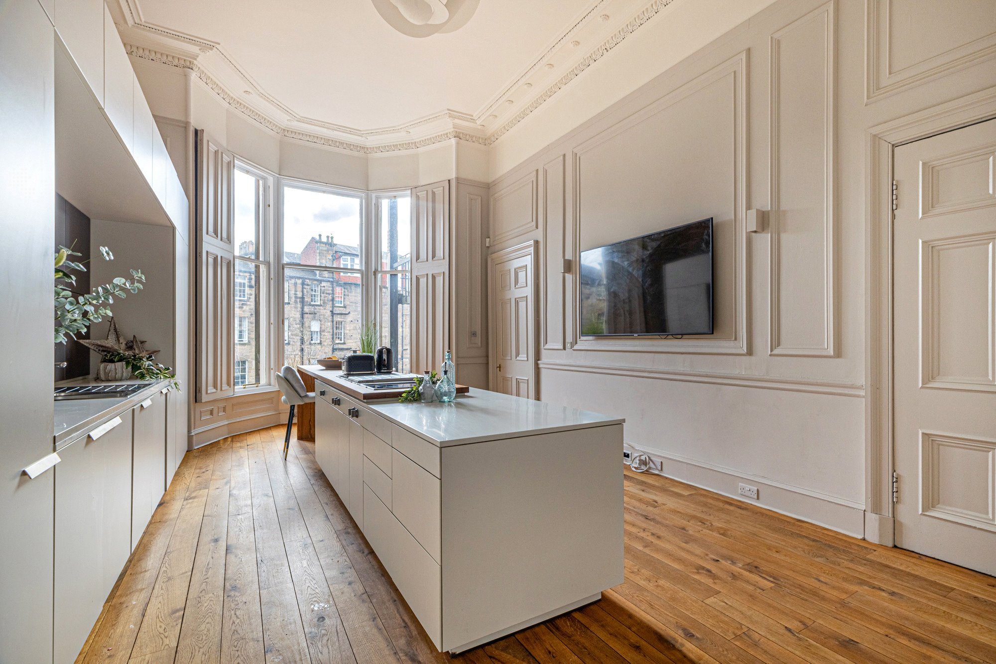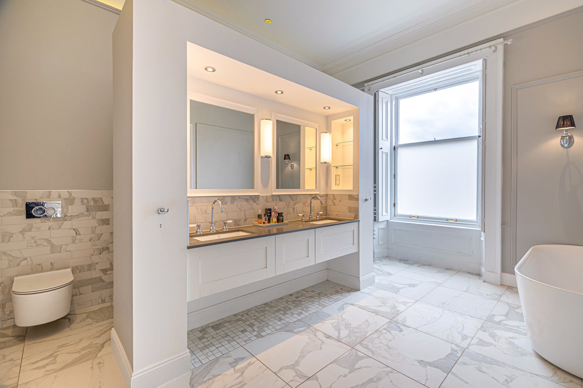 In brief the accommodation extends to; breath-taking L-shaped drawing room with the most stunning of ceiling plasterworks, two fire places and fabulous full length glazing, sleek contemporary dining kitchen complete with central island, full complement of high quality appliances and South-facing bay window, rear hallway which provides access to a carefully fitted utility room with further appliances, guest WC and stairway to the upper level. On the upper floor you will find a stunning principal bedroom suite complete with fitted wardrobes and an exceptional en-suite shower room with Swedish layout including walk-in shower, free-standing contemporary bathtub, WC enclosure & twin wash hand basins with vanity mirrors. The second bedroom is of excellent proportions and has a lovely bay window formation which faces South. Bedroom three is of comfortable king-sized proportions, allowing lots of space for free-standing wardrobes and drawer sets.