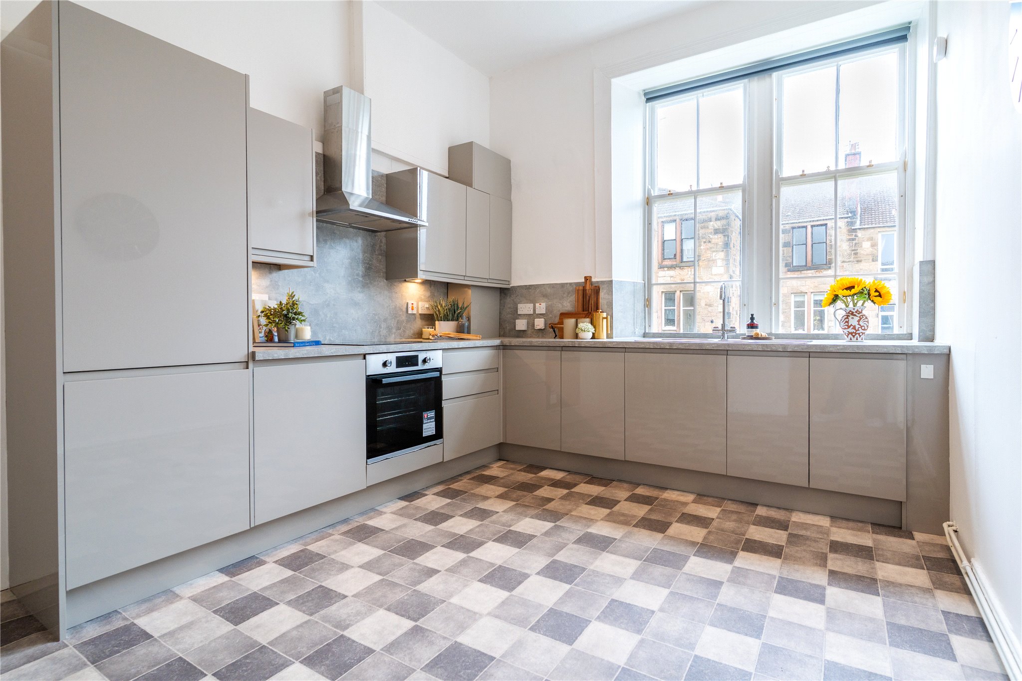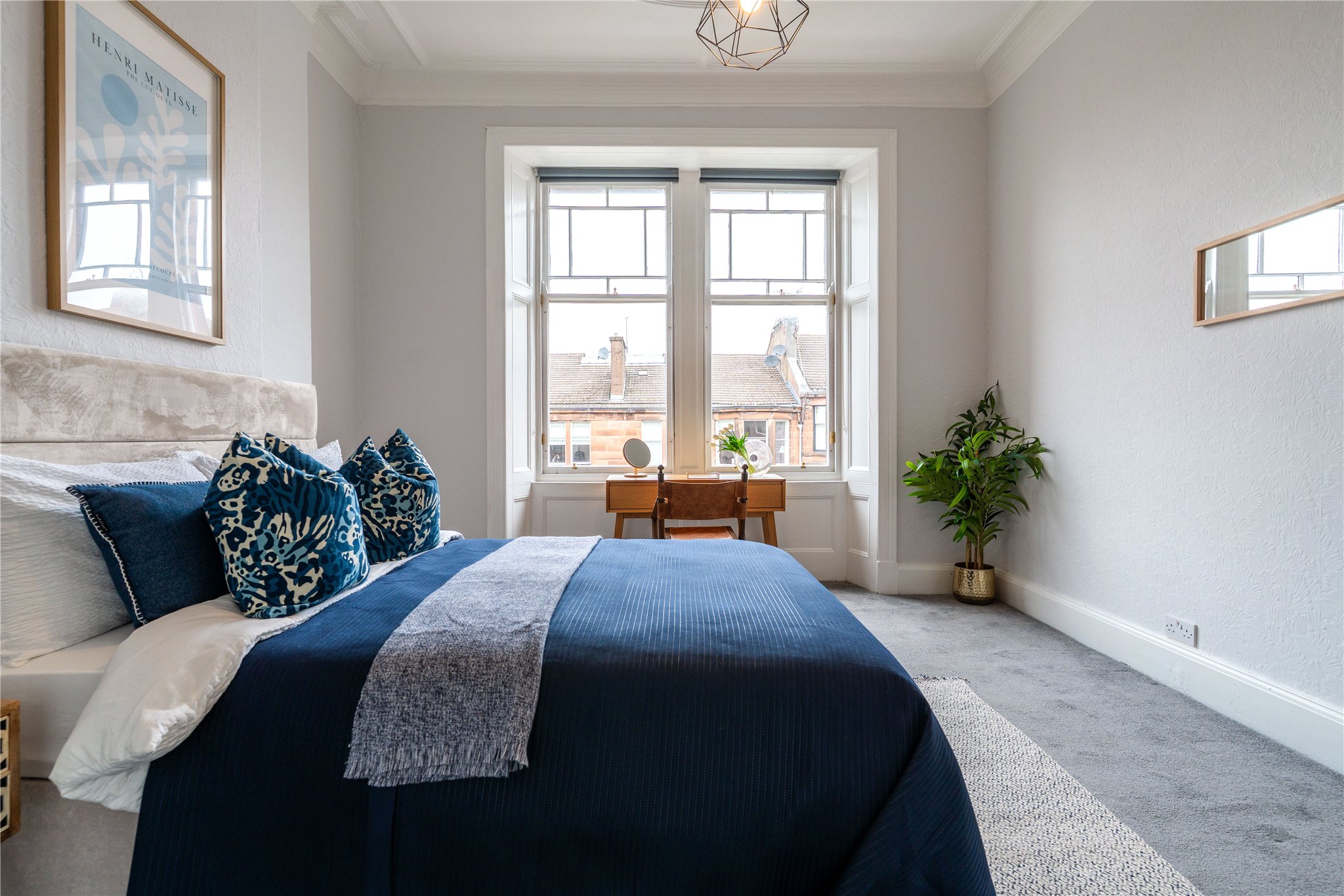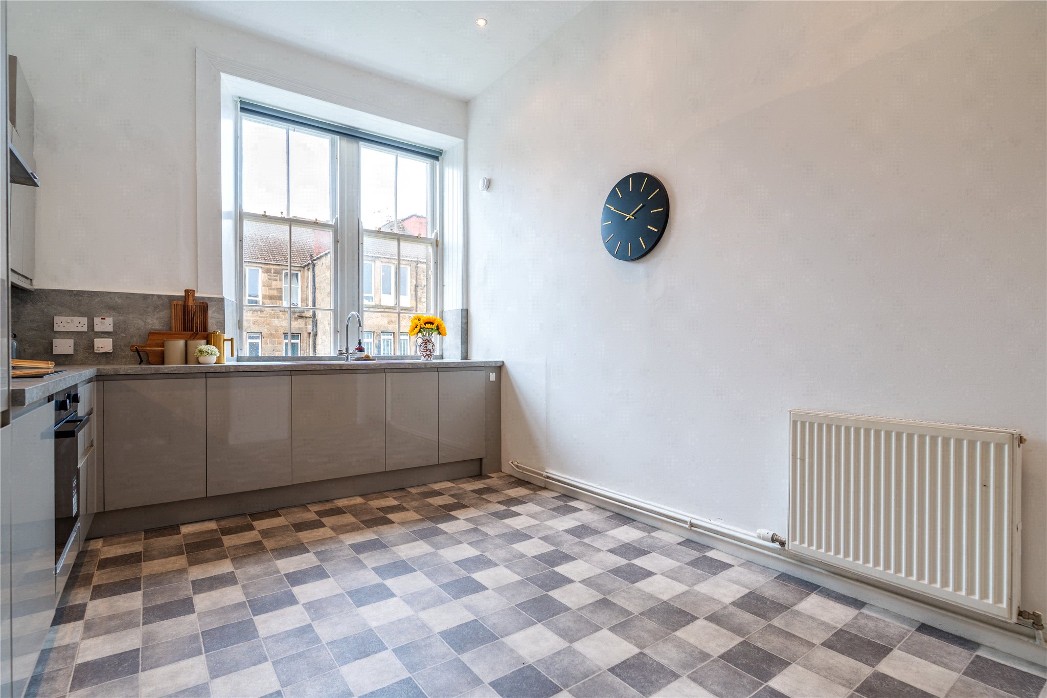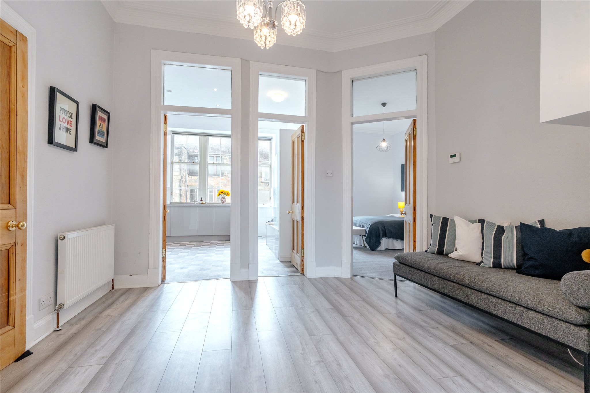 Internally this is a bright, airy two-bedroom apartment which offers very comfortable living space that would be well-suited to a professional couple or perhaps two individuals sharing. The decor is neutral and pleasant throughout, complimenting the spacious principal apartments. In brief the accommodation extends to; broad reception hall with cupboard space, beautiful bay window living room, large dining kitchen with open recess, two spacious king-sized bedrooms and traditional tenement bathroom with white suite and shower over bath.