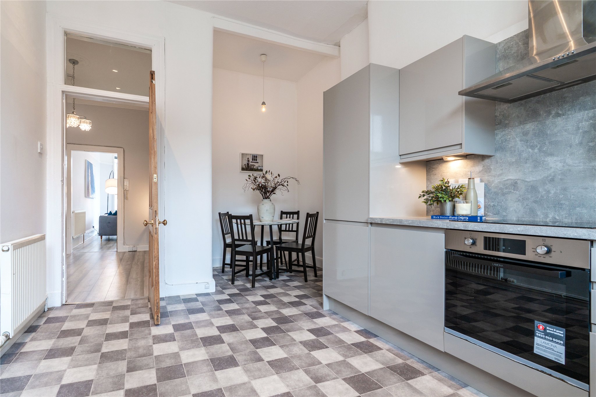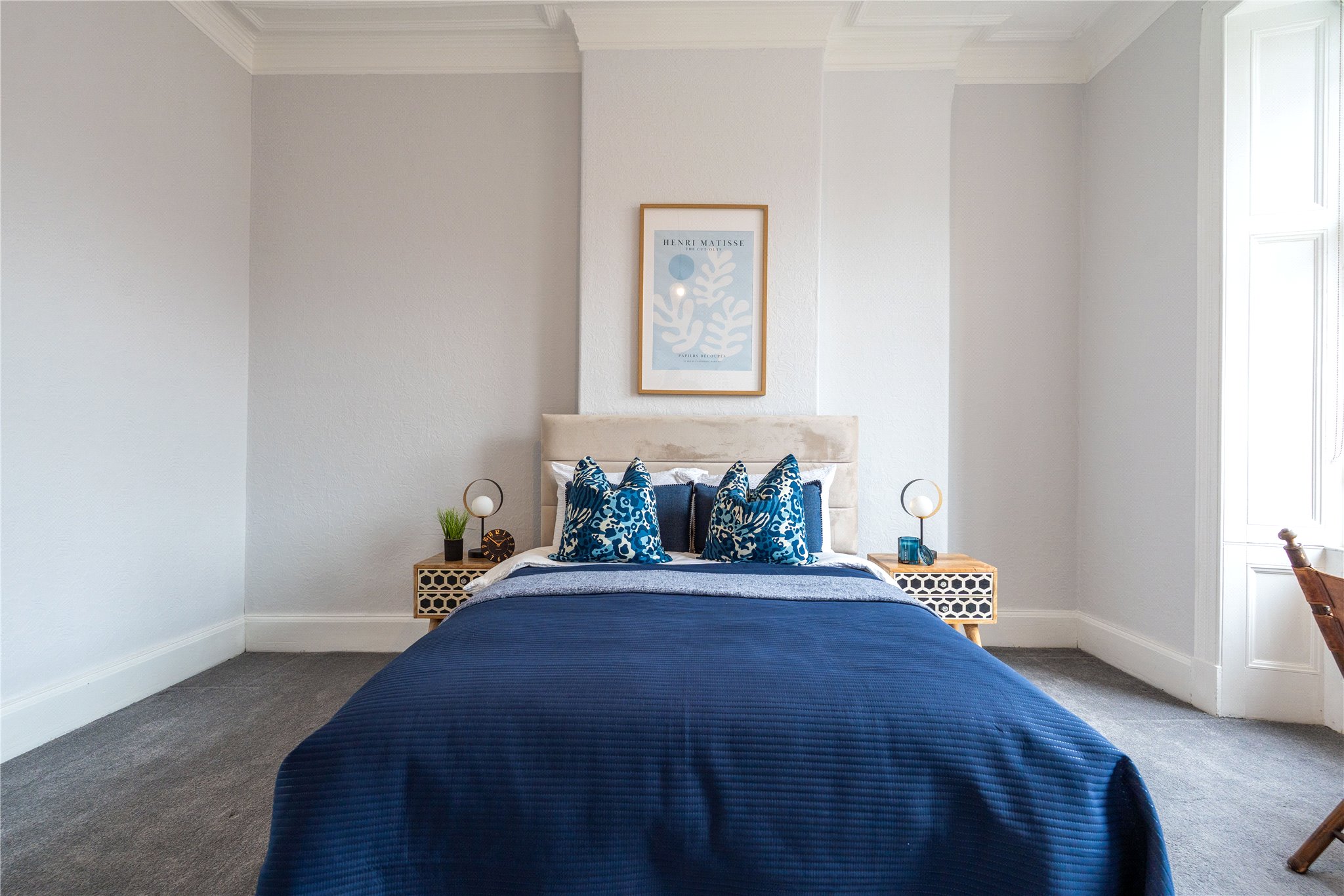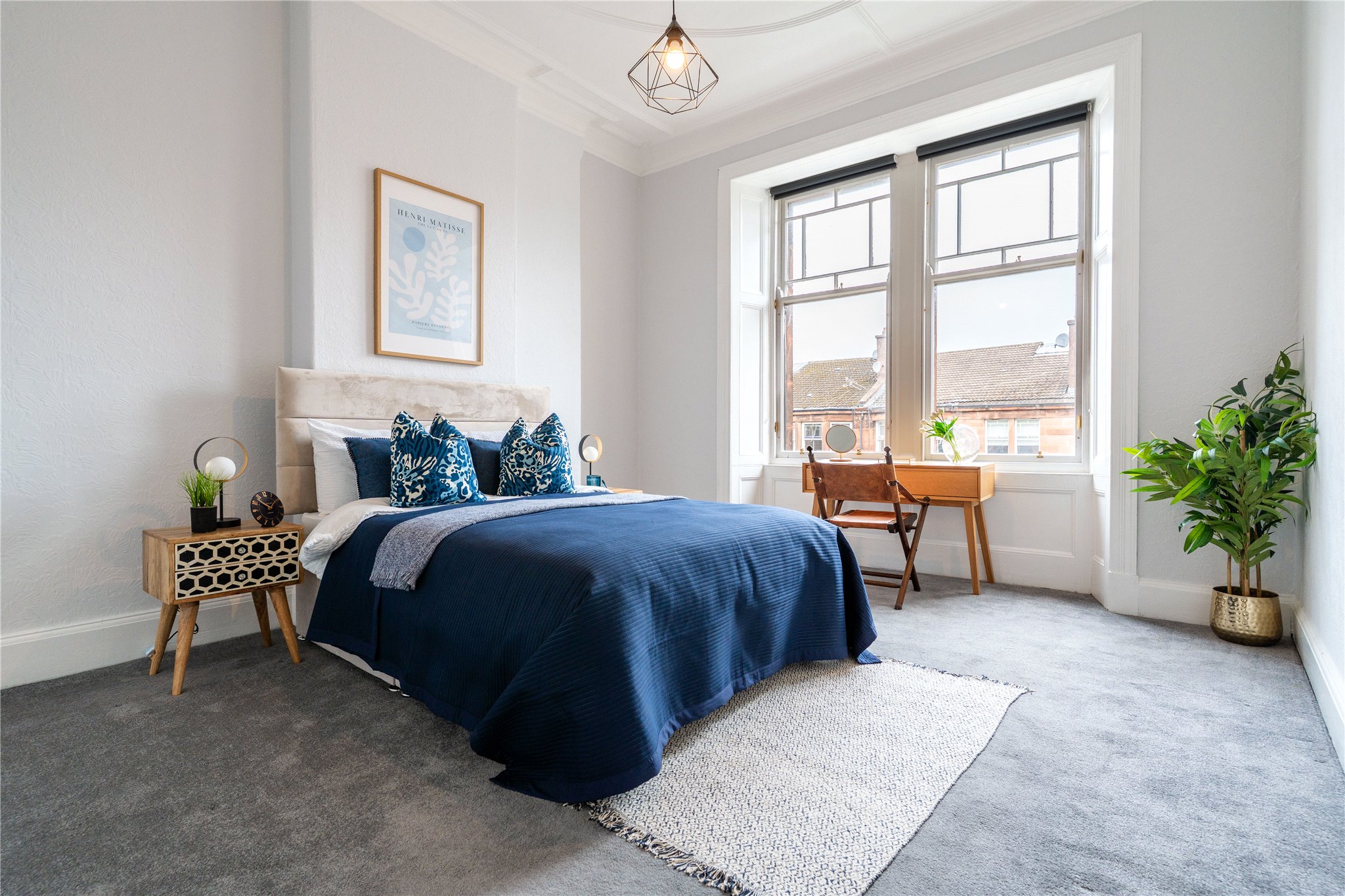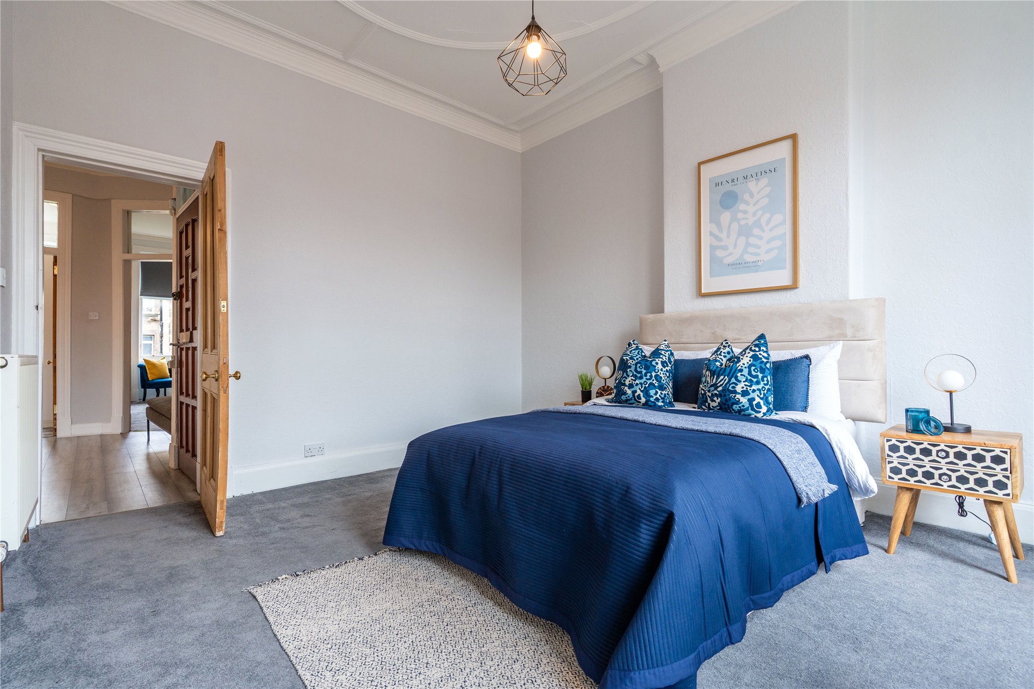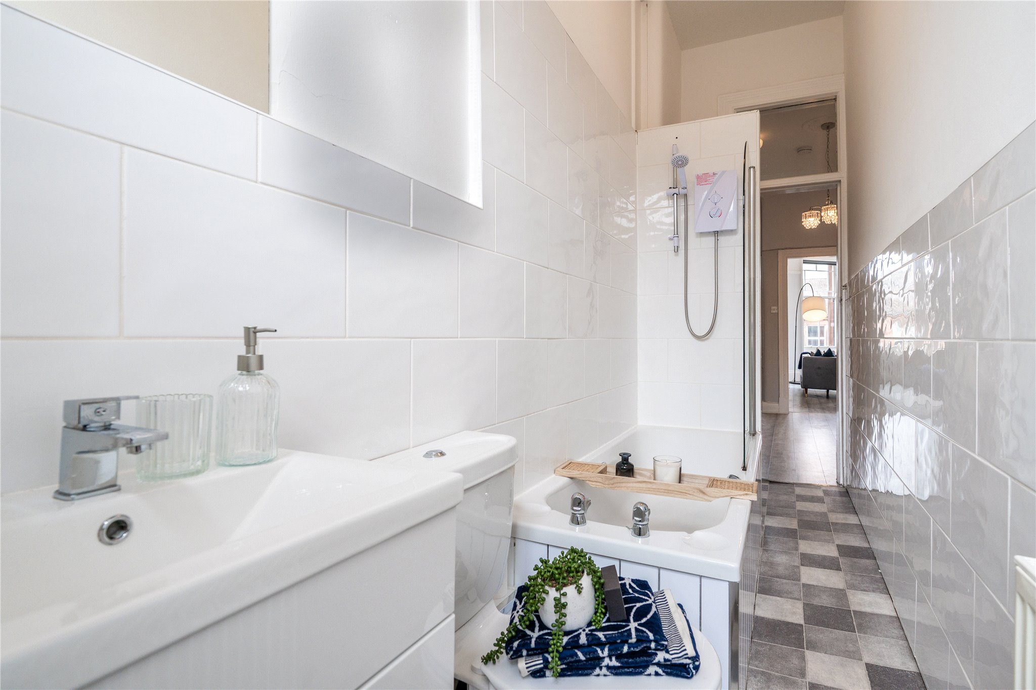 Internally this is a bright, airy two-bedroom apartment which offers very comfortable living space that would be well-suited to a professional couple or perhaps two individuals sharing. The decor is neutral and pleasant throughout, complimenting the spacious principal apartments. In brief the accommodation extends to; broad reception hall with cupboard space, beautiful bay window living room, large dining kitchen with open recess, two spacious king-sized bedrooms and traditional tenement bathroom with white suite and shower over bath.