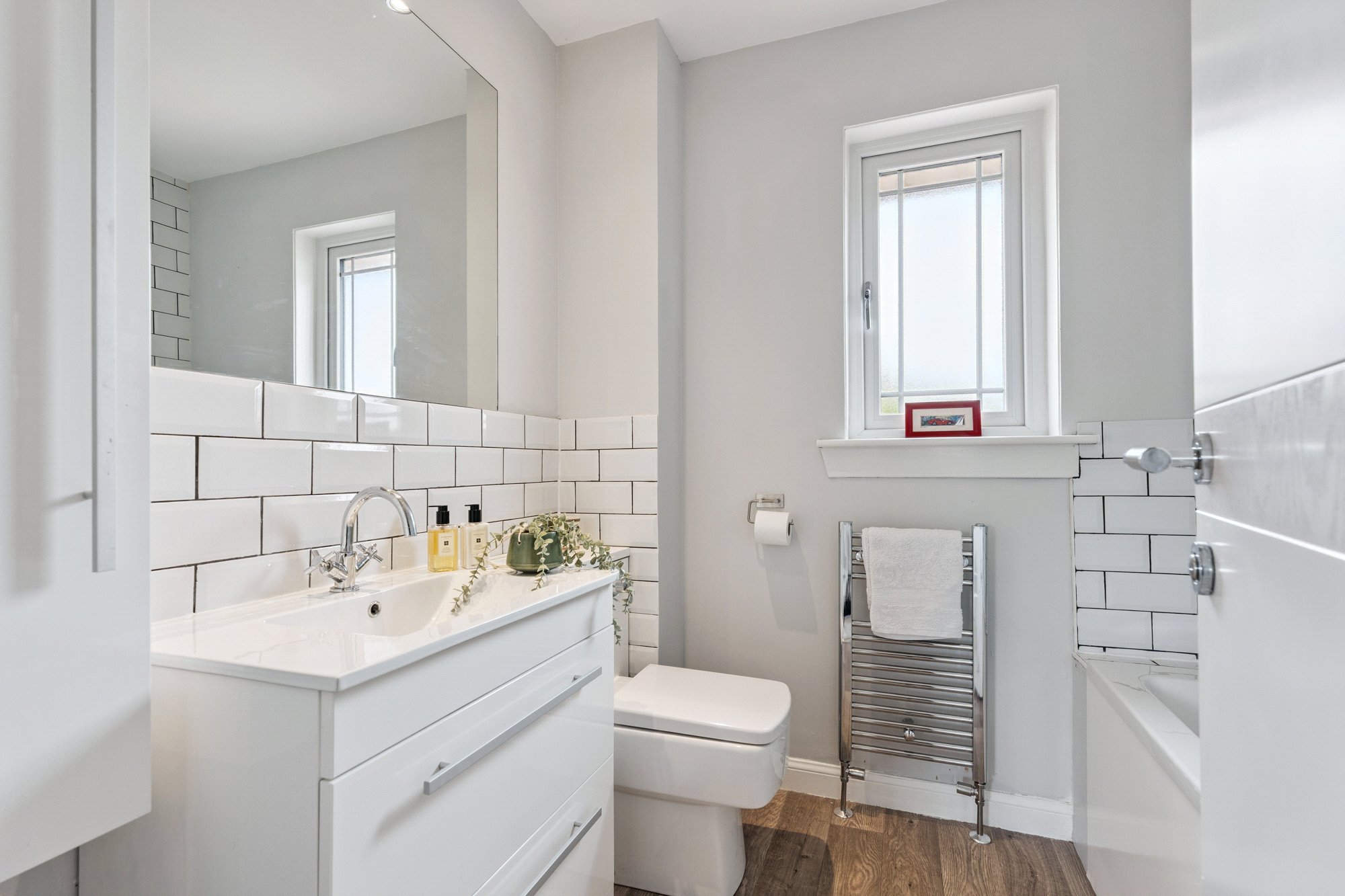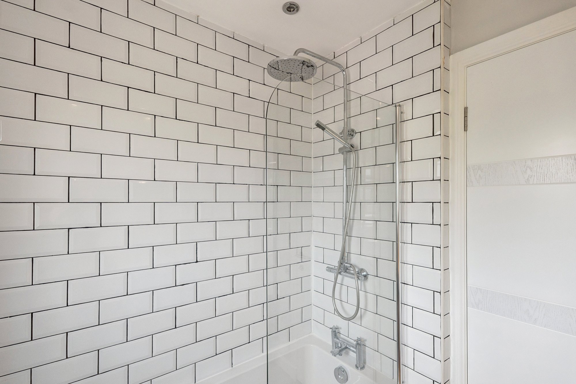 - Modern three-piece bathroom comprising bath, over bath shower, toilet and wash hand basin. Window to the front