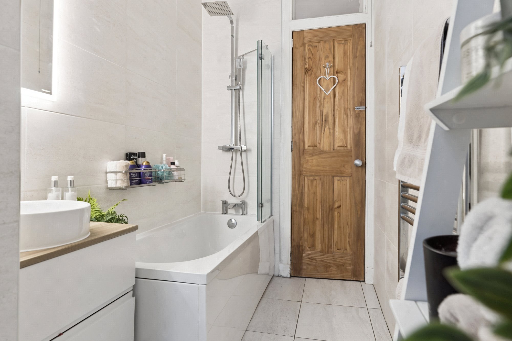 - Stylish three-piece bathroom comprising bath, over bath shower, toilet and wash hand basin. Window to the rear