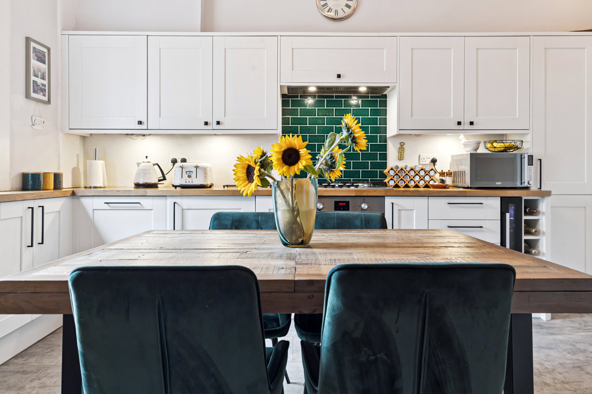 - Impressive dining kitchen complete with a range of base and wall units, integrated appliances, useful storage/utility off and window to the rear