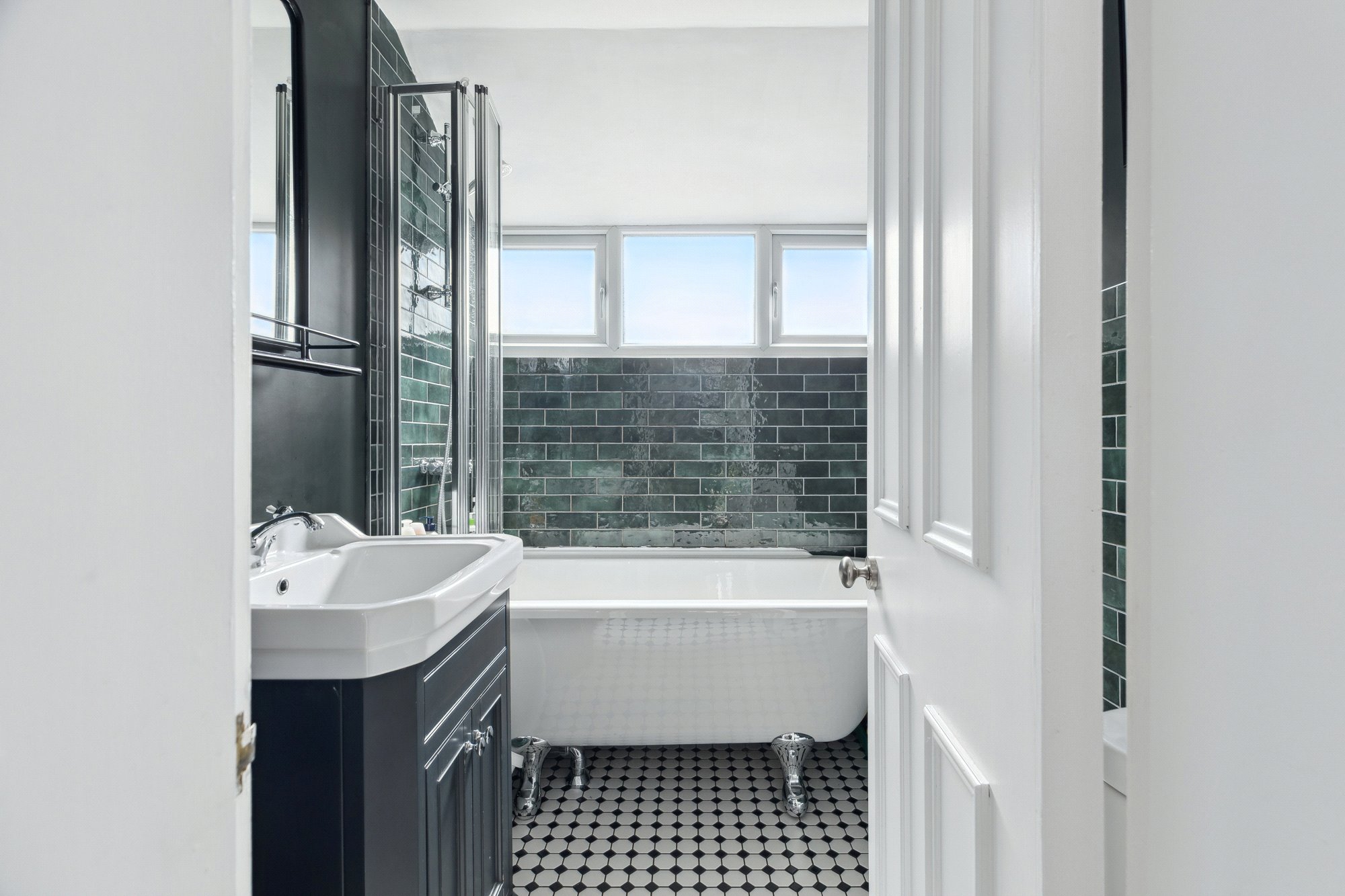 • Stylish family bathroom with attractive tiling at half-landing
