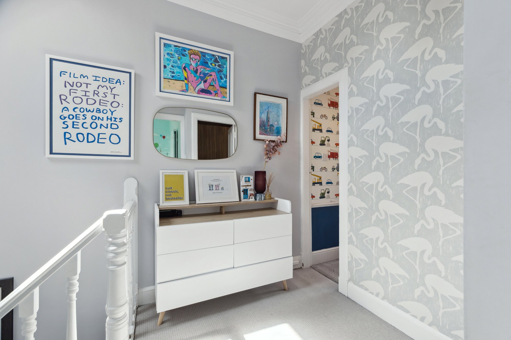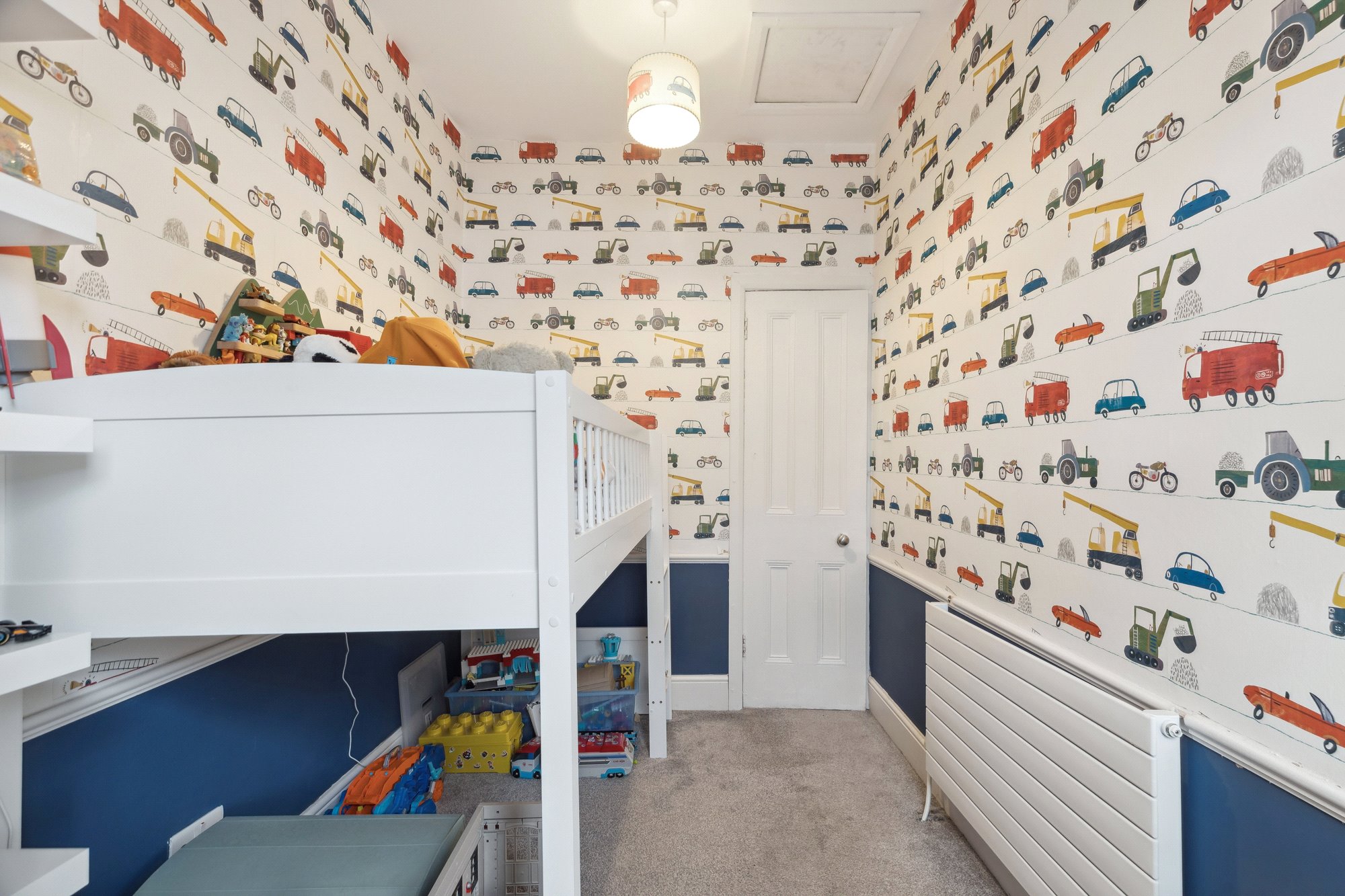 Upstairs, a beautiful staircase leads to a half-landing where a well-appointed family bathroom is found, complete with stylish tiling. The upper level hosts two generous king-size bedrooms and a comfortable third single bedroom—ideal as a nursery, guest room or home office.