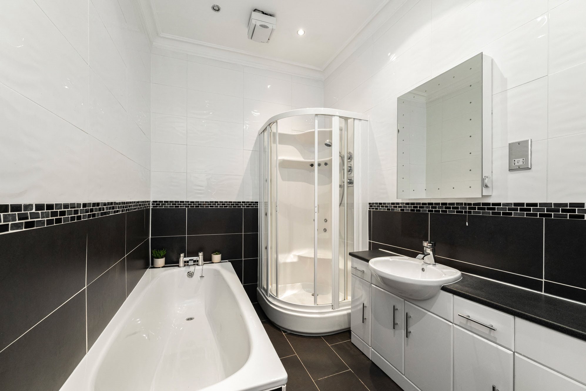 - Four-piece bathroom comprising bath, separate shower cubicle, toilet and wash hand basin