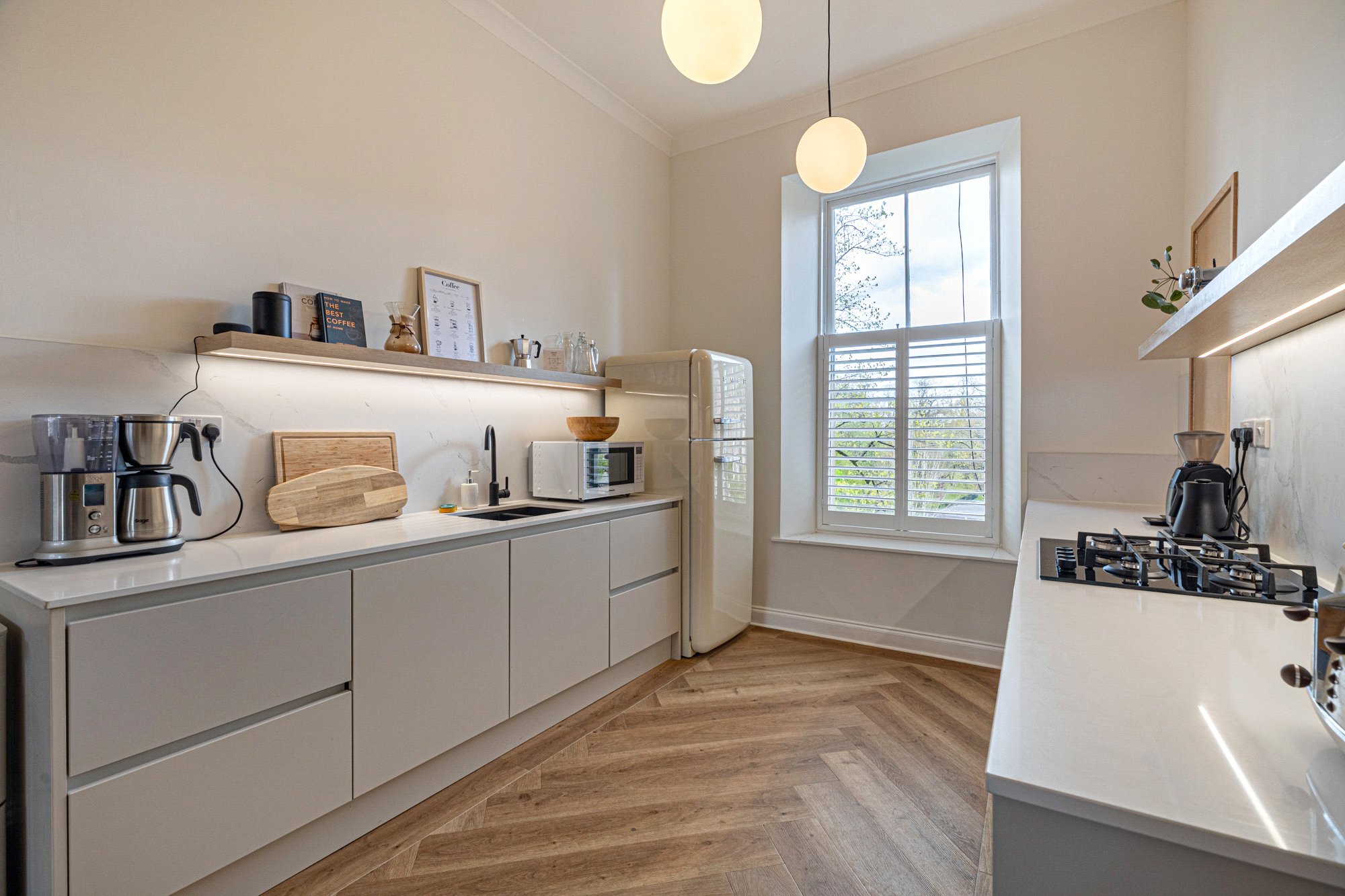 - Stunning, open plan dining kitchen with a range of base units, integrated appliances, hardwood flooring and window to the rear.