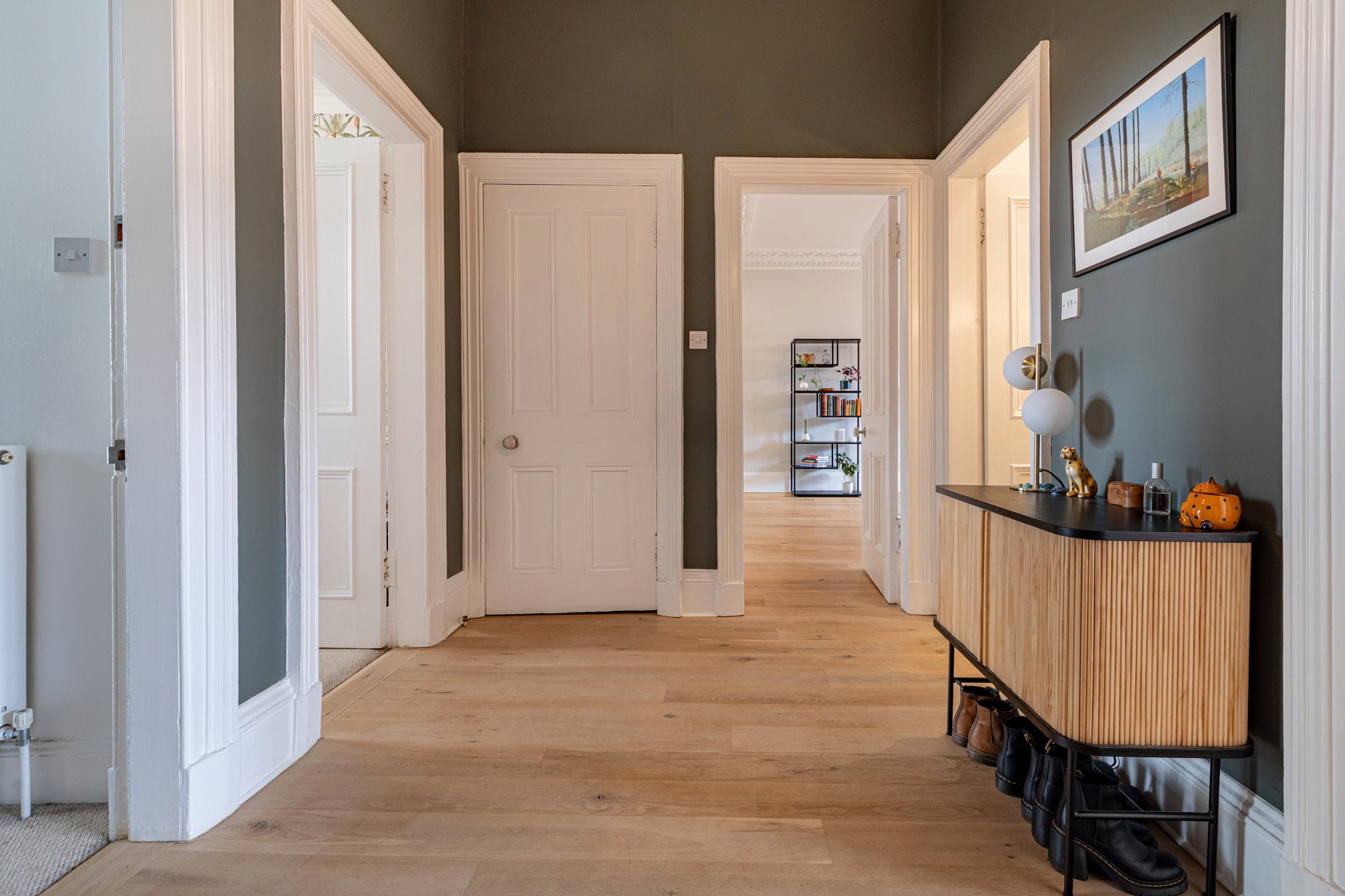 - Storm door entrance vestibule leading into broad and welcoming reception hall with engineered flooring and invaluable utility cupboard off