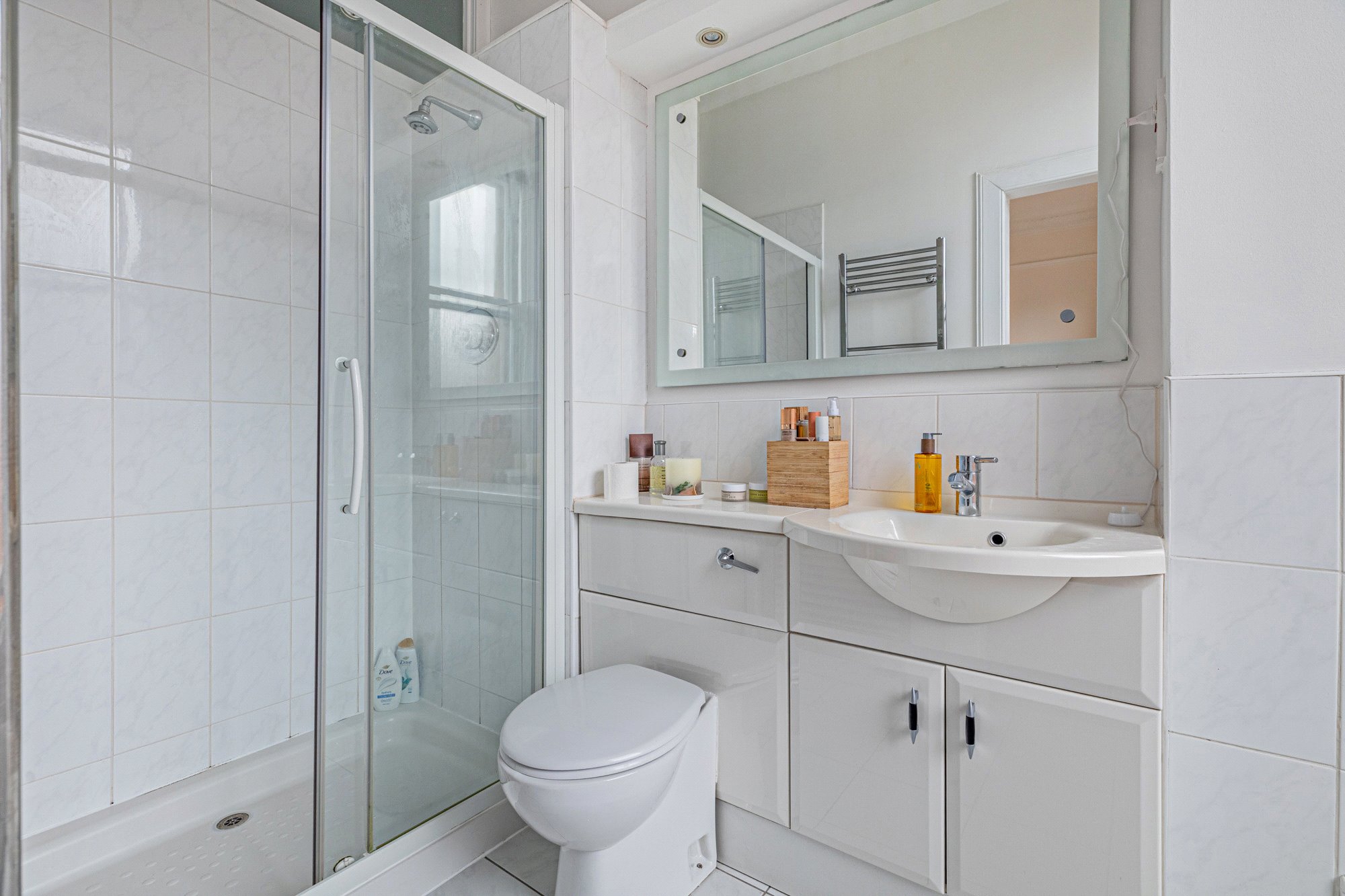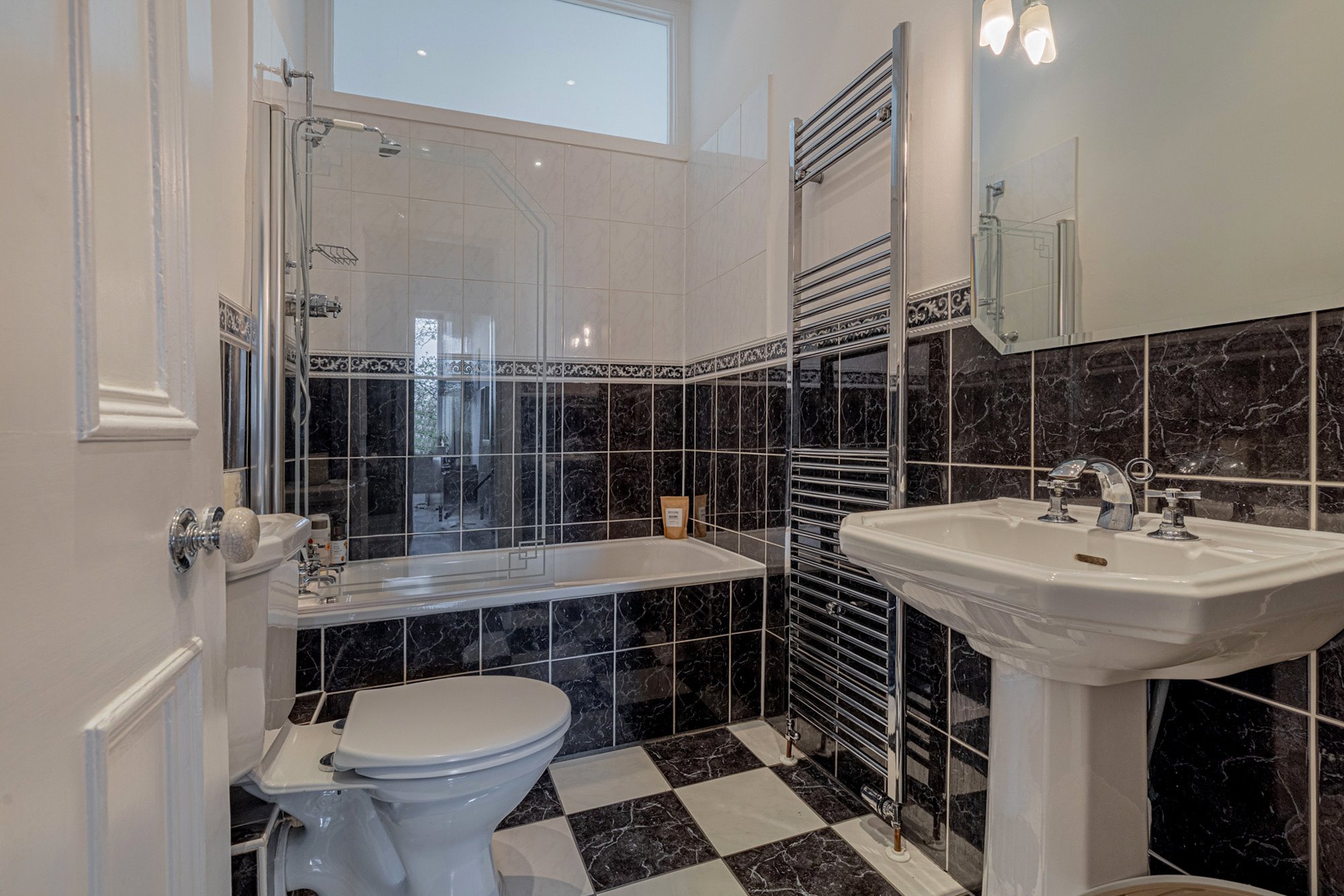- Three-piece bathroom comprising bath, over bath shower, toilet and wash hand basin