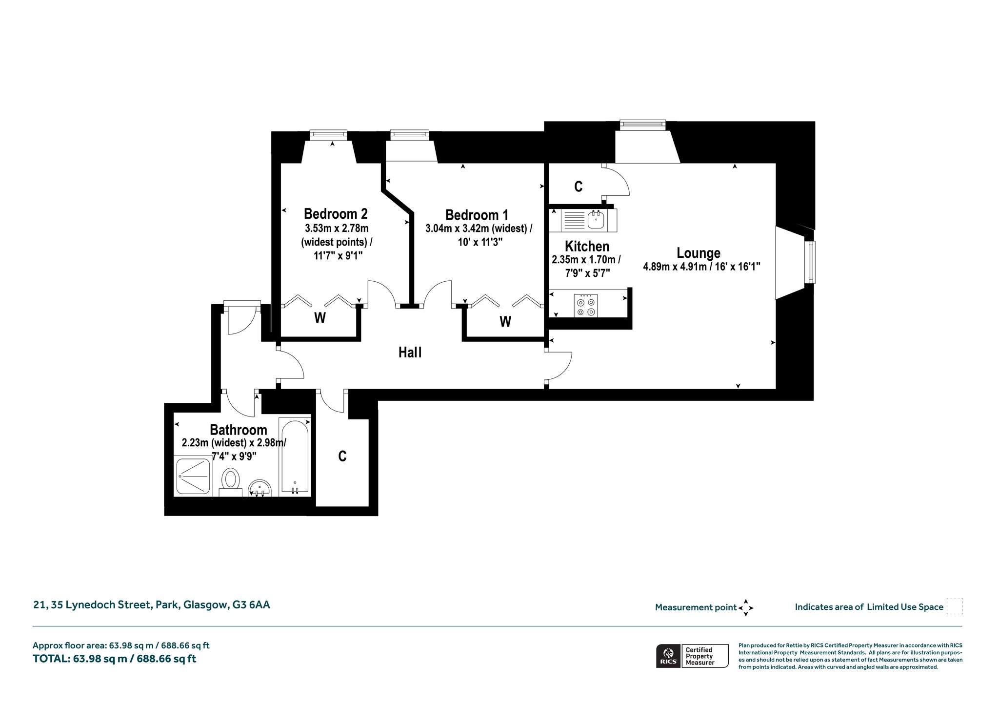The home for sale is positioned in the South-West most corner of the building, at lower ground level. As you will see from the attached photographs, HD video, floorplan and Matterport Tour – the property is presented in fresh, neutral tones throughout and the accommodation is ready to be moved into and enjoyed. In brief the accommodation extends to; entrance hall, living room which is open plan to the fitted kitchen with appliances, two double bedrooms that both have wardrobes and there is an internal bathroom with attractive tiling and white, four-piece suite.
