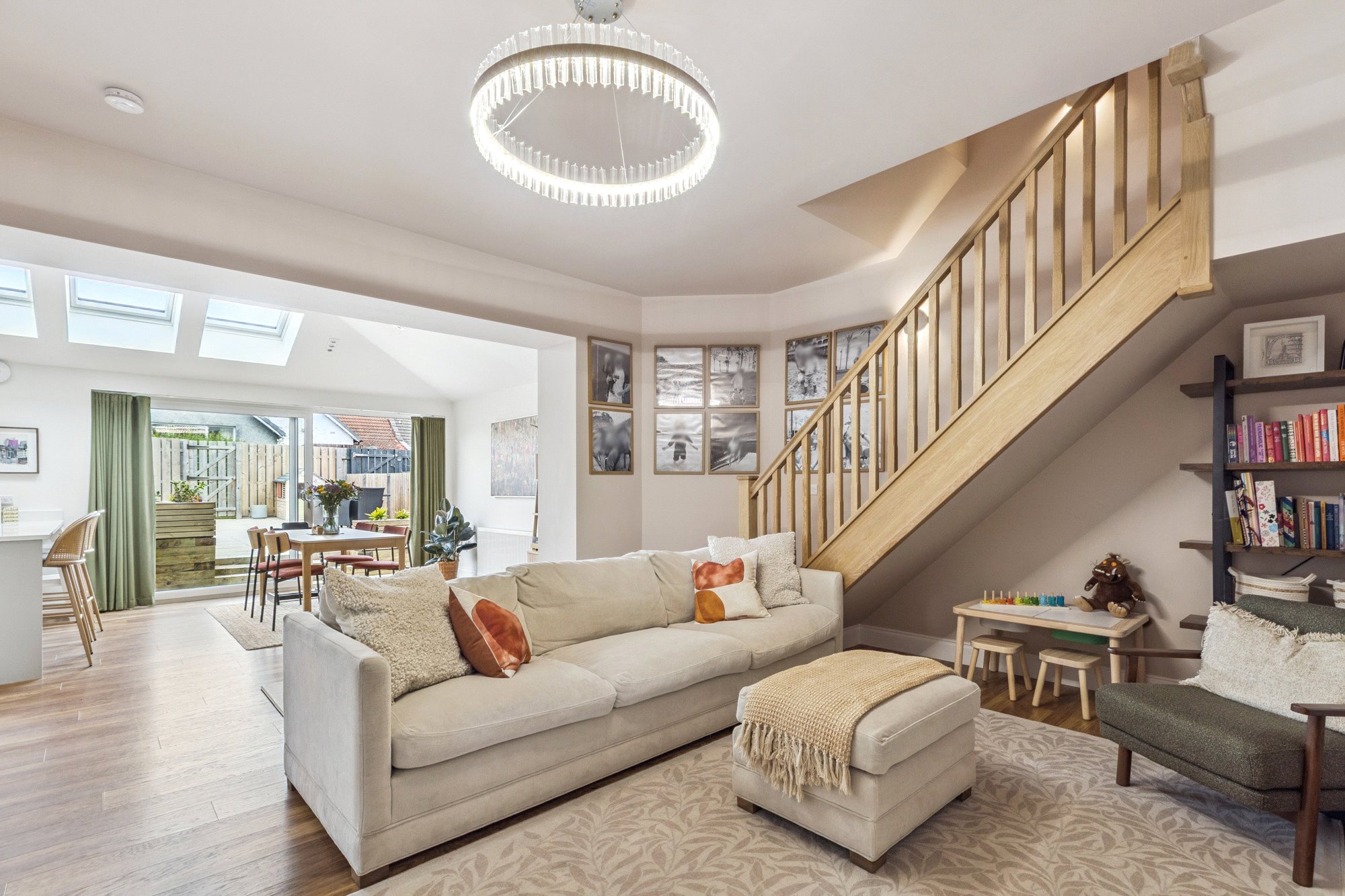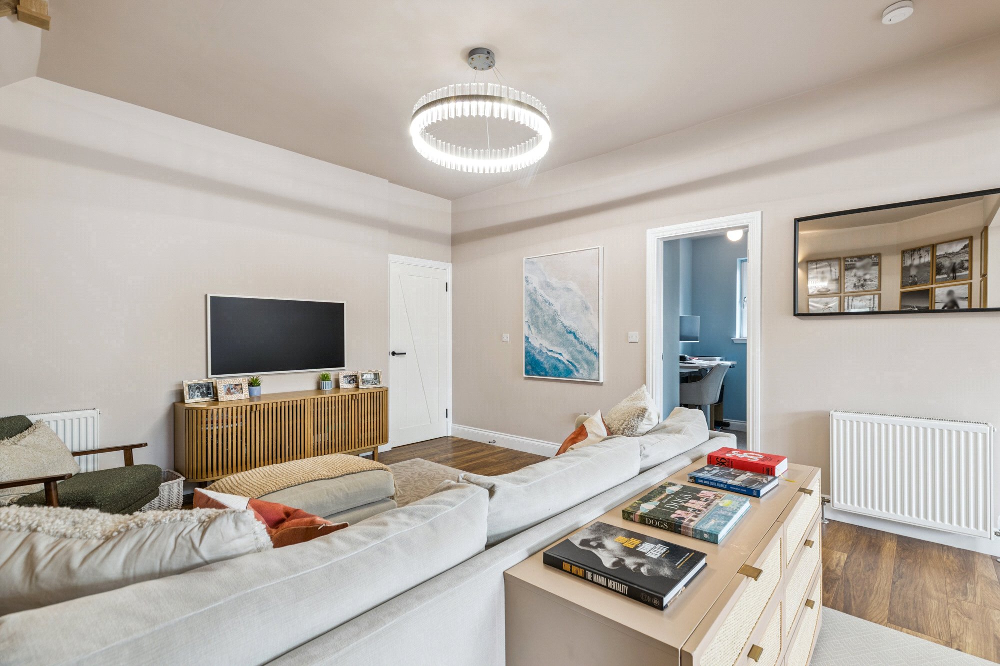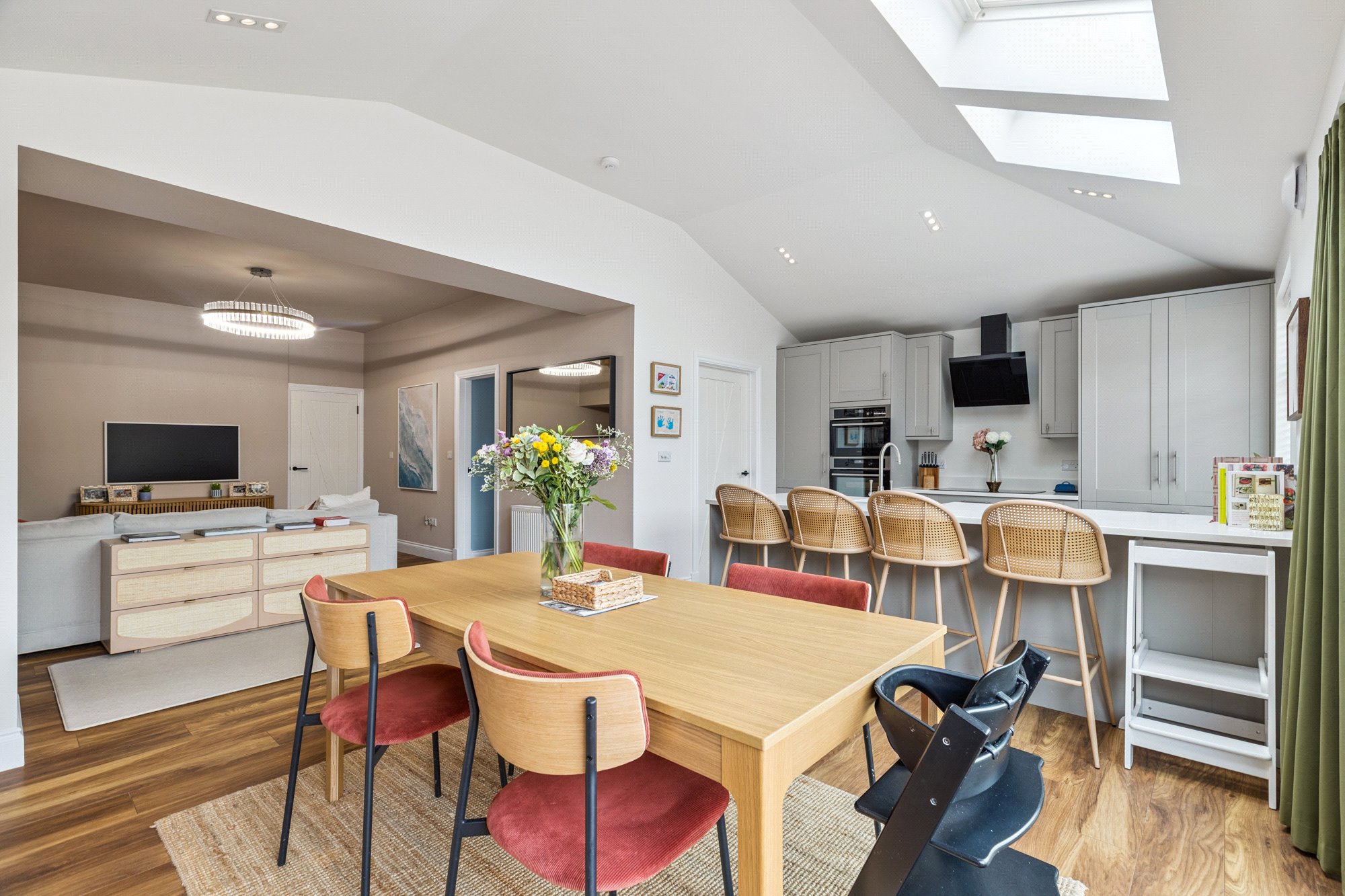 The accommodation includes a welcoming reception hallway leading into a bright and spacious main living room. To the rear, the heart of the home is undoubtedly the stunning dining kitchen—a stylish, light-filled space complete with sliding doors opening directly onto the immaculately presented rear garden. The kitchen is perfect for entertaining, while the adjoining utility room adds to the practicality of everyday living. In addition, there is an adaptable home office/study off the lounge, an ideal space from home working.