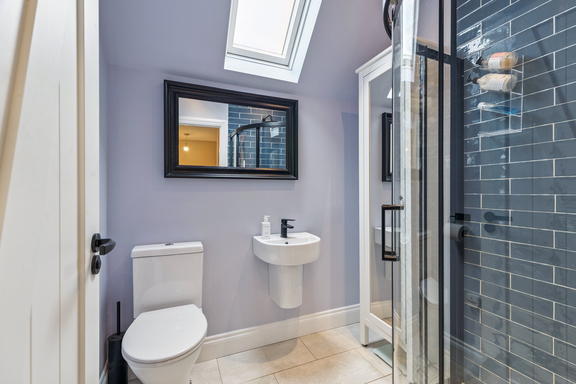 - Contemporary three-piece shower room. Velux window to the side